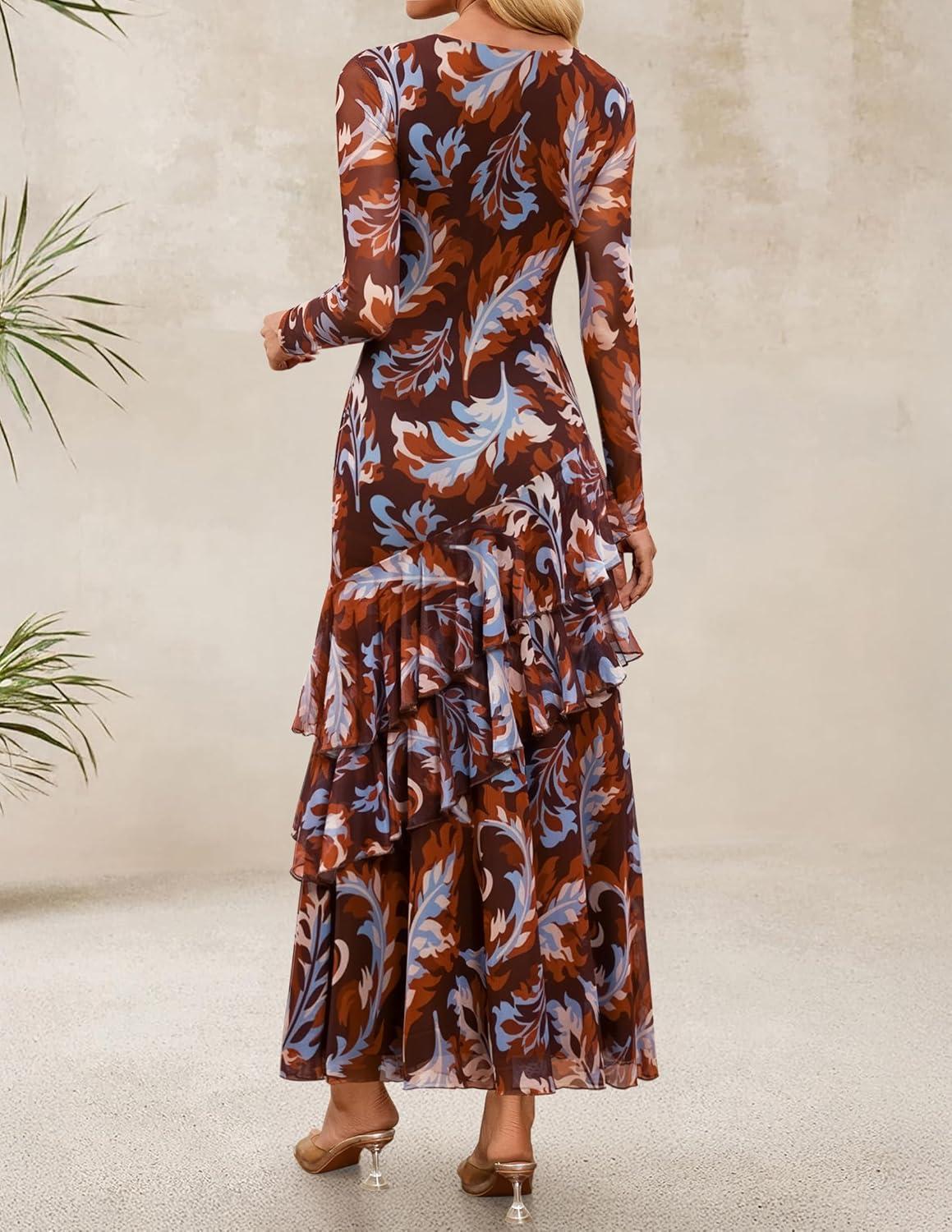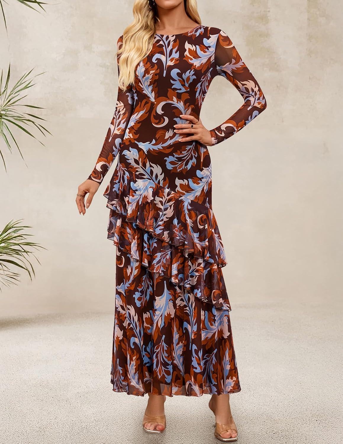ZESICA Women’s Fall Floral Wedding Guest Bodycon Dresses 2025 Long Sleeve Crewneck Mesh Ruffle Mermaid Party Maxi Dress(Brown)