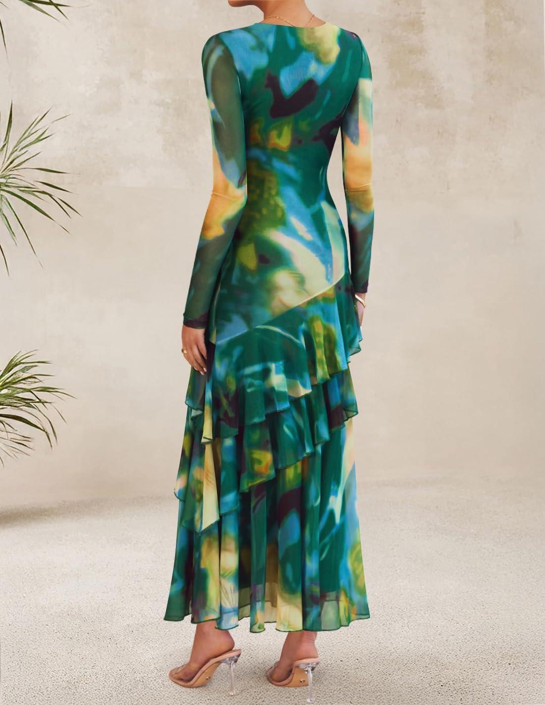 ZESICA Women’s Fall Floral Wedding Guest Bodycon Dresses 2025 Long Sleeve Crewneck Mesh Ruffle Mermaid Party Maxi Dress(Green)