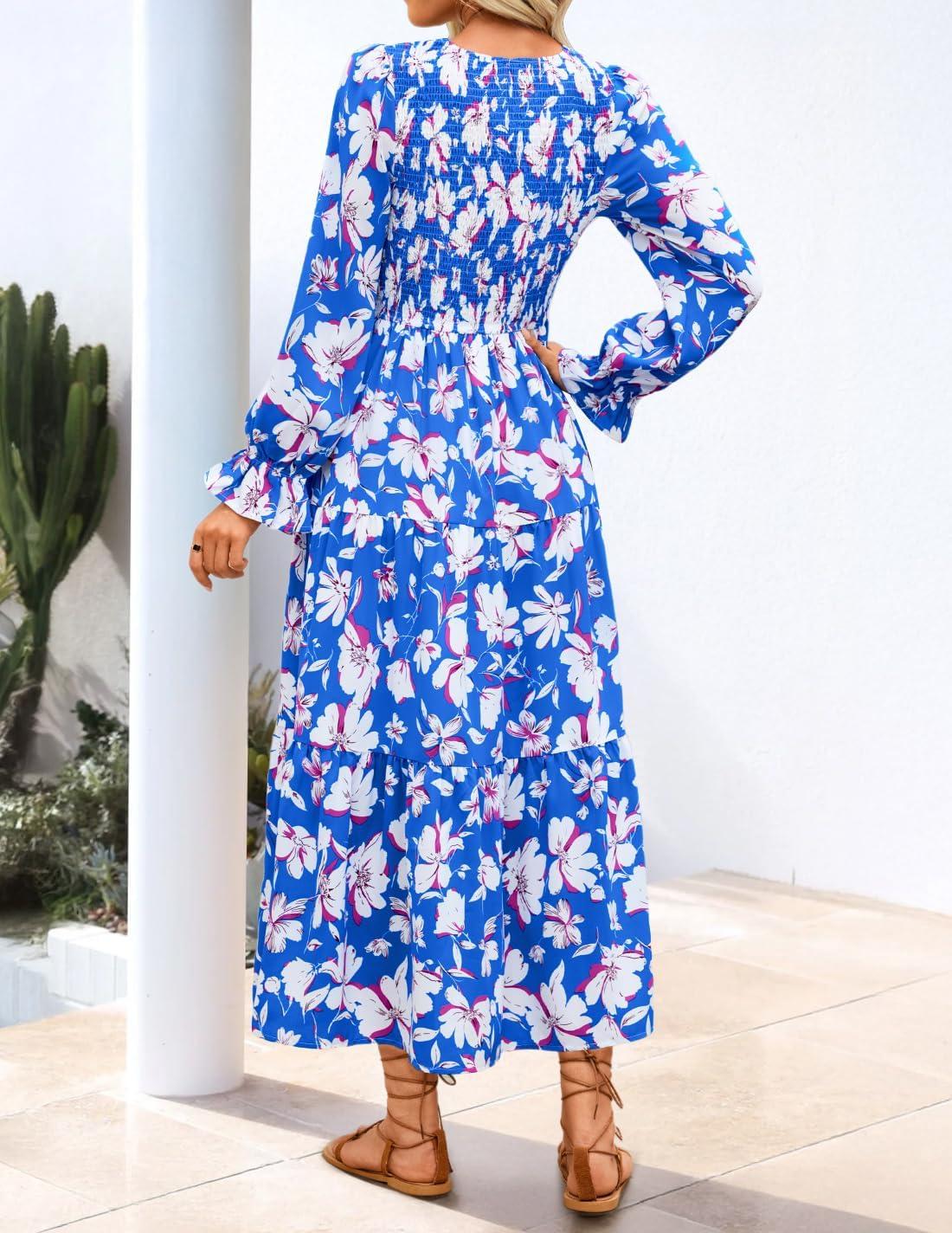 ZESICA Women's Fall Long Sleeve Floral Boho Dress 2025 Casual V Neck A-Line Flowy Wedding Guest Maxi Dresses(Royal Blue)