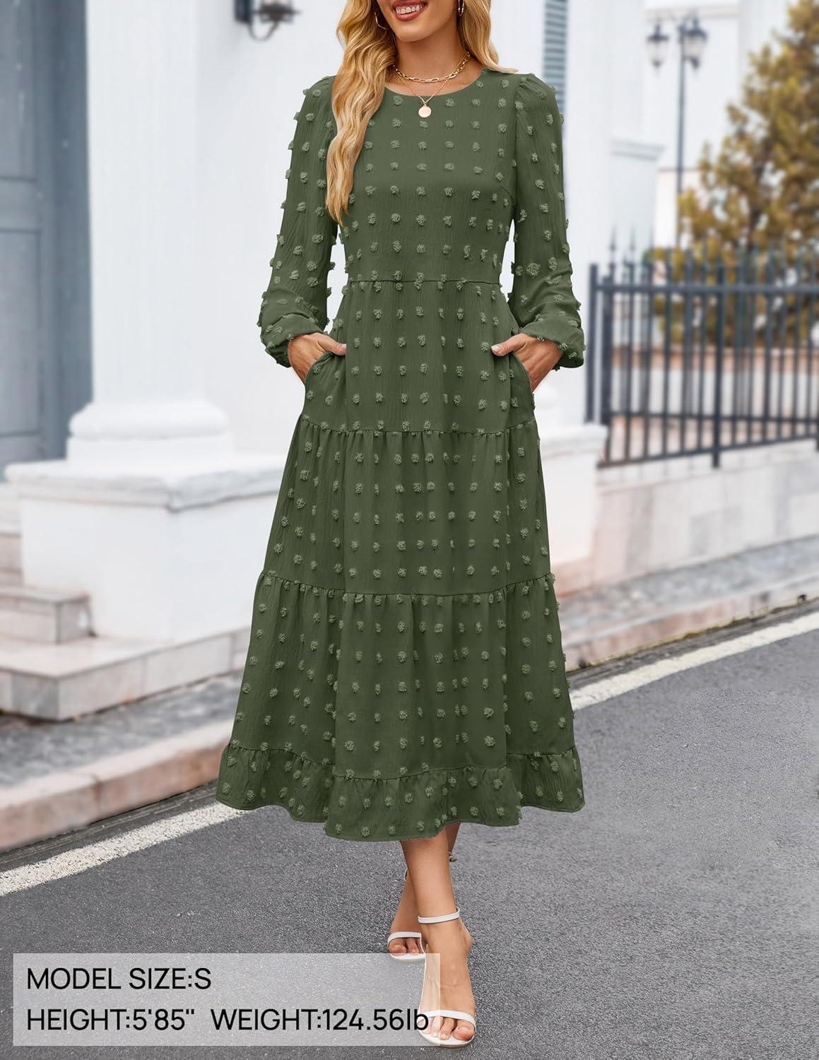 ZESICA Women’s Fall Long Sleeve Maxi Dresses 2025 Crew Neck Swiss Dot Tiered Flowy A Line Casual Boho Party Dress(Army Green)