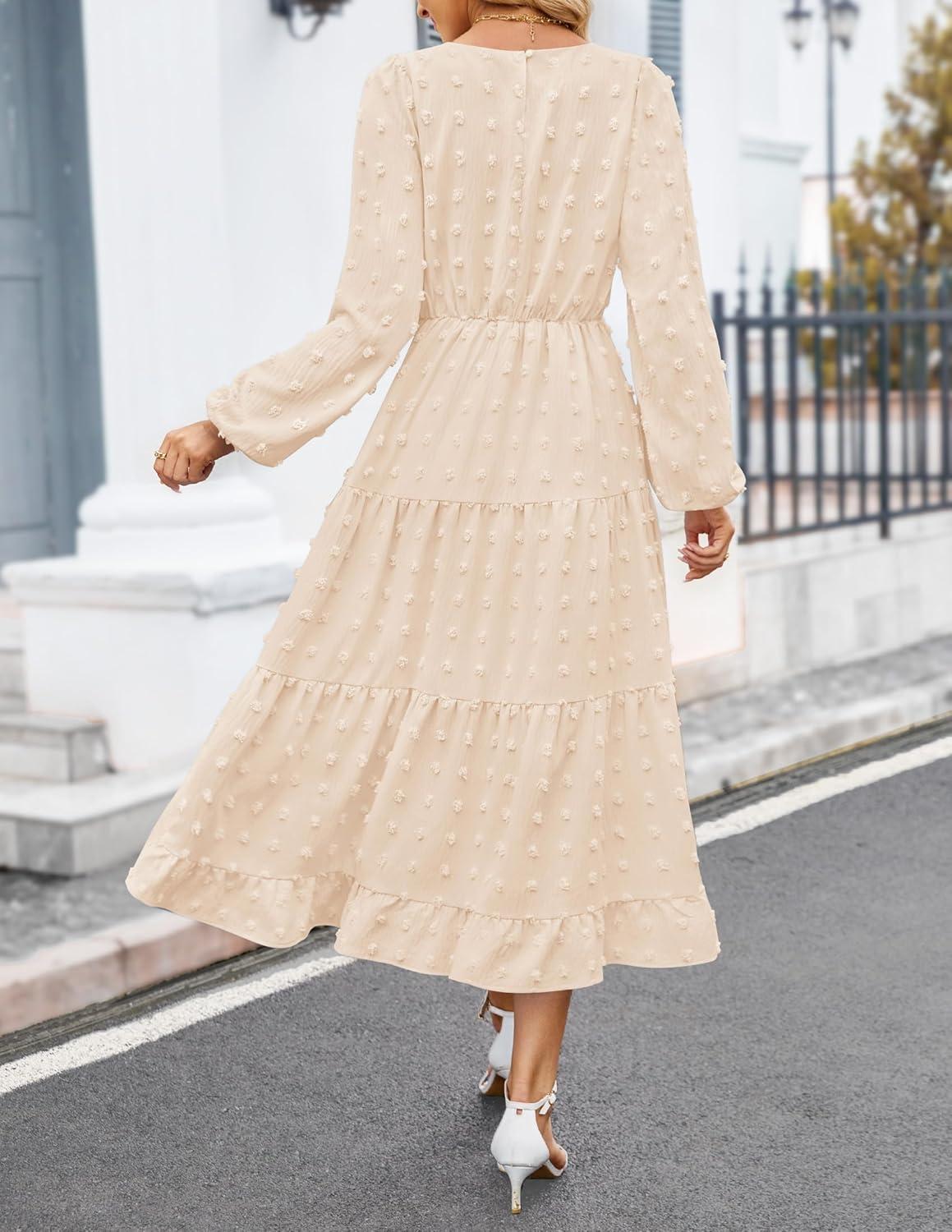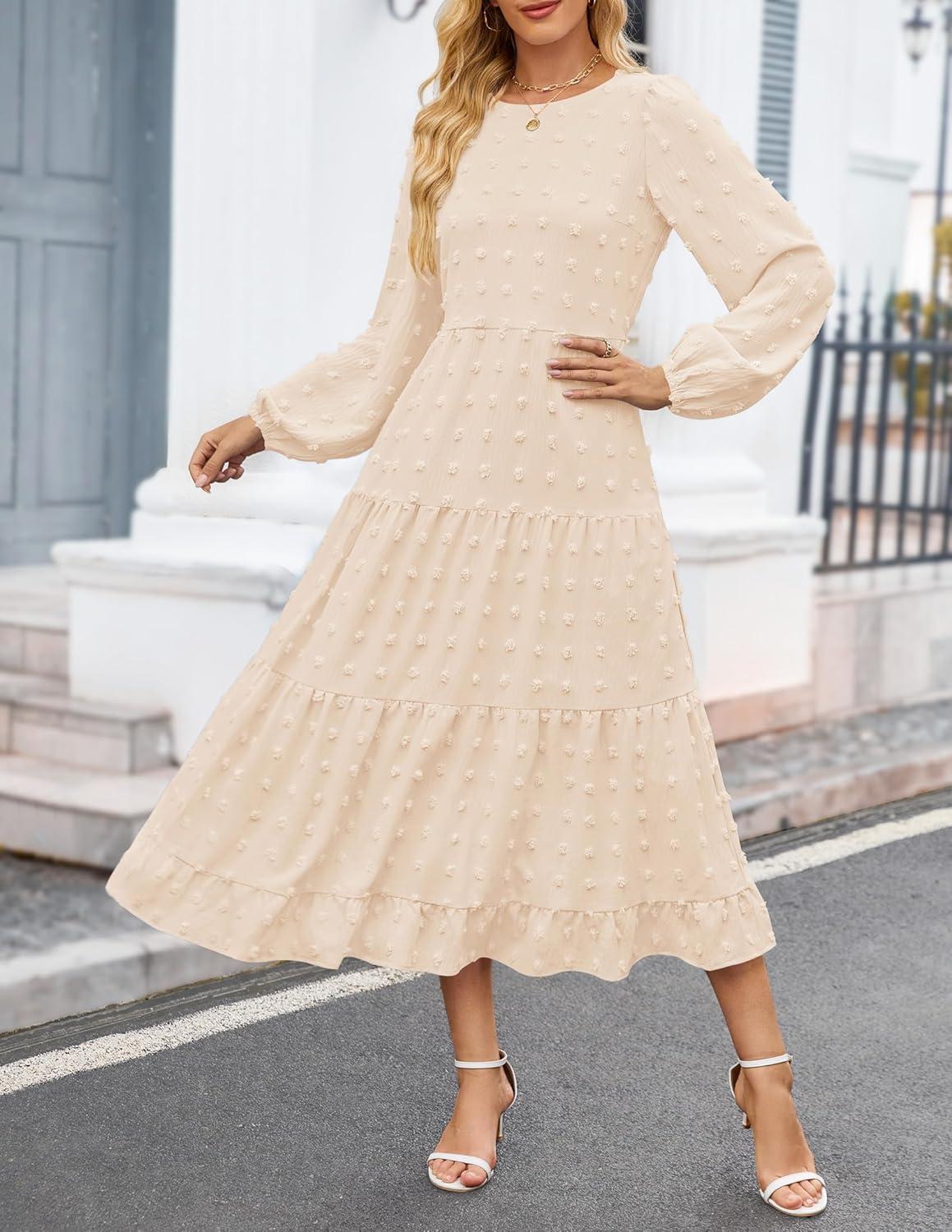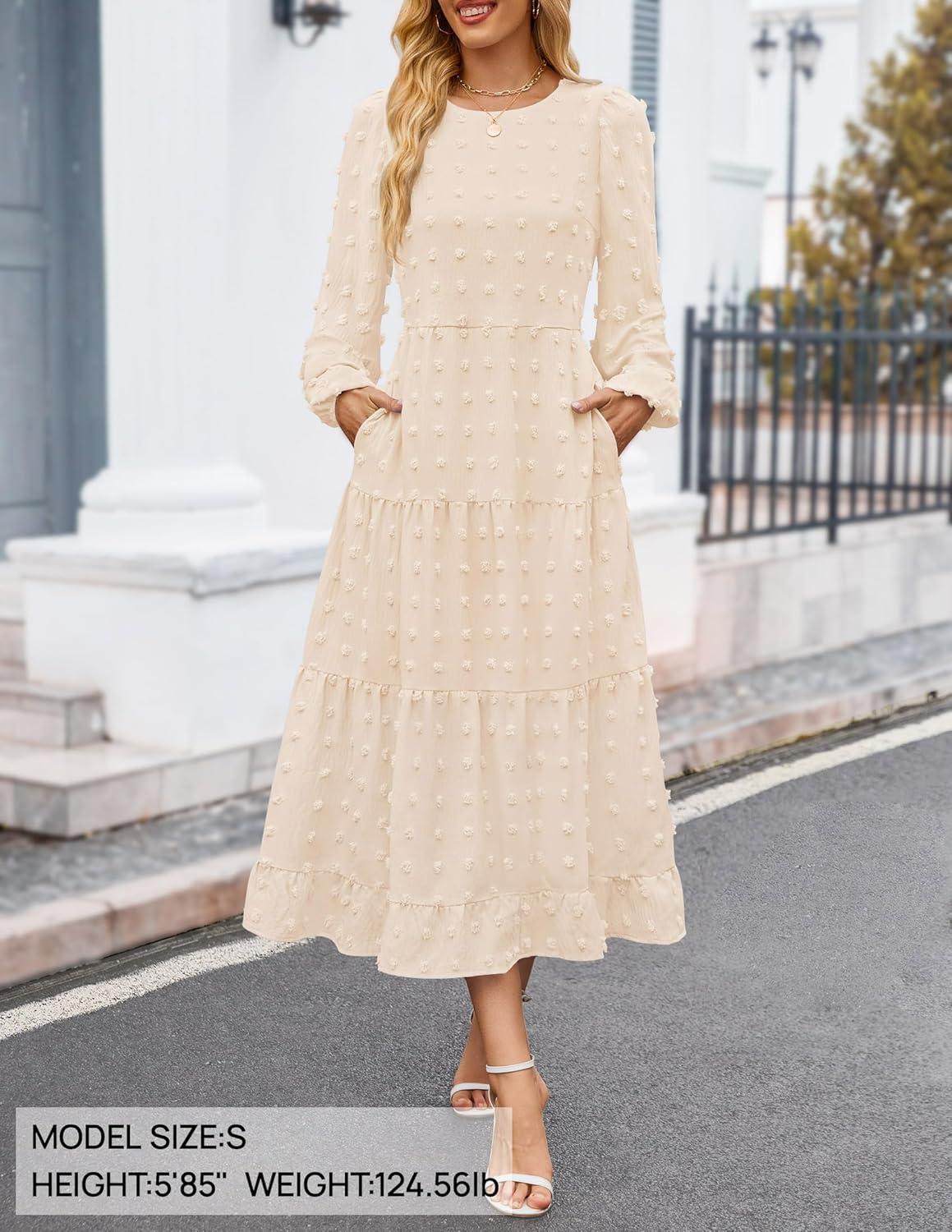ZESICA Women’s Fall Long Sleeve Maxi Dresses 2025 Crew Neck Swiss Dot Tiered Flowy A Line Casual Boho Party Dress(Beige)