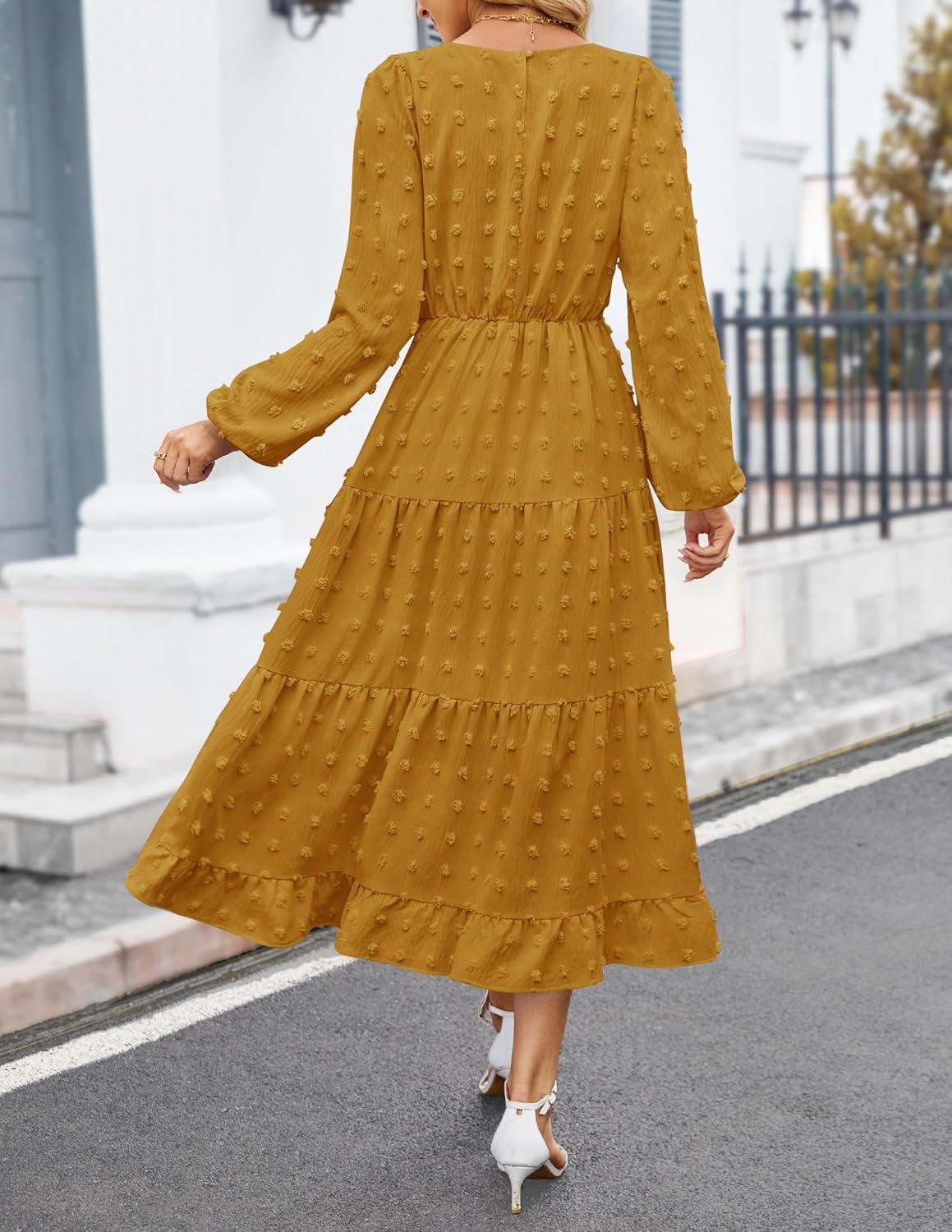 ZESICA Women's Fall Long Sleeve Maxi Dresses 2025 Crew Neck Swiss Dot Tiered Flowy A Line Casual Boho Party Dress(Mustard)