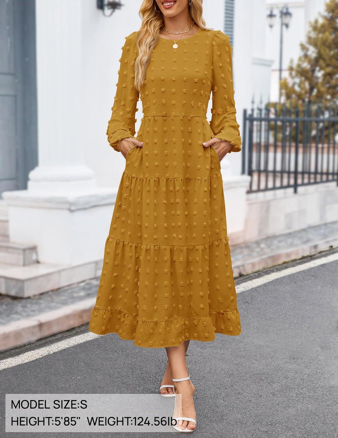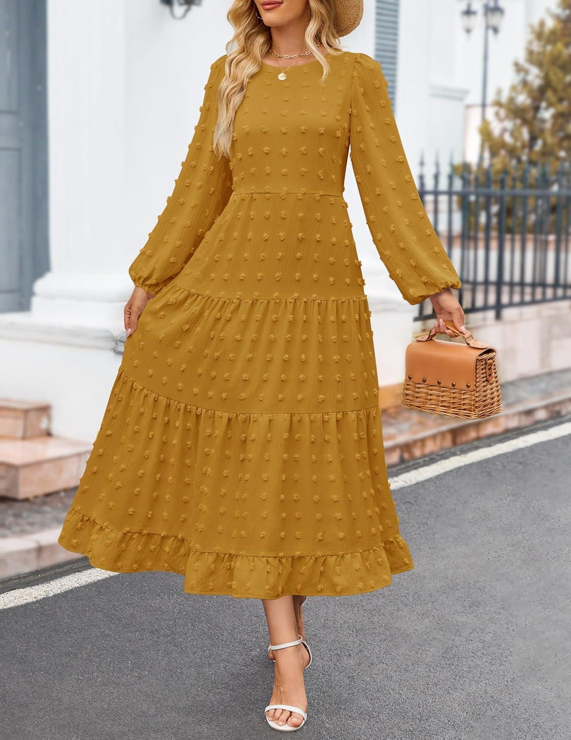 ZESICA Women’s Fall Long Sleeve Maxi Dresses 2025 Crew Neck Swiss Dot Tiered Flowy A Line Casual Boho Party Dress(Mustard)