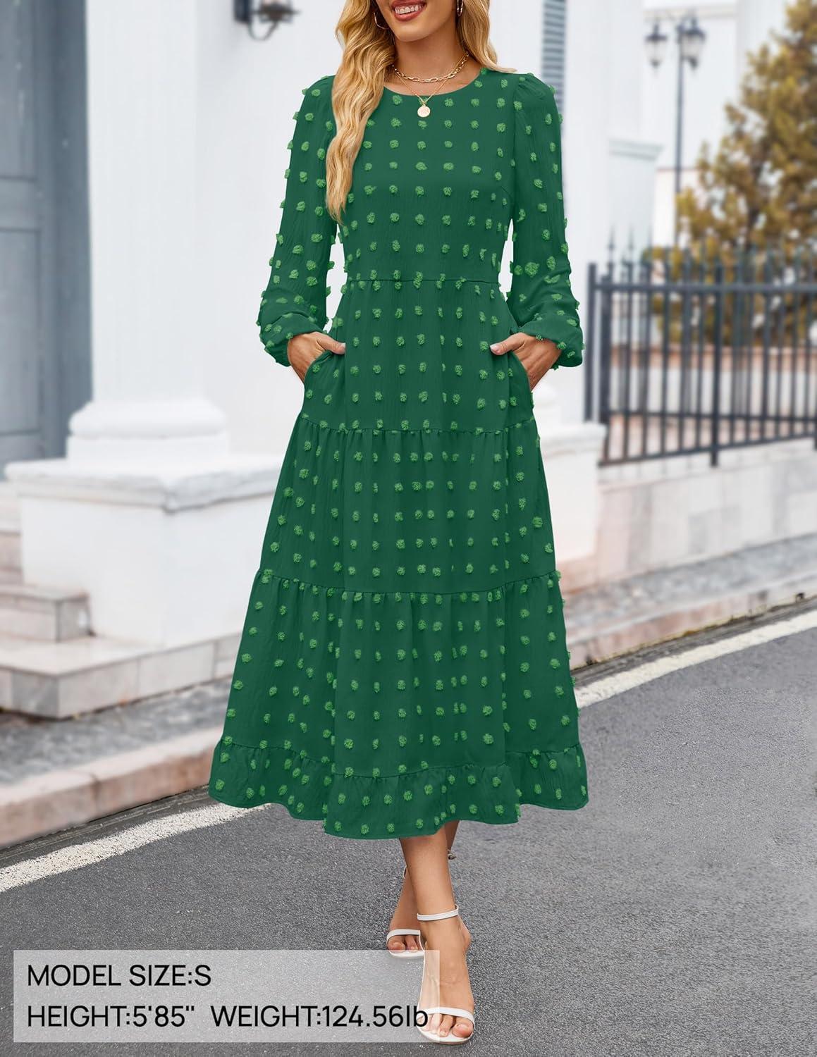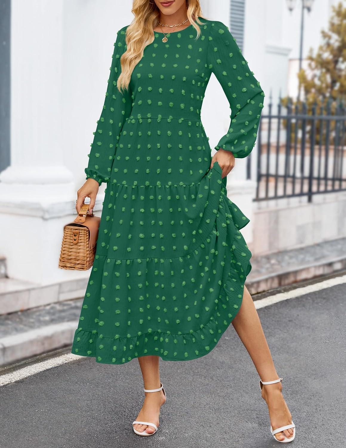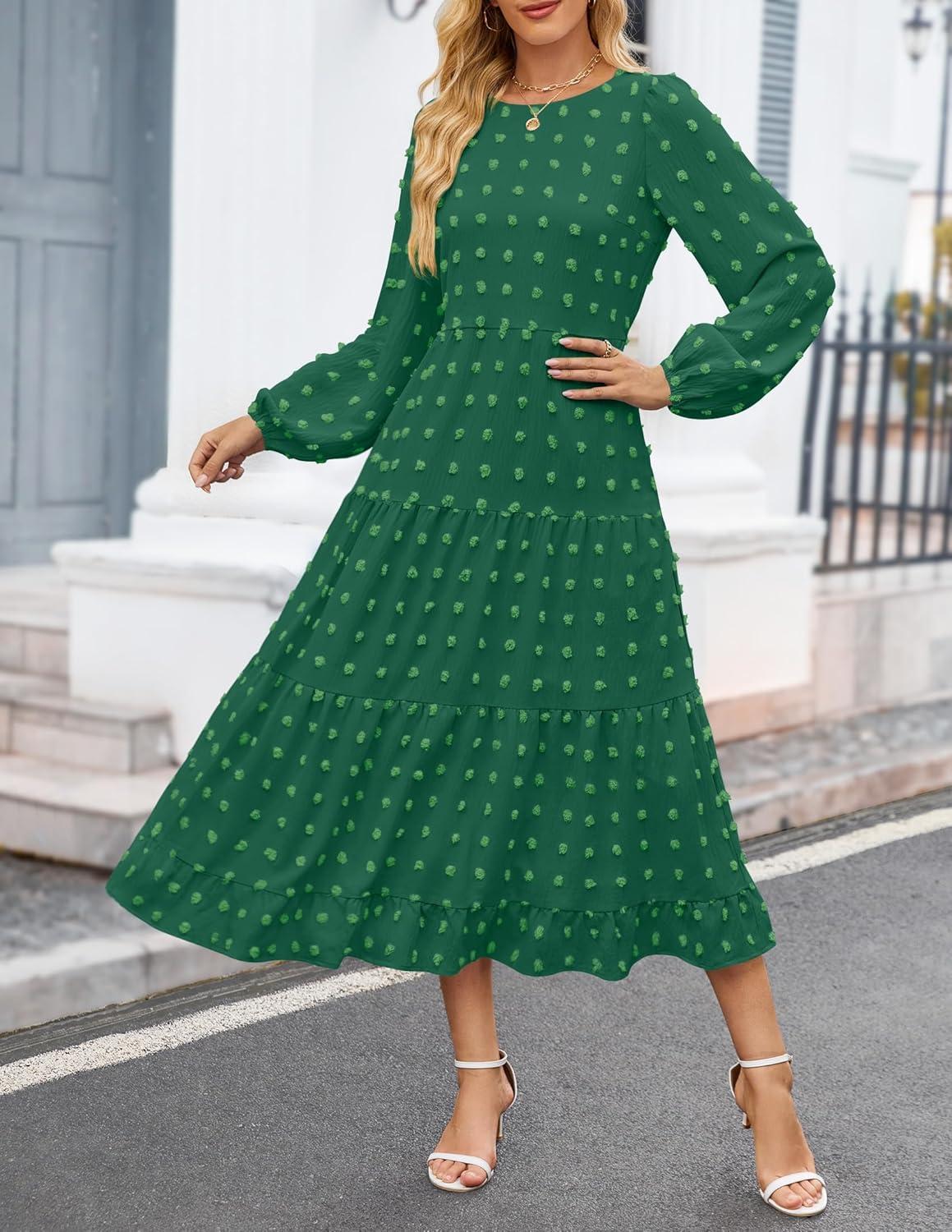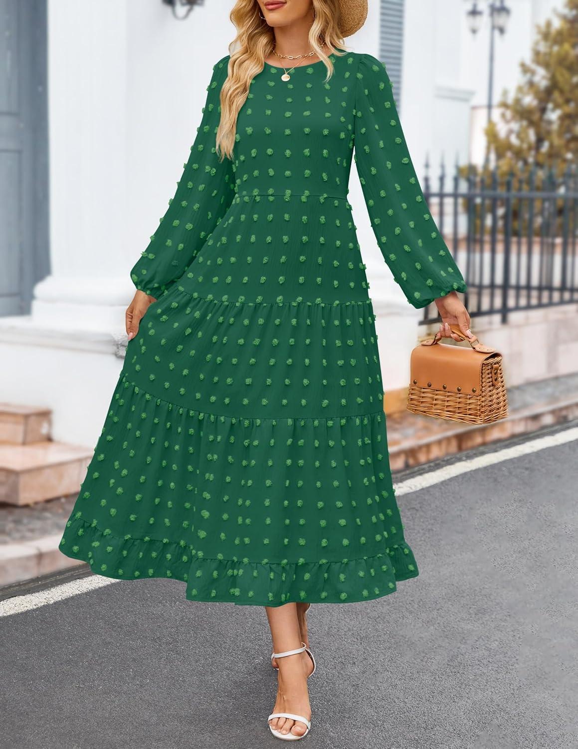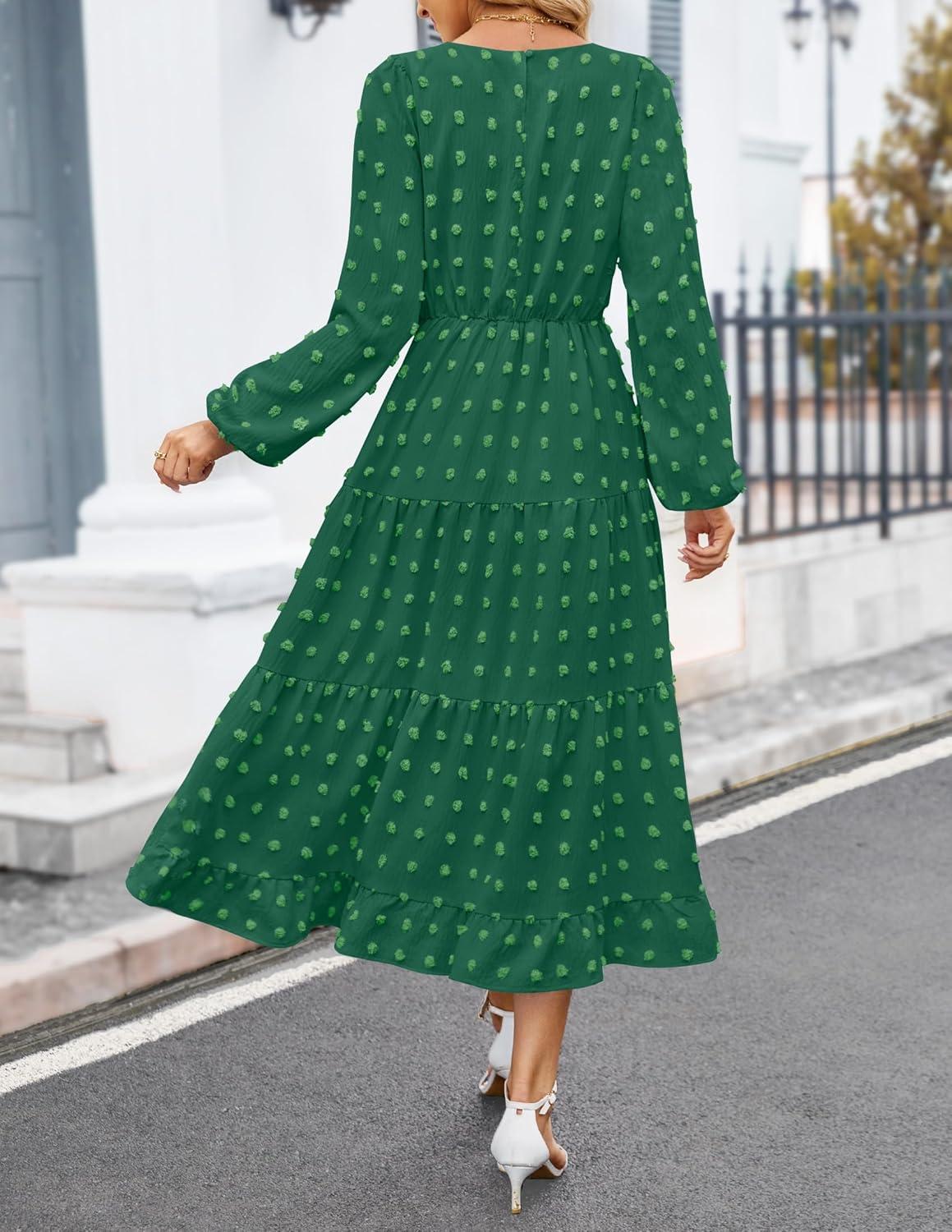 ZESICA Women’s Fall Long Sleeve Maxi Dresses 2025 Crew Neck Swiss Dot Tiered Flowy A Line Wedding Cocktail Party Dress(Green)