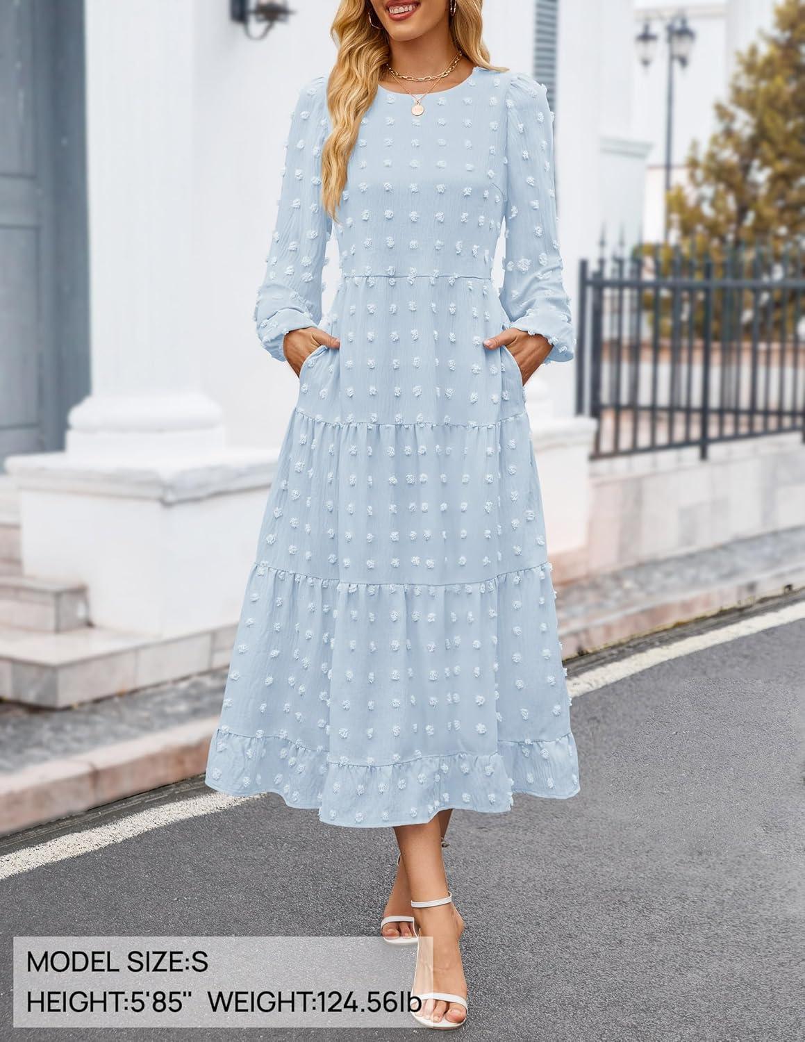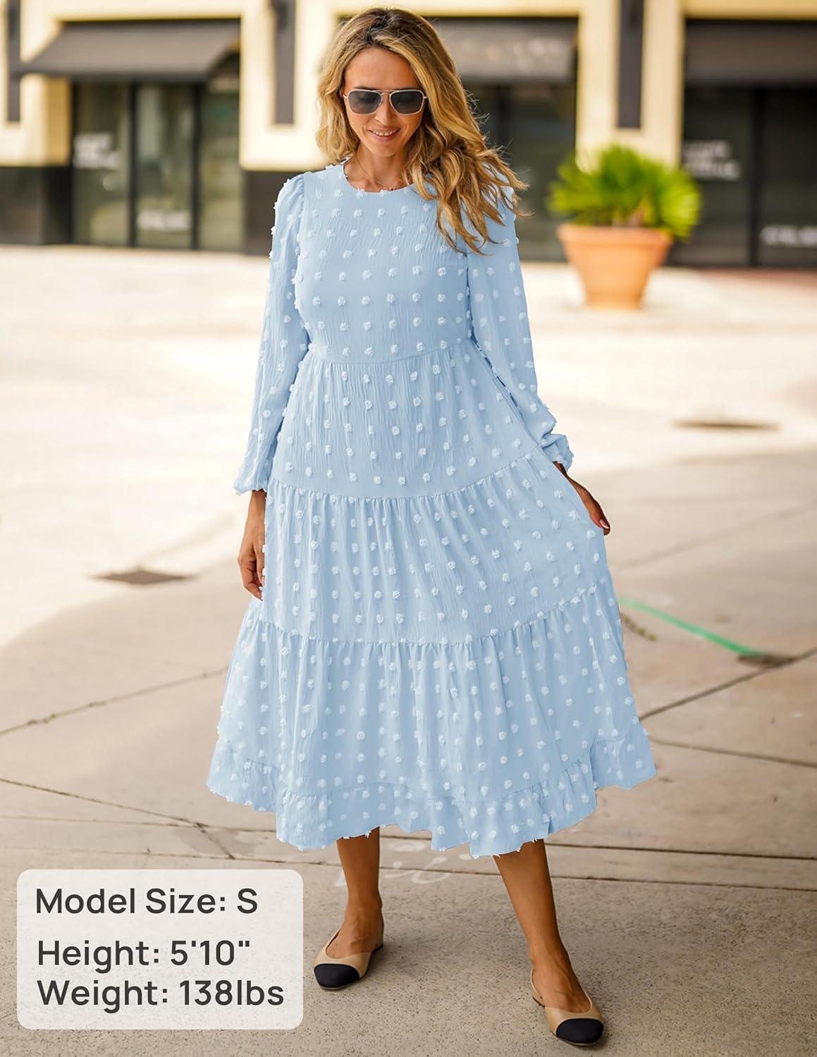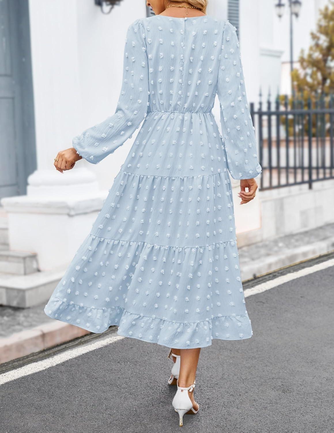 ZESICA Women’s Fall Long Sleeve Maxi Dresses 2025 Crew Neck Swiss Dot Tiered Flowy A Line Wedding Cocktail Party Dress(Light Blue)