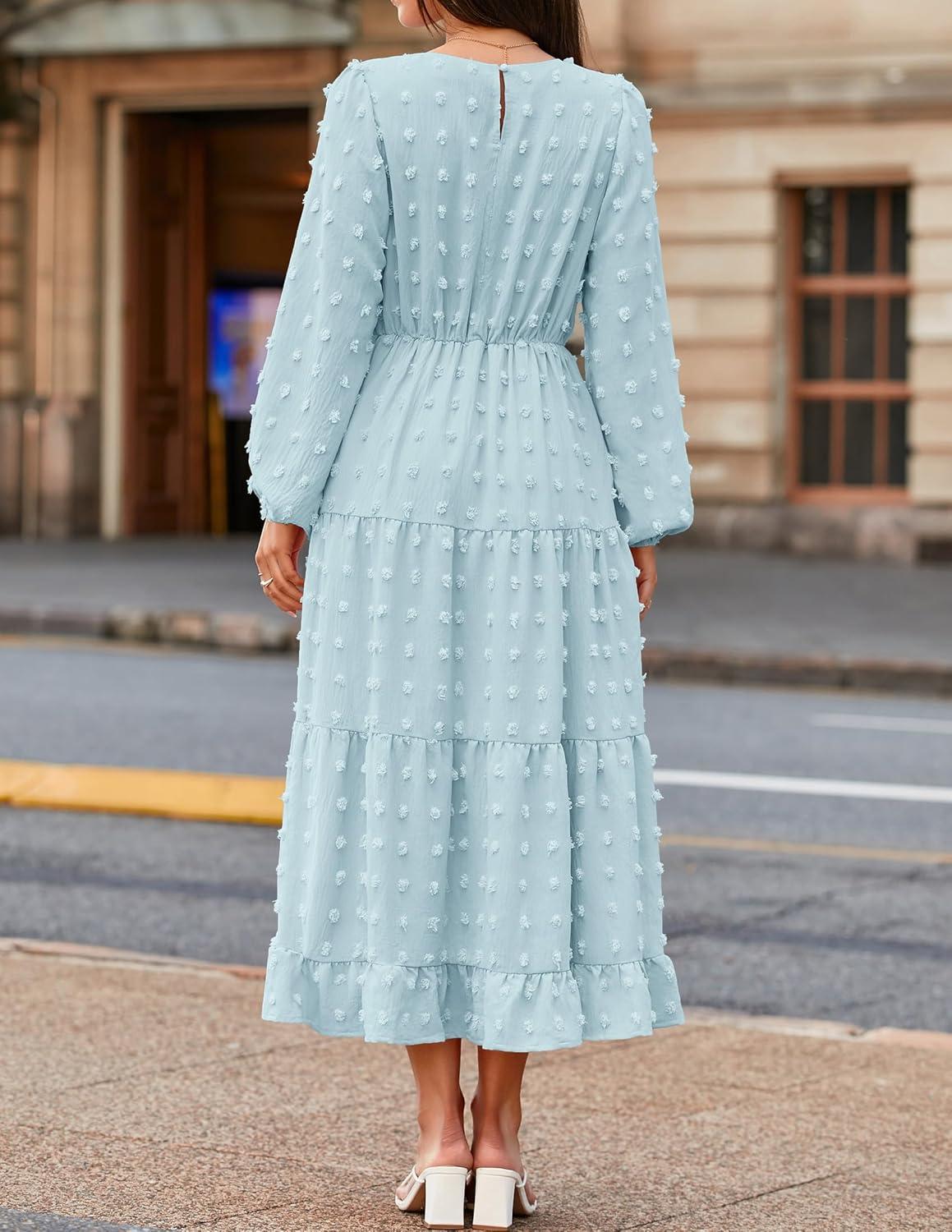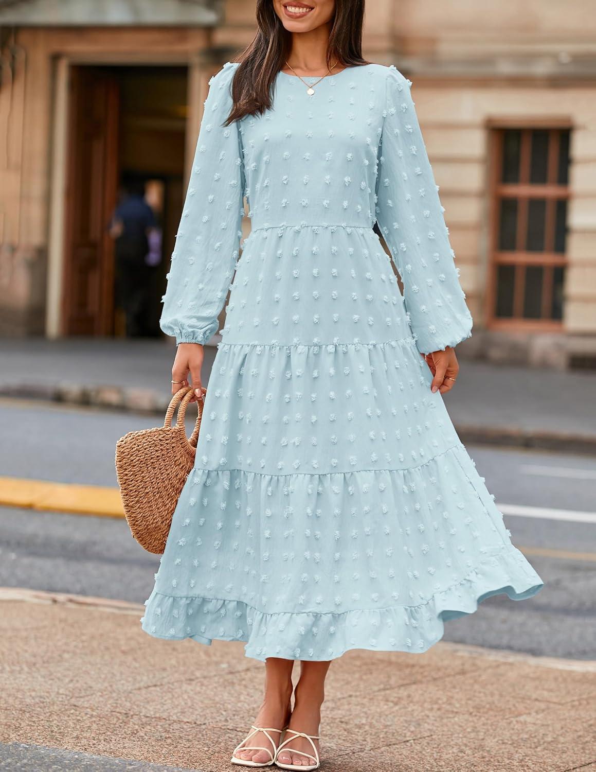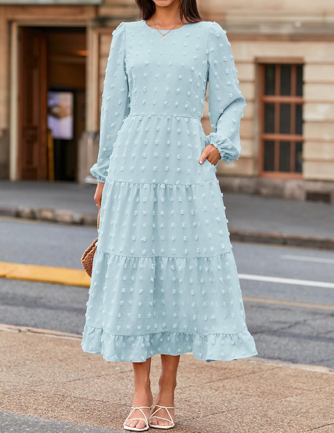 ZESICA Women’s Fall Long Sleeve Maxi Dresses 2025 Crew Neck Swiss Dot Tiered Flowy A Line Wedding Cocktail Party Dress(Sky)
