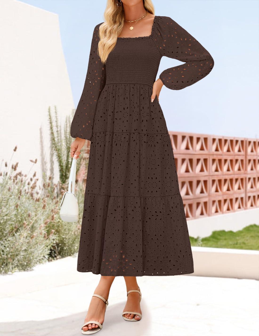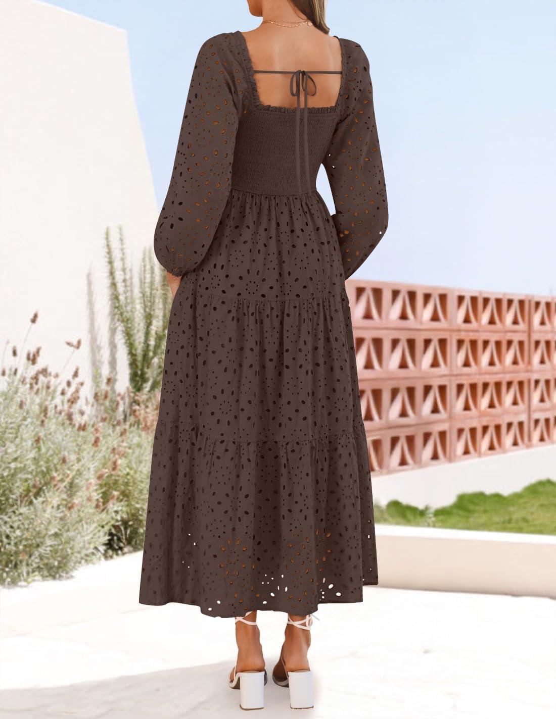 ZESICA Women’s Fall Long Sleeve Maxi Dresses 2025 Square Neck Hollow Out Eyelet Smocked A Line Boho Wedding Guset Dress(Coffee)