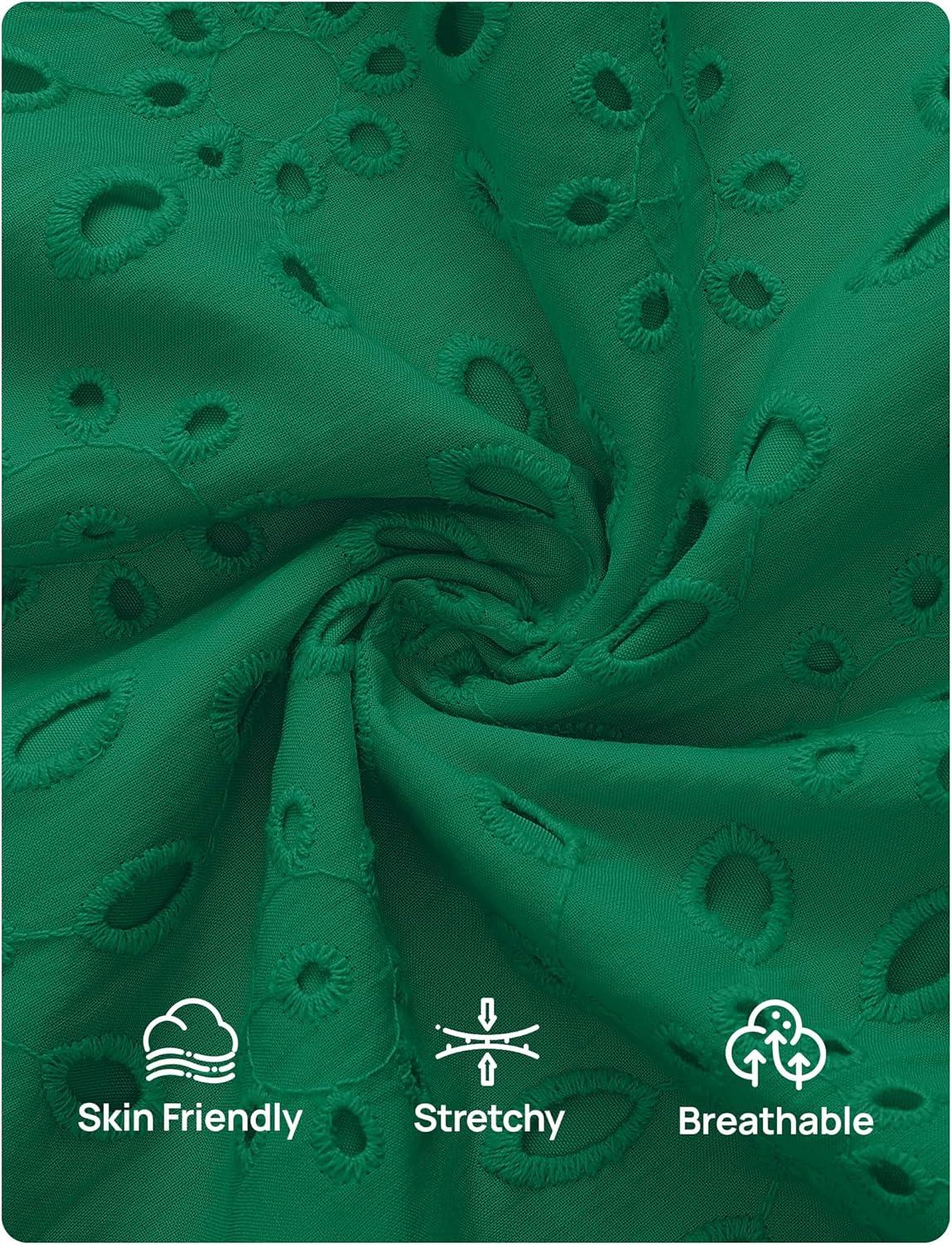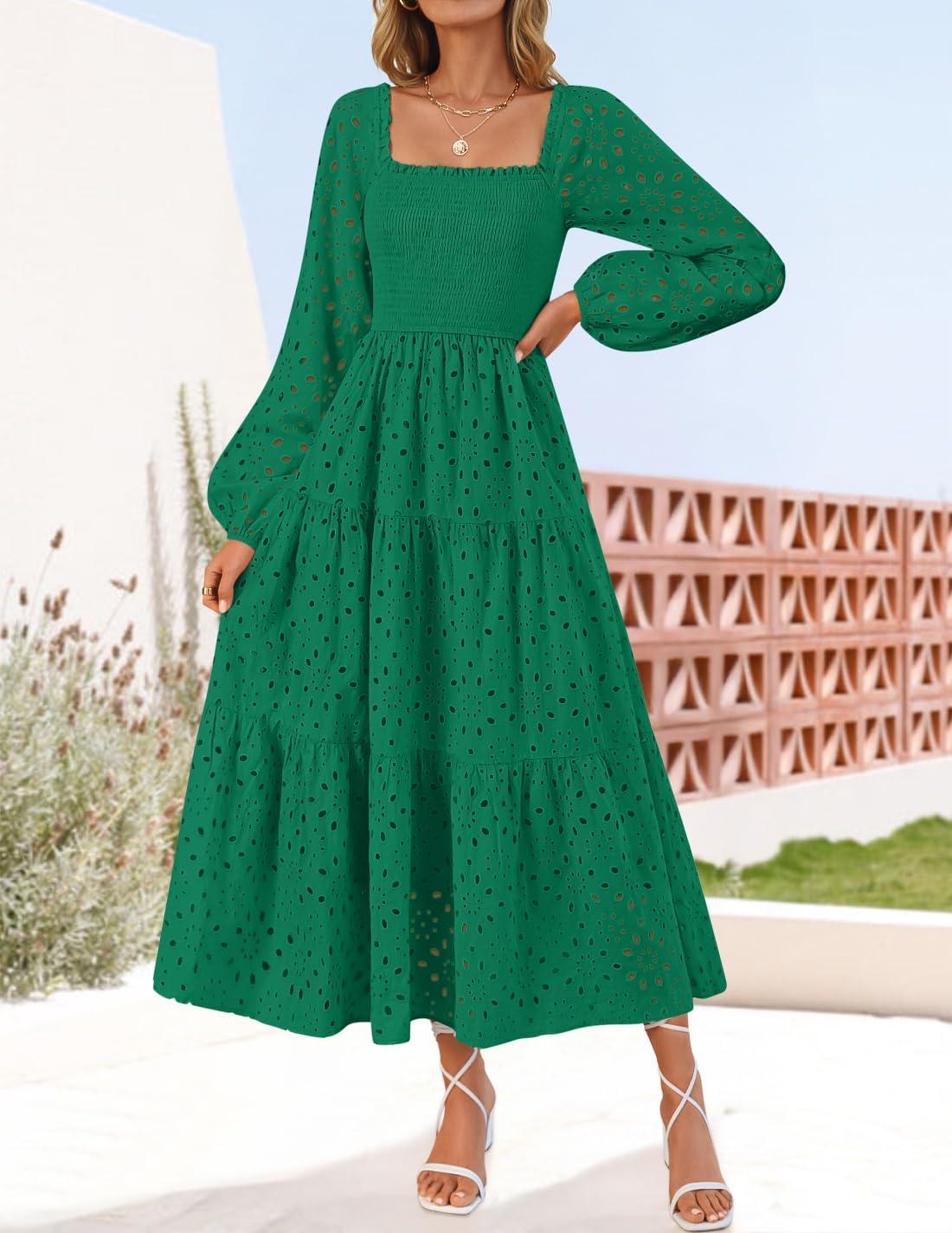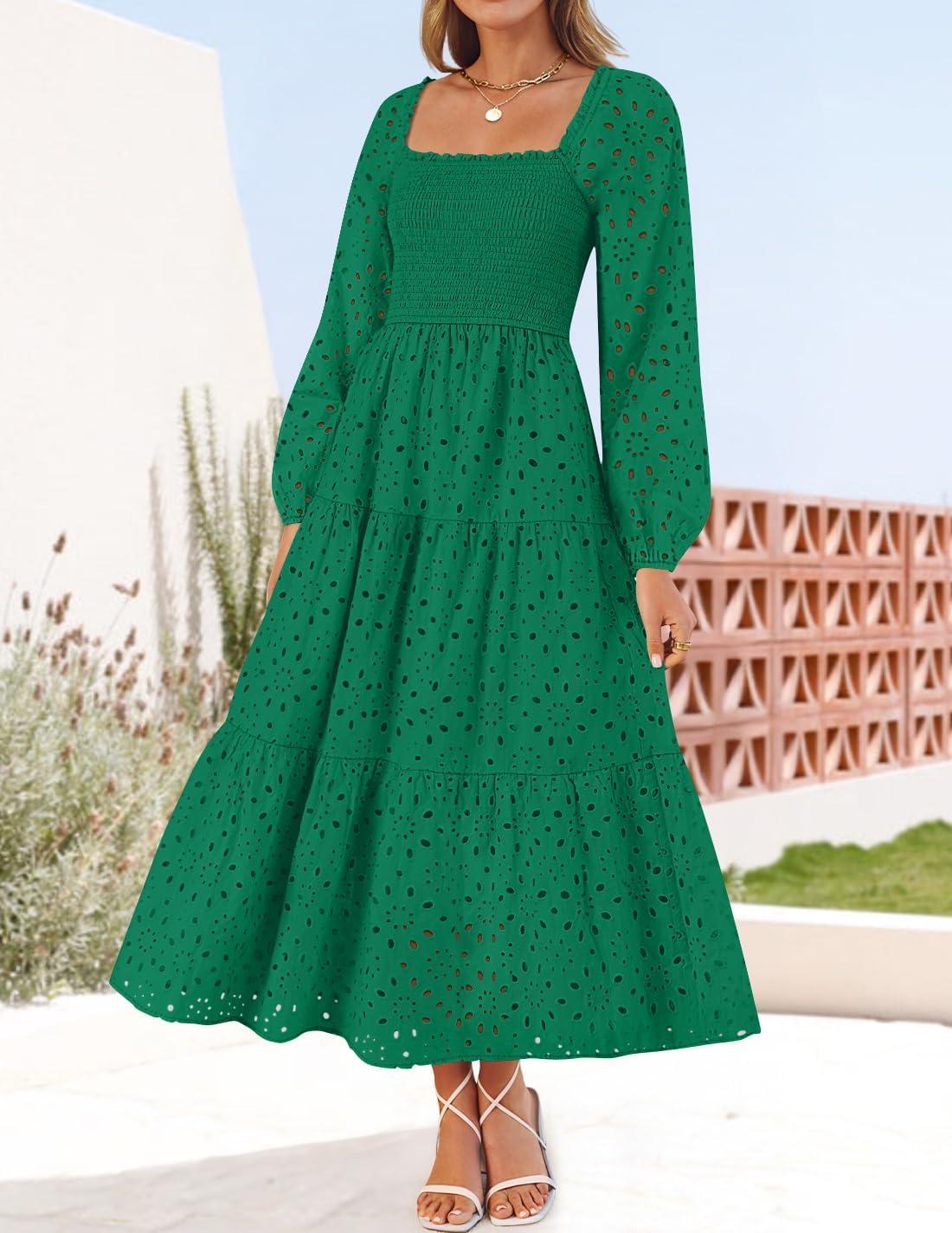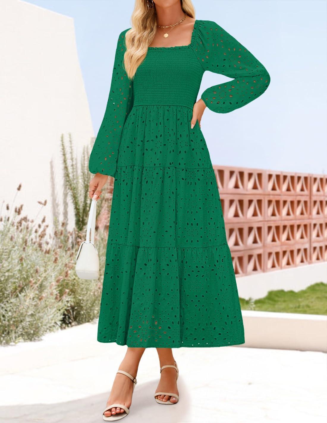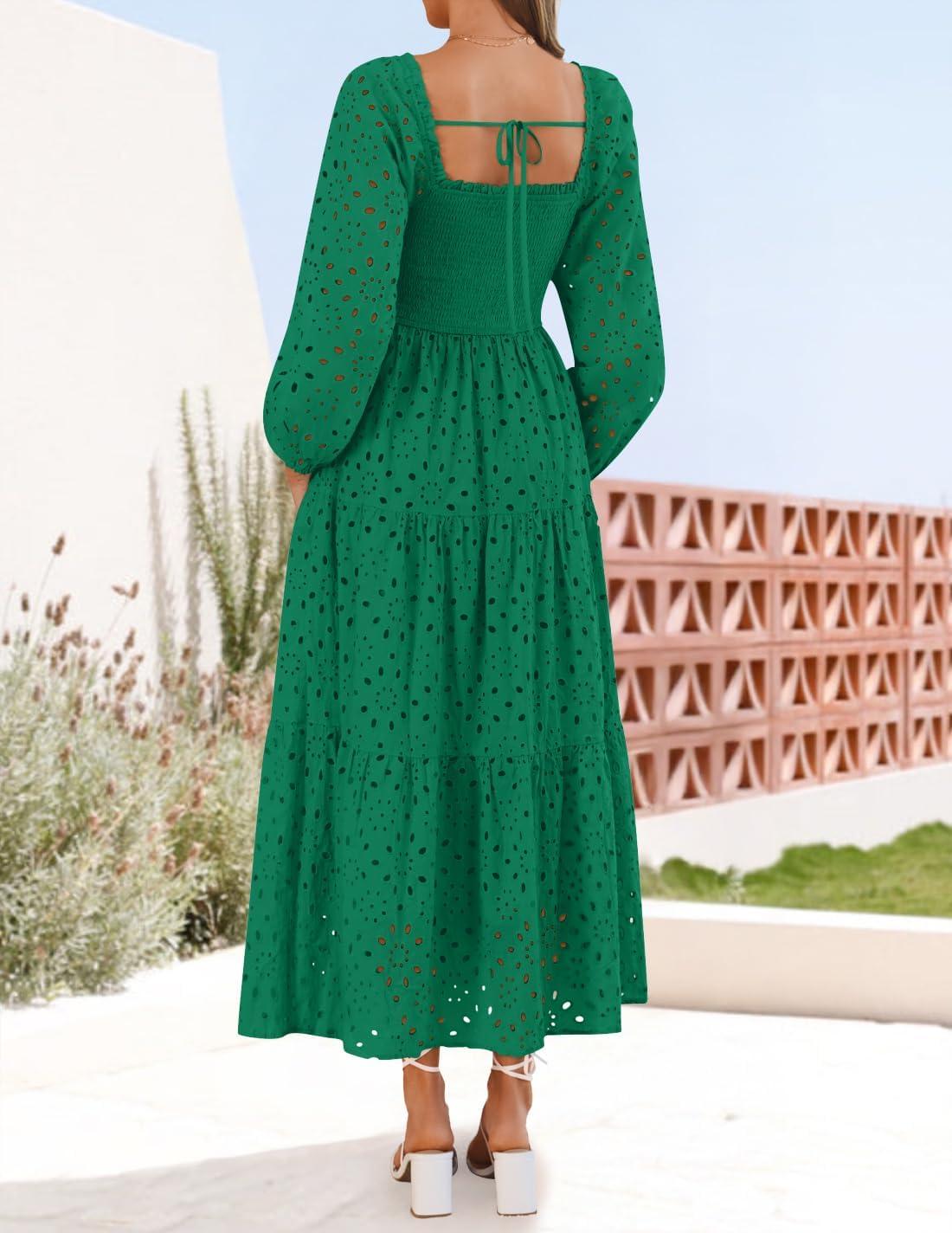 ZESICA Women’s Fall Long Sleeve Maxi Dresses 2025 Square Neck Hollow Out Eyelet Smocked A Line Boho Wedding Guset Dress(Green)