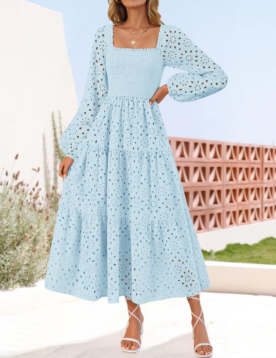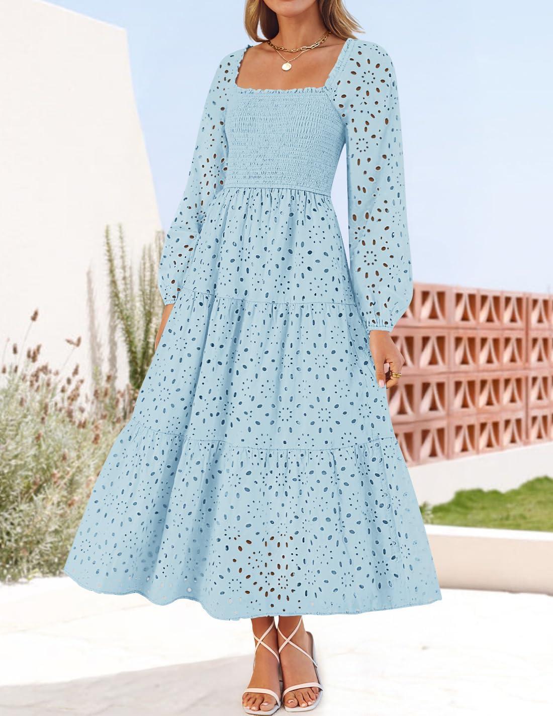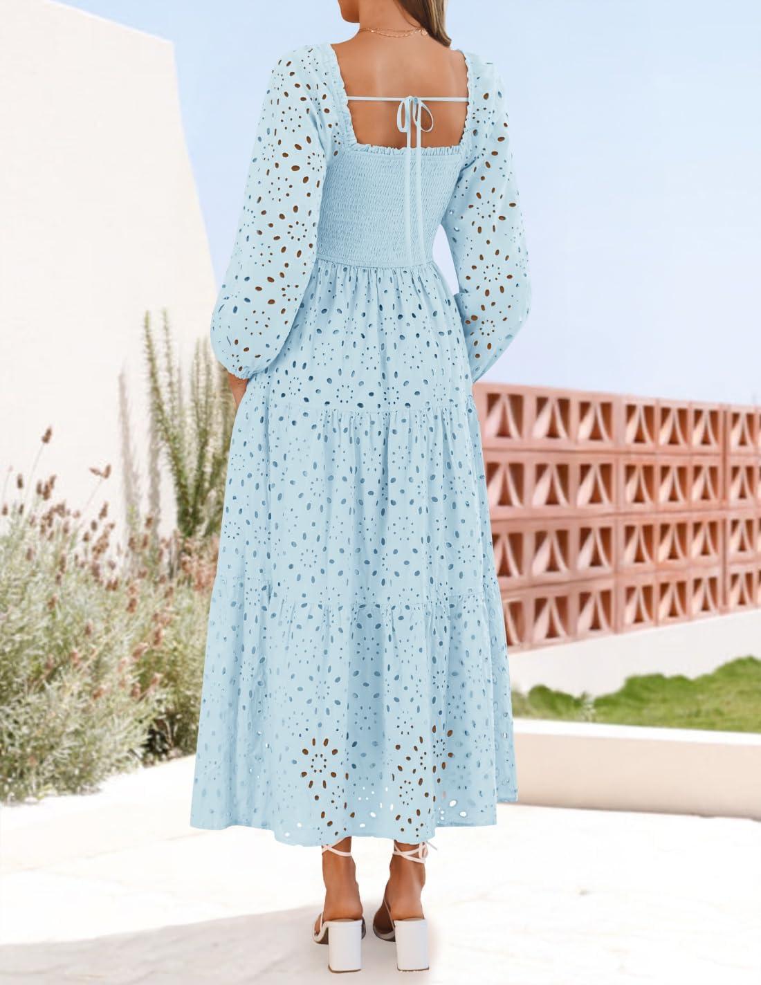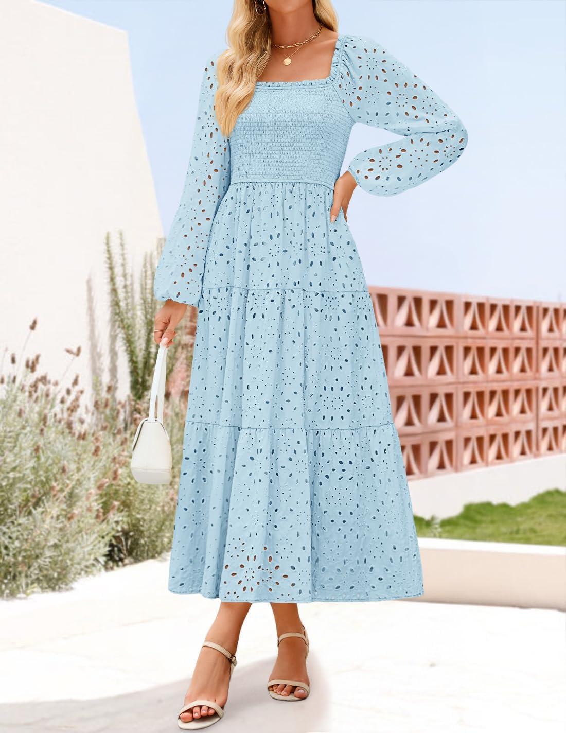 ZESICA Women’s Fall Long Sleeve Maxi Dresses 2025 Square Neck Hollow Out Eyelet Smocked A Line Boho Wedding Guset Dress(Lightblue)