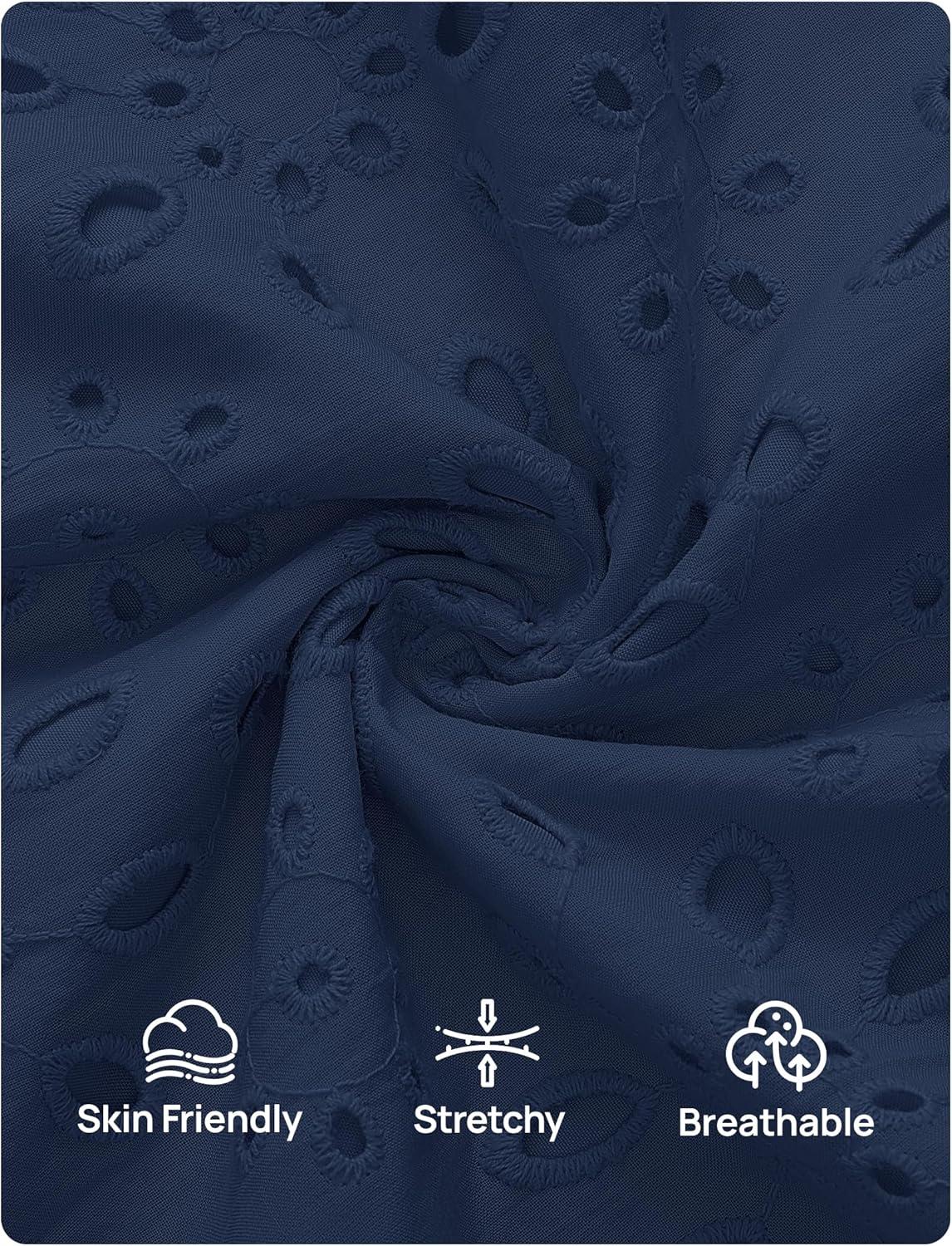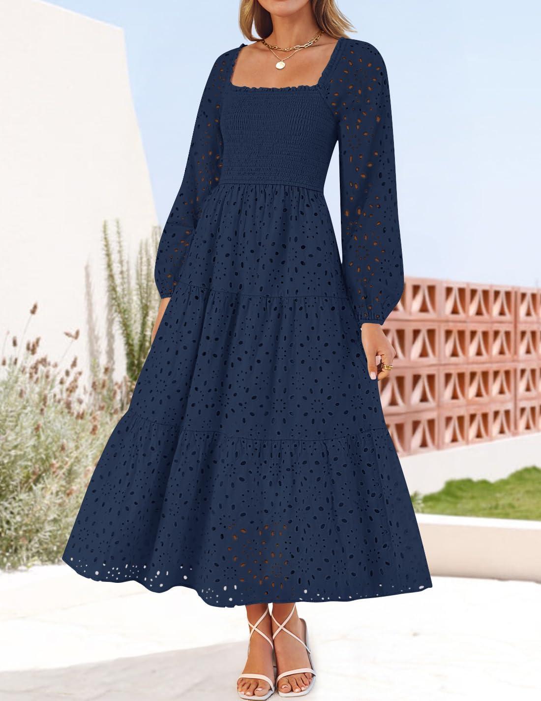 ZESICA Women's Fall Long Sleeve Maxi Dresses 2025 Square Neck Hollow Out Eyelet Smocked A Line Boho Wedding Guset Dress(Navy)
