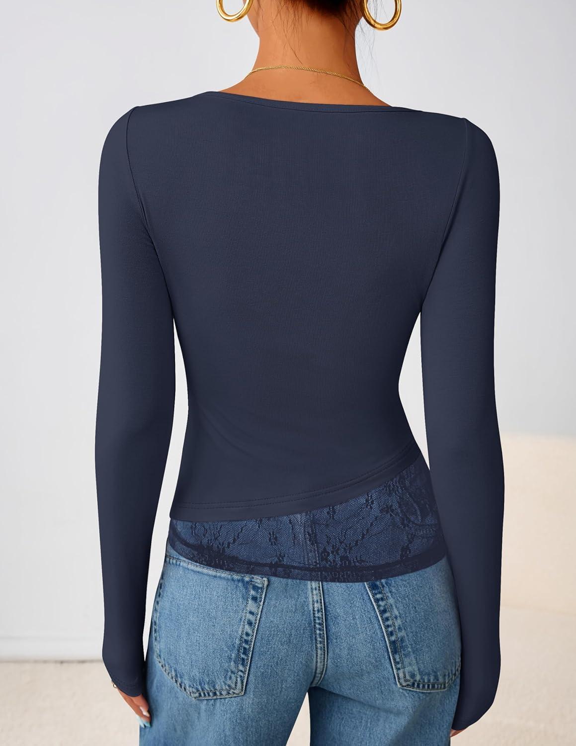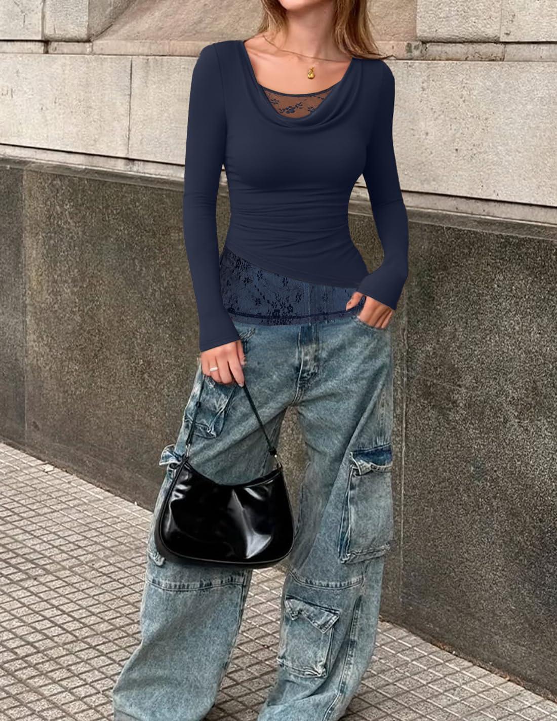 ZESICA Women's Fall Long Sleeve Tops 2025 Casual Cowl Neck Lace Slim Fit Going Out Y2k Knit Shirts Blouses(Navy)