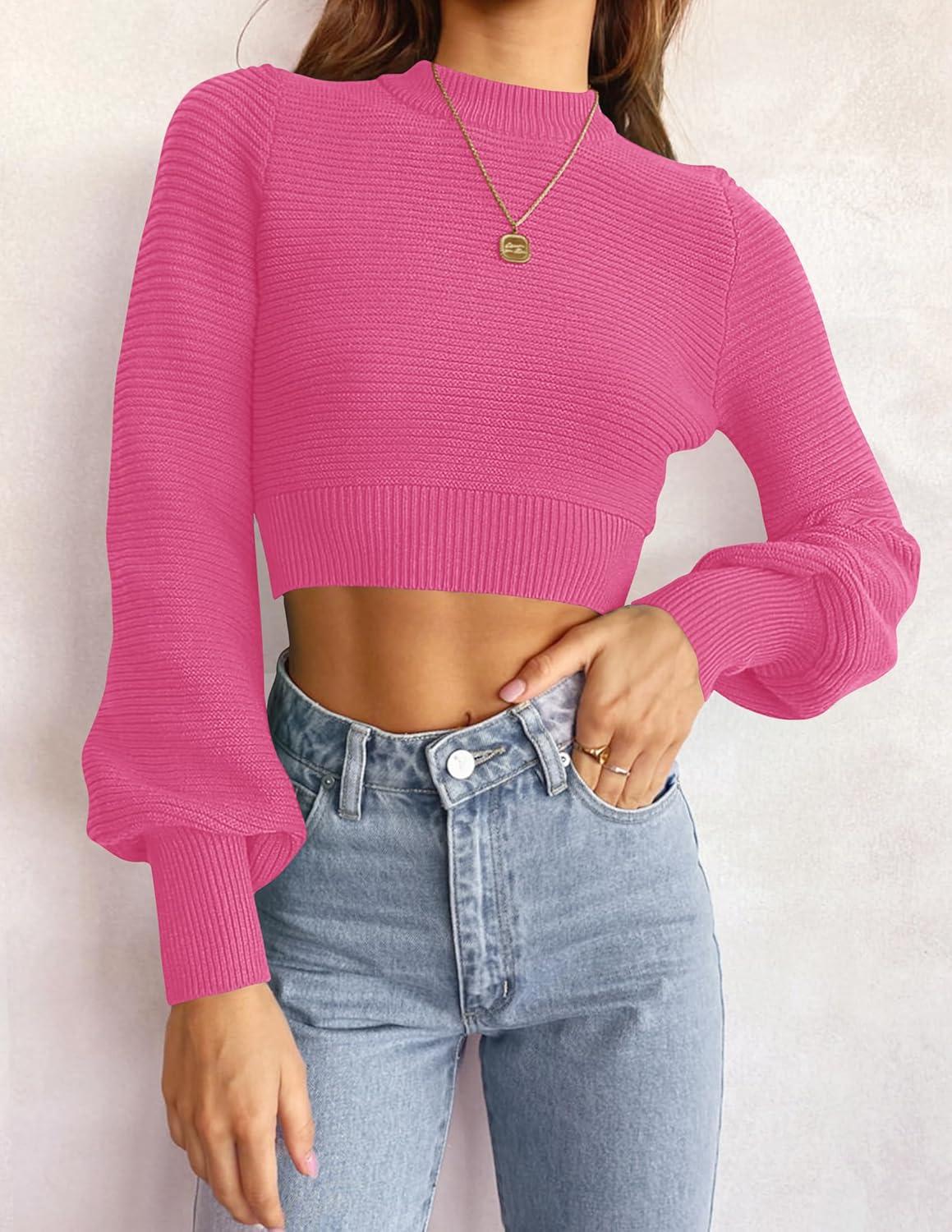 imageZESICA Womens Fall Mock Neck Cropped Sweater Long Sleeve Soft Ribbed Knit Pullover Jumper TopsRose