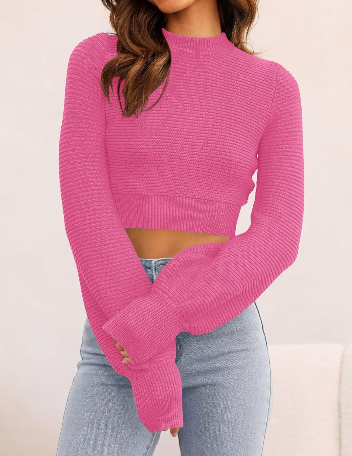 ZESICA Women's Fall Mock Neck Cropped Sweater Long Sleeve Soft Ribbed Knit Pullover Jumper Tops(Rose)