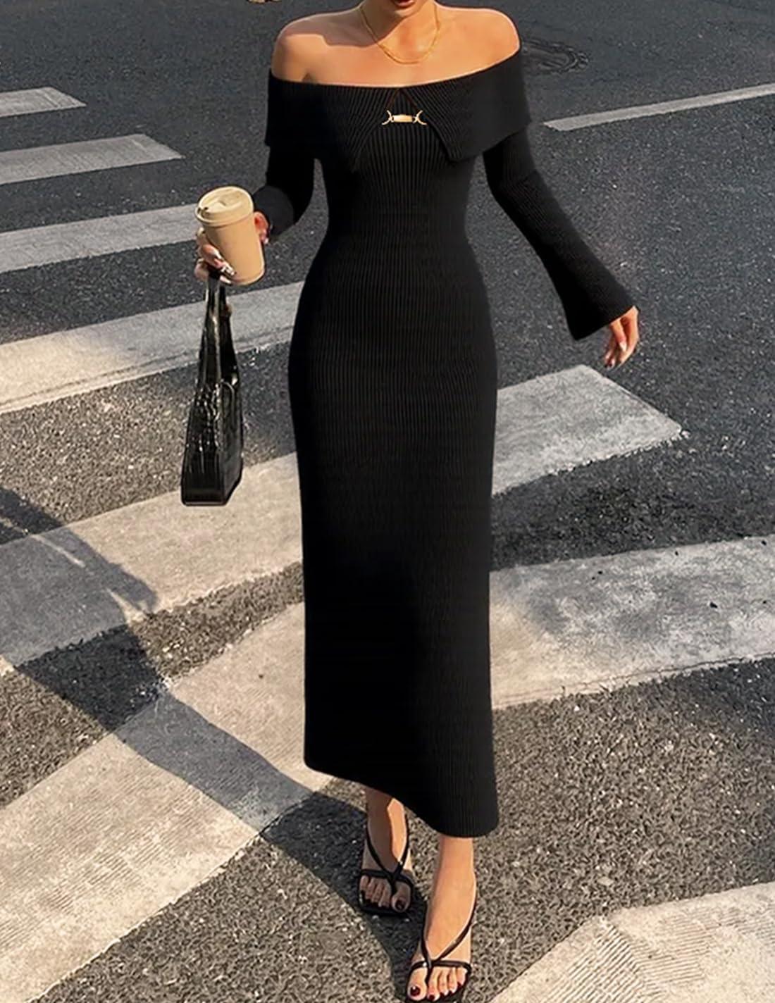 ZESICA Women’s Fall Off Shoulder Sweater Dress 2025 Bell Long Sleeve Ribbed Knit Bodycon Formal Maxi Dresses(Black)