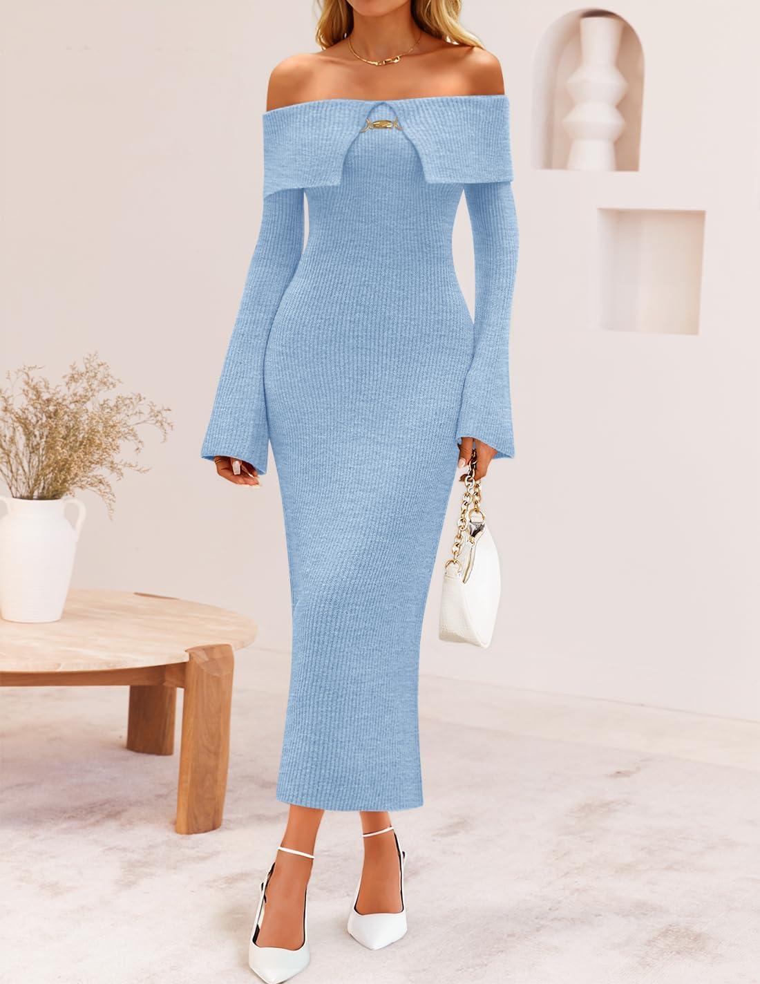 ZESICA Women's Fall Off Shoulder Sweater Dress 2025 Bell Long Sleeve Ribbed Knit Bodycon Formal Maxi Dresses(Blue)