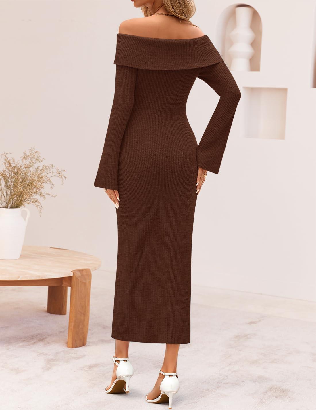 ZESICA Women’s Fall Off Shoulder Sweater Dress 2025 Bell Long Sleeve Ribbed Knit Bodycon Formal Maxi Dresses(Caramel)