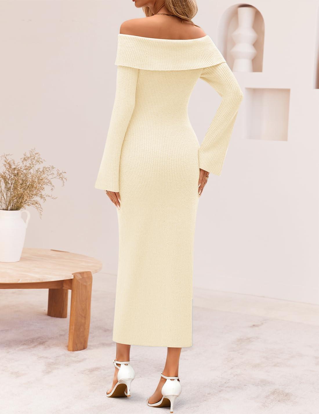 ZESICA Women’s Fall Off Shoulder Sweater Dress 2025 Bell Long Sleeve Ribbed Knit Bodycon Formal Maxi Dresses(Cream)