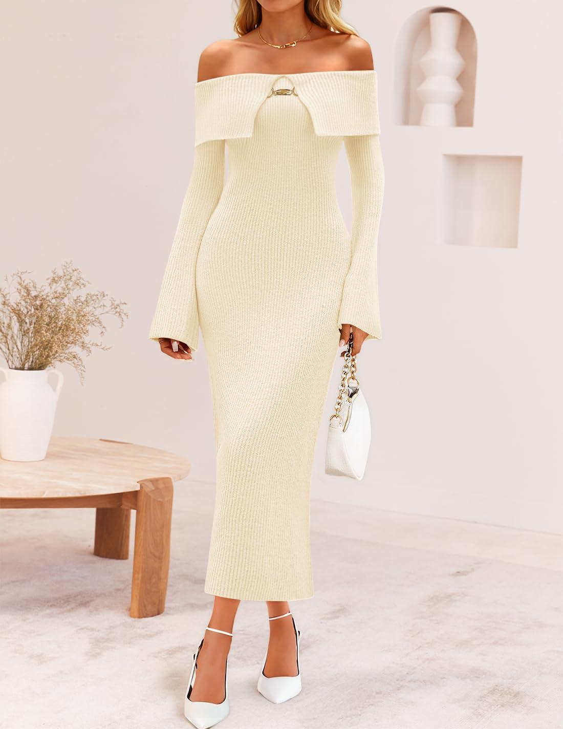 ZESICA Women's Fall Off Shoulder Sweater Dress 2025 Bell Long Sleeve Ribbed Knit Bodycon Formal Maxi Dresses(Cream)