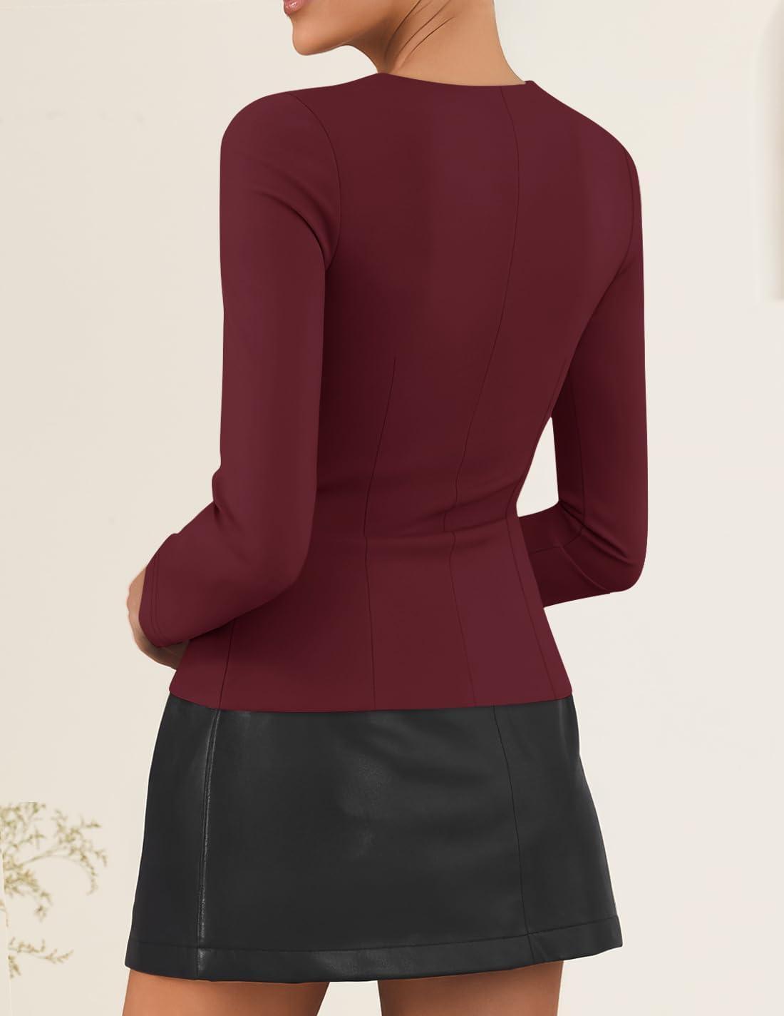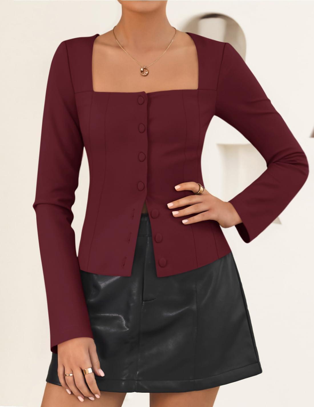 ZESICA Women’s Fall Square Neck Blazers 2025 Casual Long Sleeve Button Up Work Business Fitted Blazer Jackets(Wine)