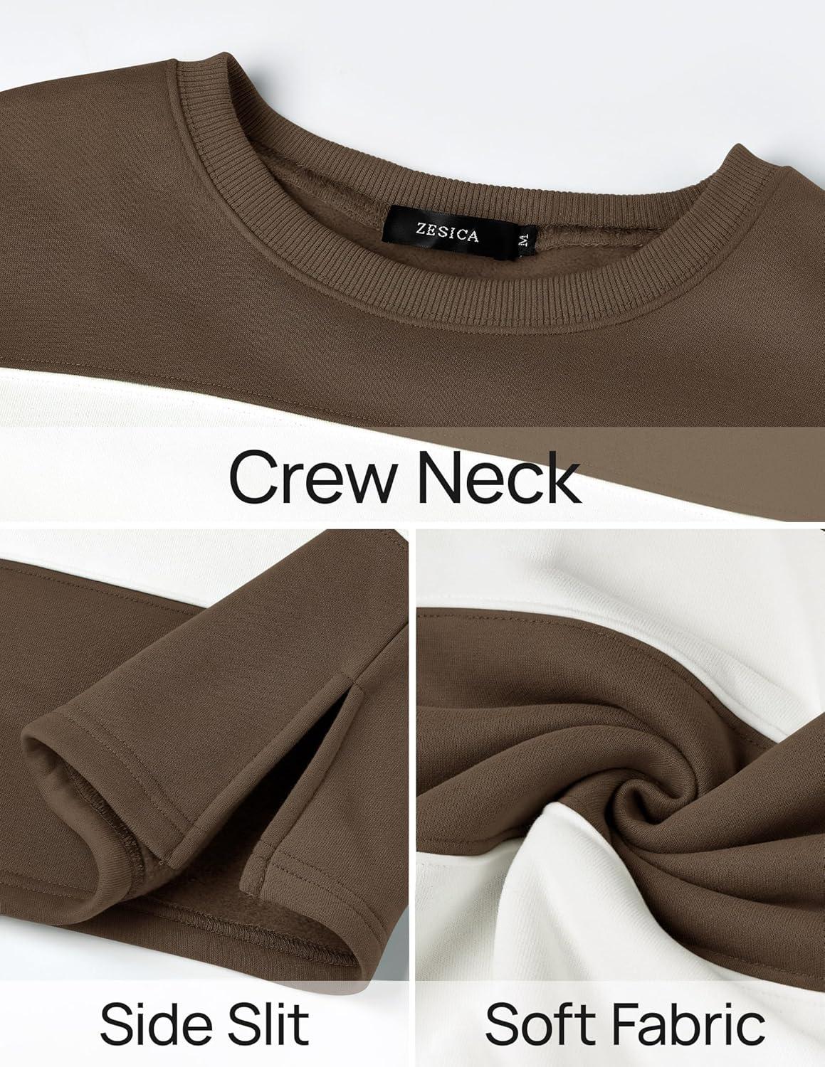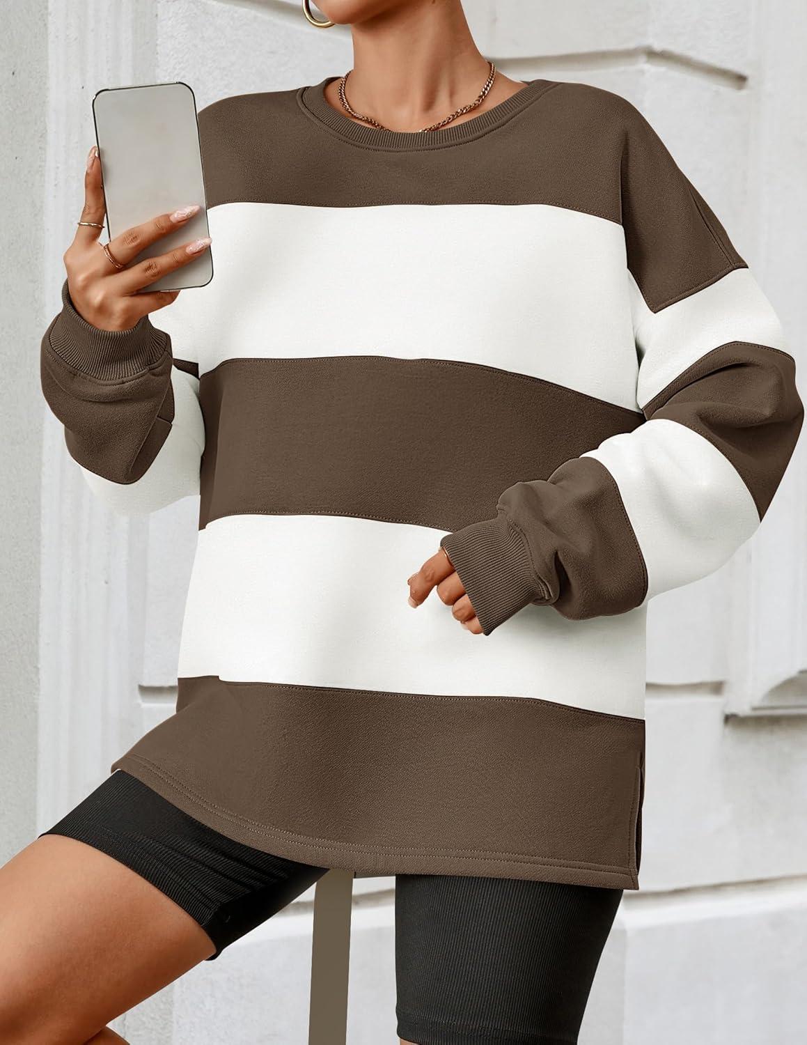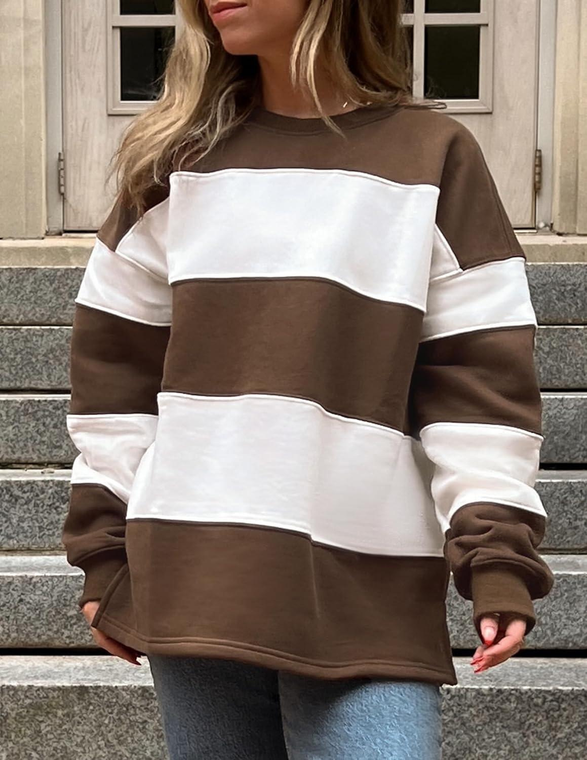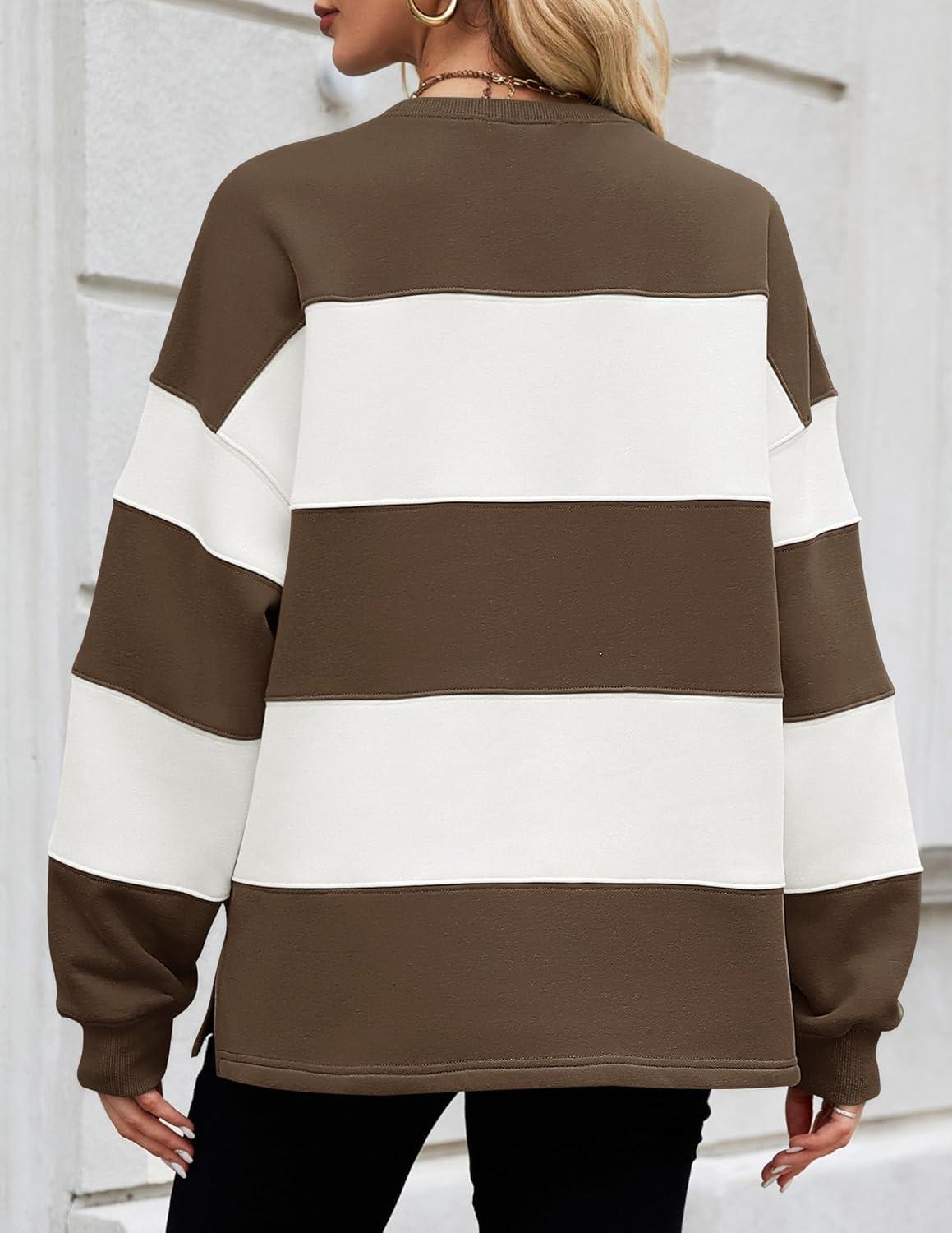 ZESICA Women’s Fall Sweatshirt Tops Crewneck Long Sleeve Loose Oversized Striped Fleece Pullover 2025 Clothes(Brown)