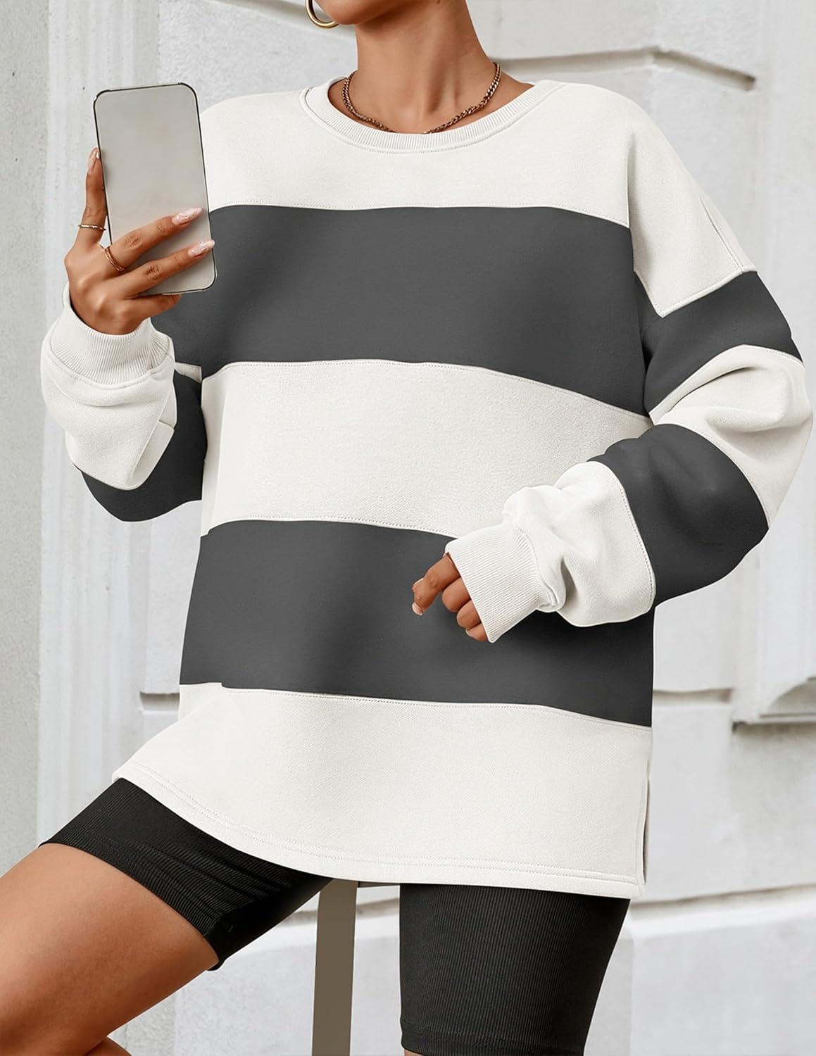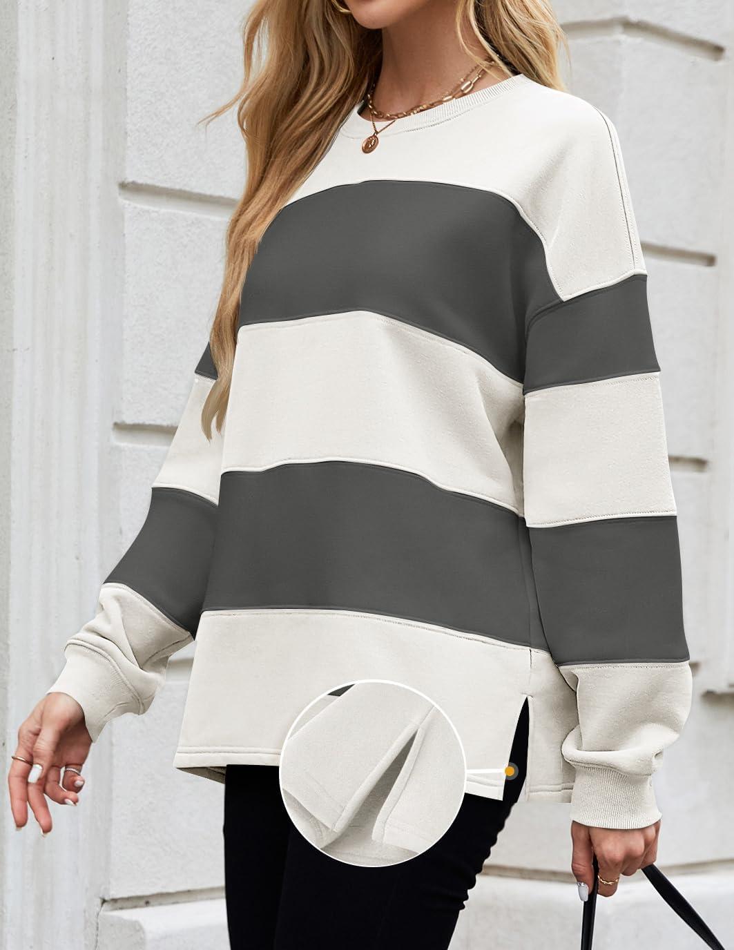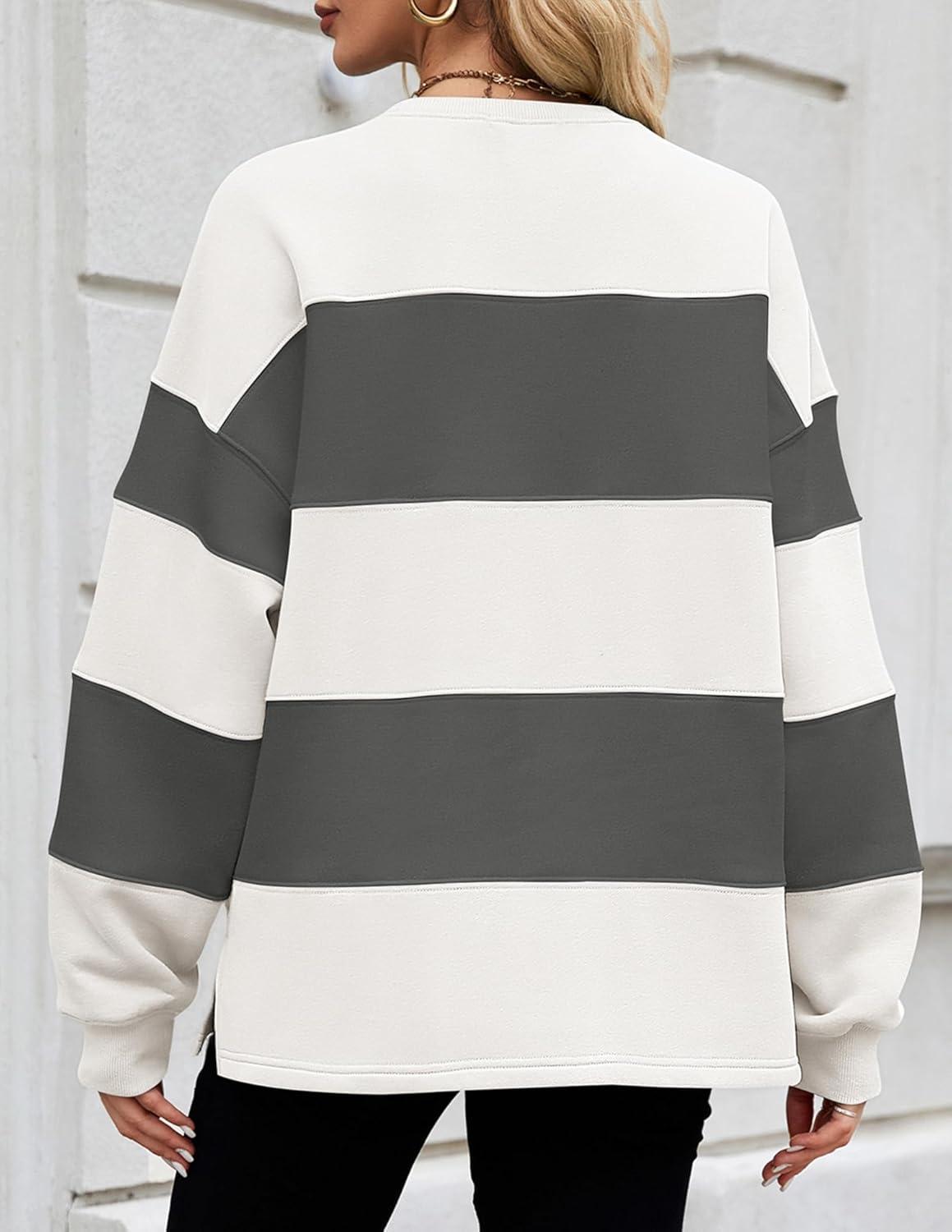 ZESICA Women's Fall Sweatshirt Tops Crewneck Long Sleeve Loose Oversized Striped Fleece Pullover 2025 Clothes(Grey)