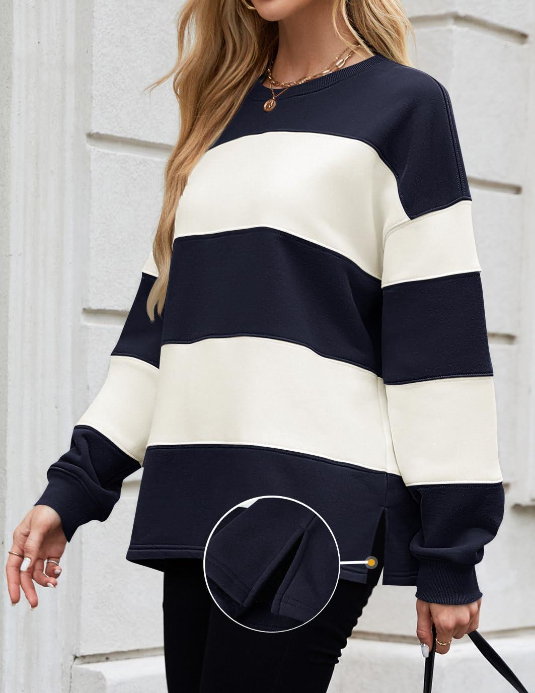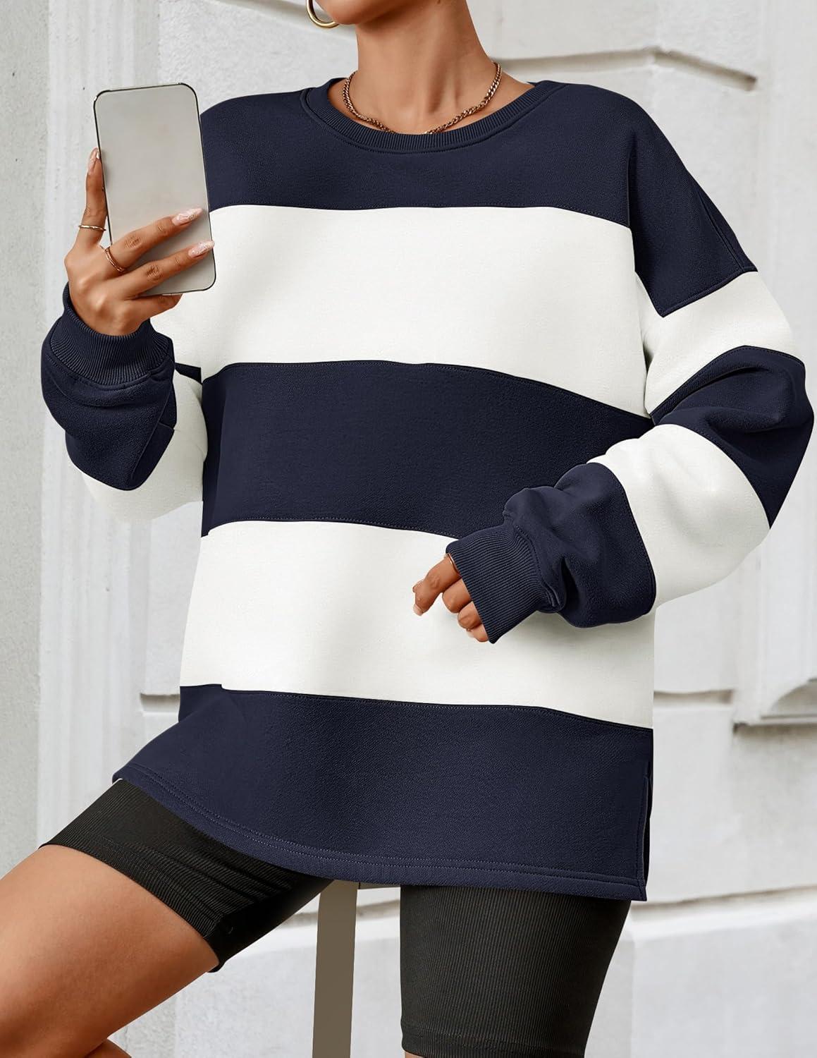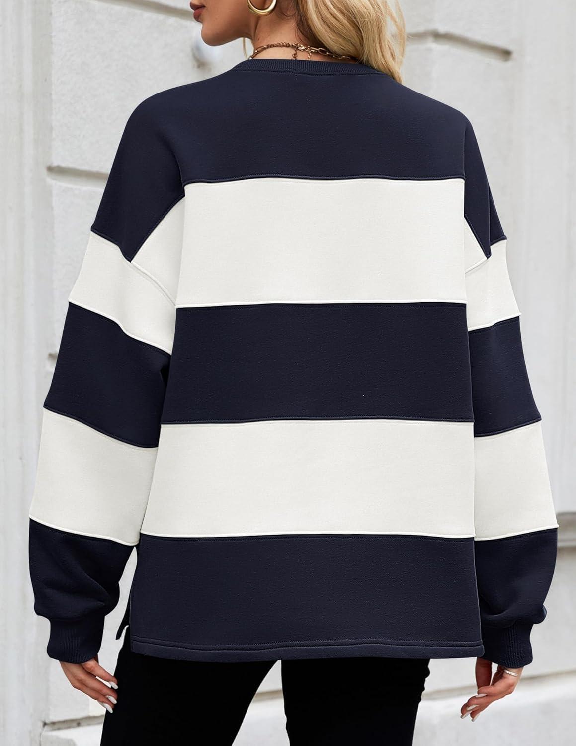 ZESICA Women's Fall Sweatshirt Tops Crewneck Long Sleeve Loose Oversized Striped Fleece Pullover 2025 Clothes(Navy)
