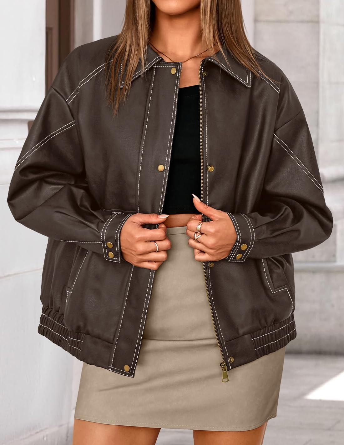 ZESICA Women's Faux Leather Jacket Oversized Zipper Motorcycle Coats 2025 Fall Fashion Trendy Clothes Outfits(Darkcoffee)