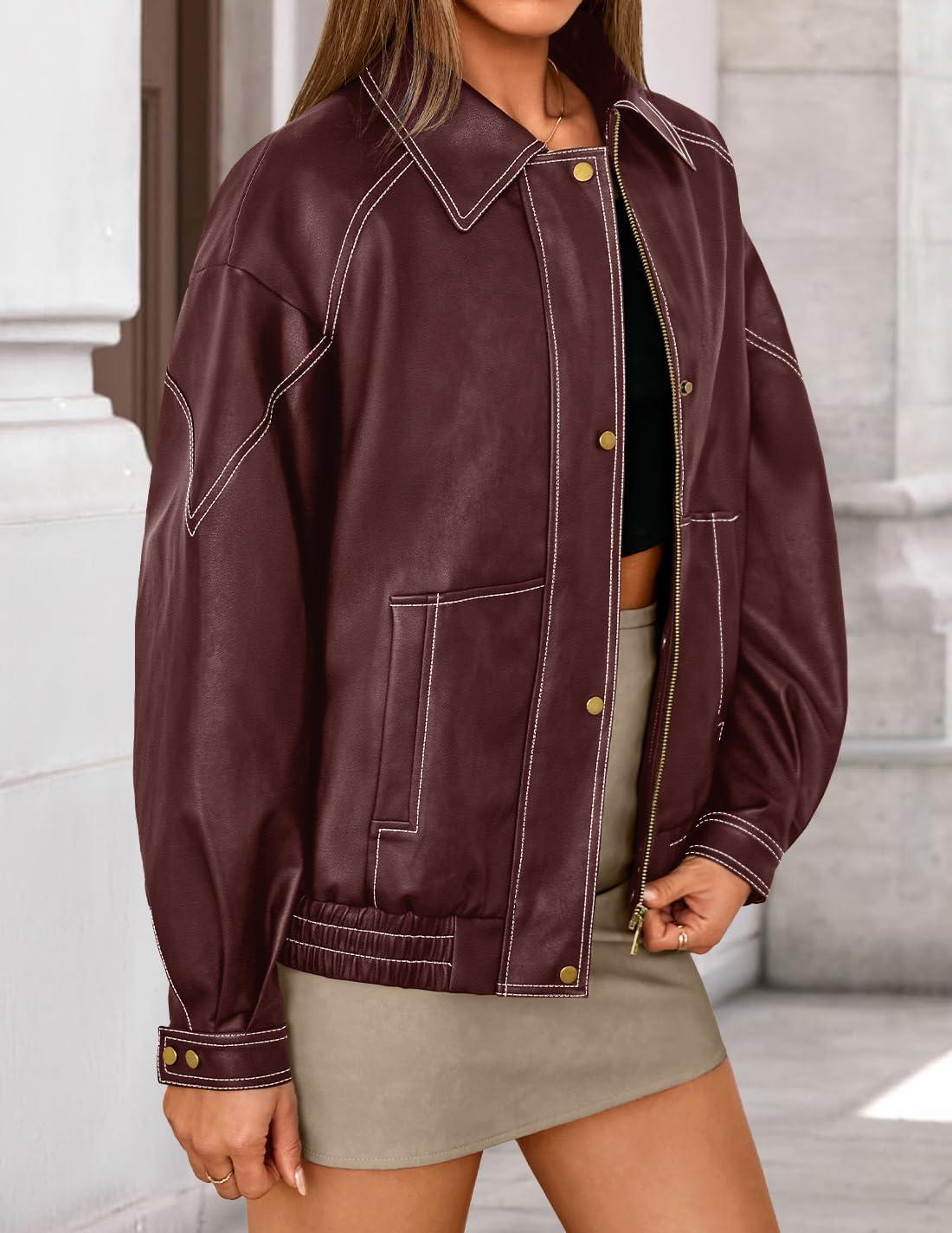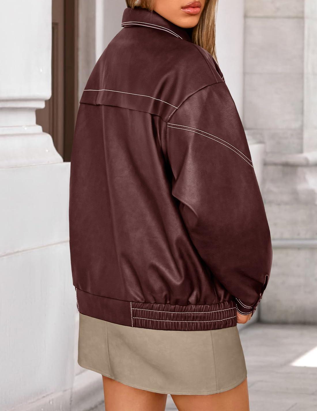 ZESICA Women's Faux Leather Jacket Oversized Zipper Motorcycle Coats 2025 Fall Fashion Trendy Clothes Outfits(Wine)