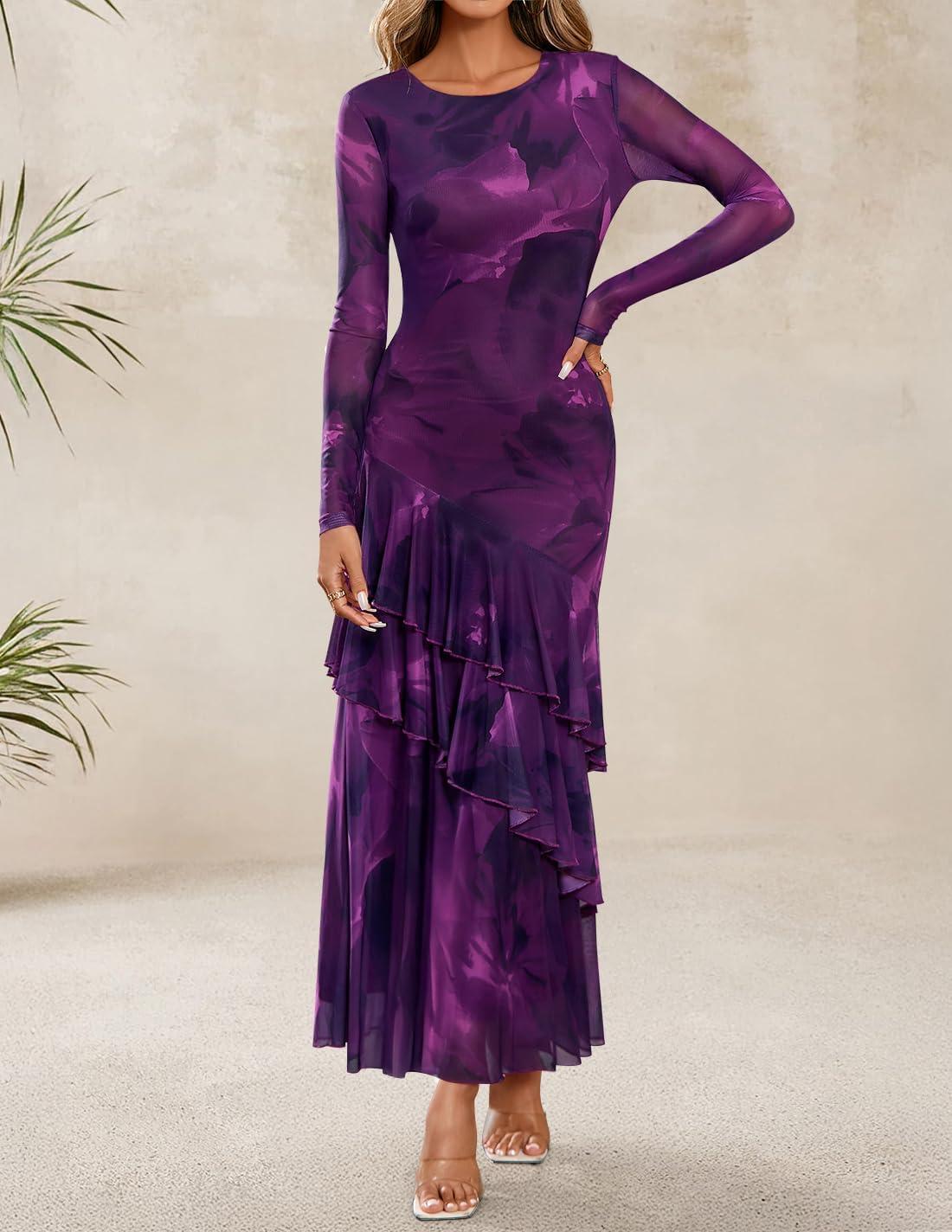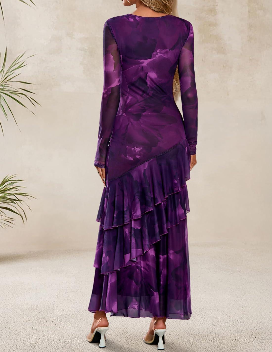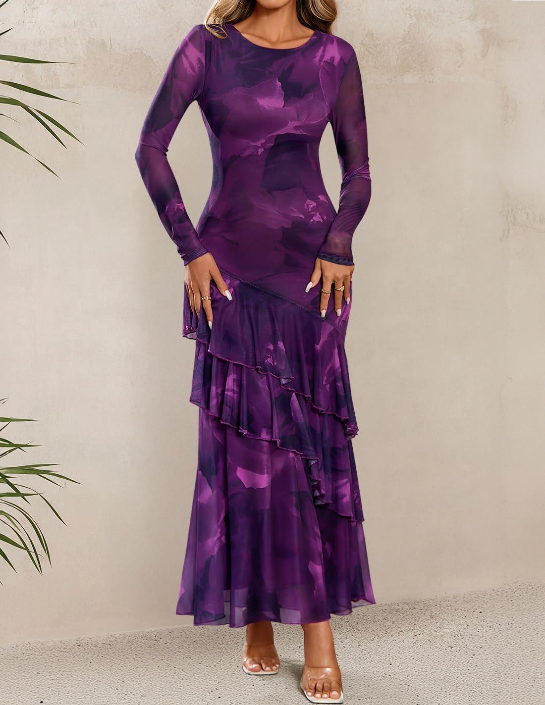 ZESICA Women’s Floral Bodycon Maxi Dresses 2025 Fall Boho Long Sleeve Mesh Ruffle Mermaid Wedding Cocktail Party Dress(Purple)