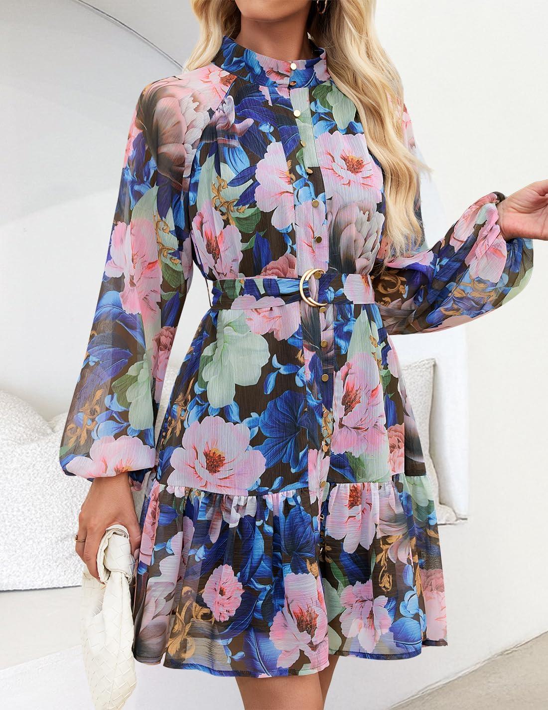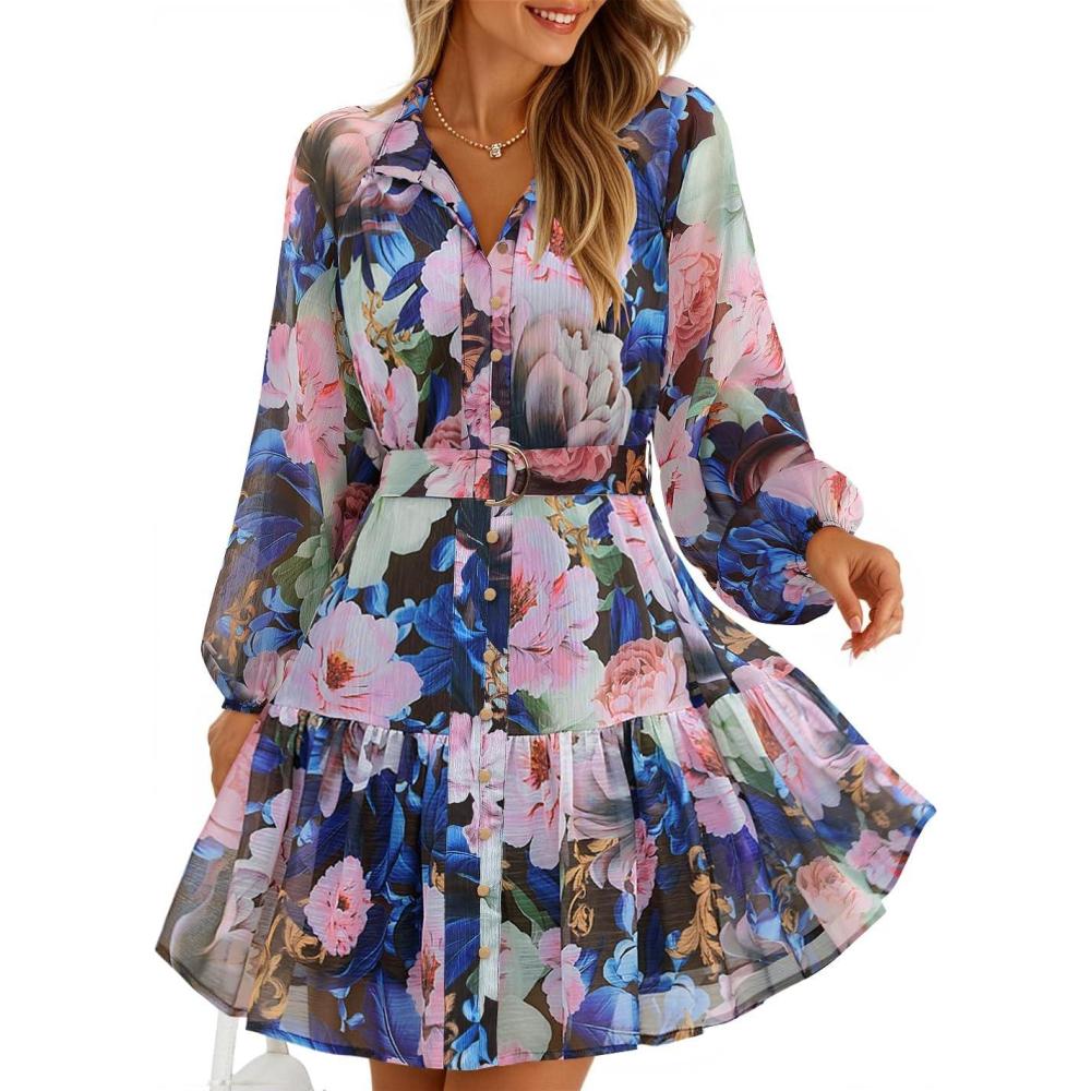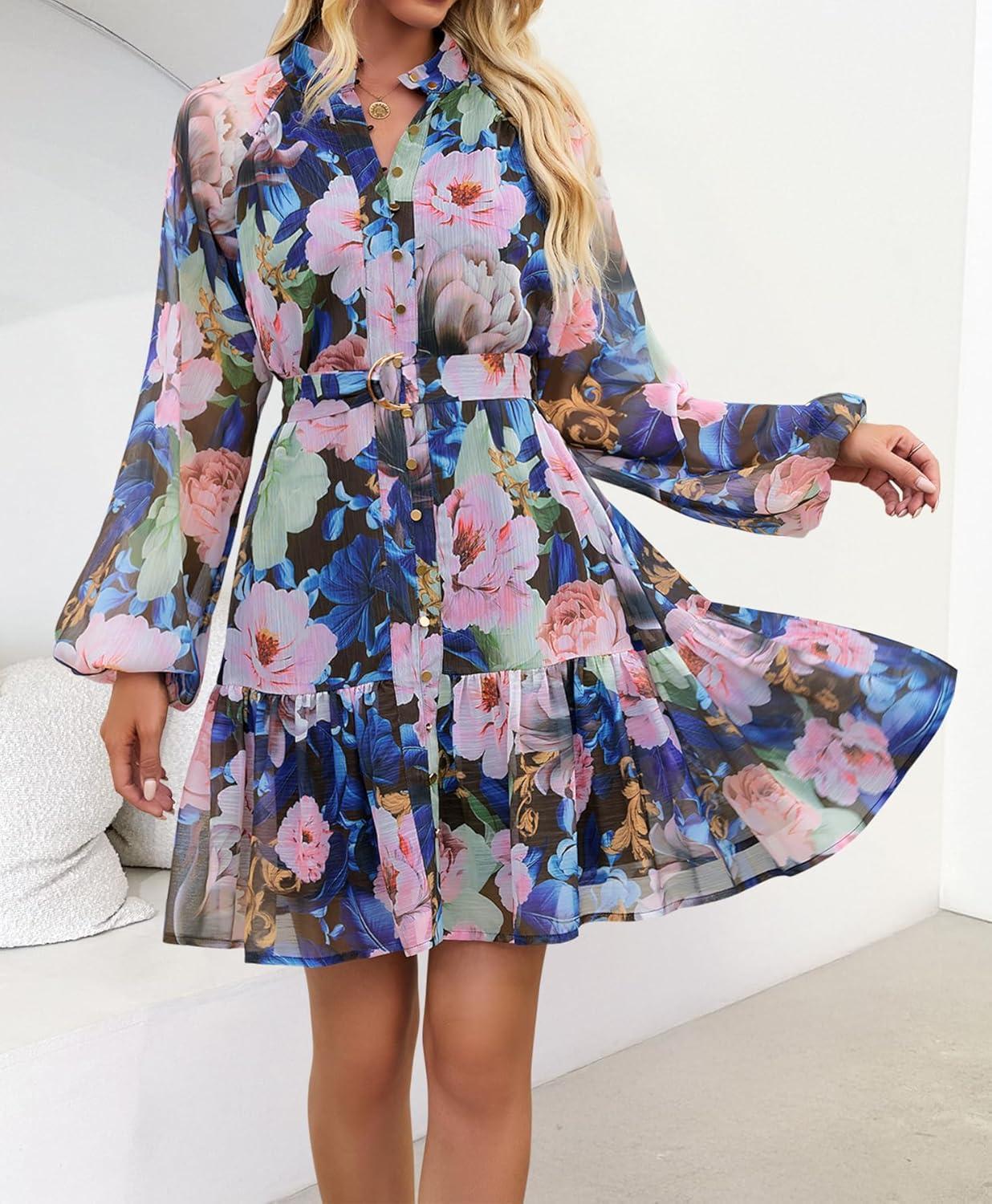 ZESICA Womens Floral Long Sleeve Mini Dress Spring Button Chiffon A Line Swing Short Wedding Guest Holiday Party Dresses(Dark Blue)