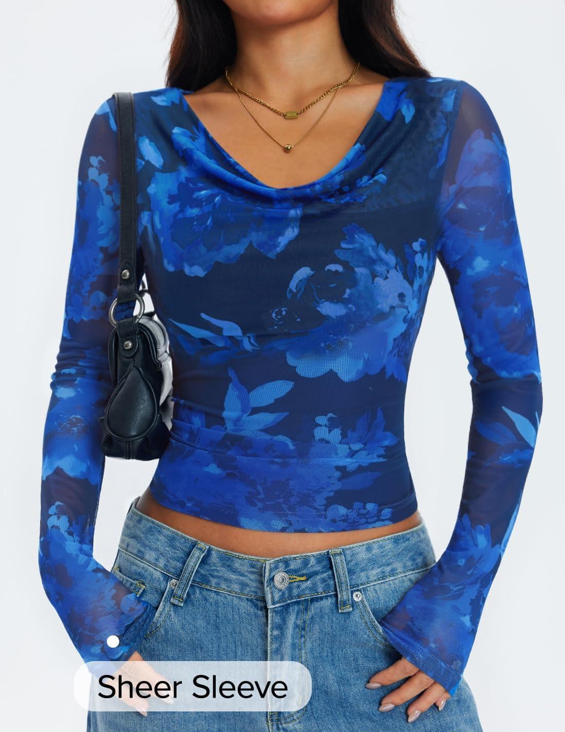 imageZESICA Womens Floral Mesh Long Sleeve Tops 2025 Fall Cowl Neck Slim Fit Going Out Y2k Shirts Trendy Date Night OutfitsDark Blue