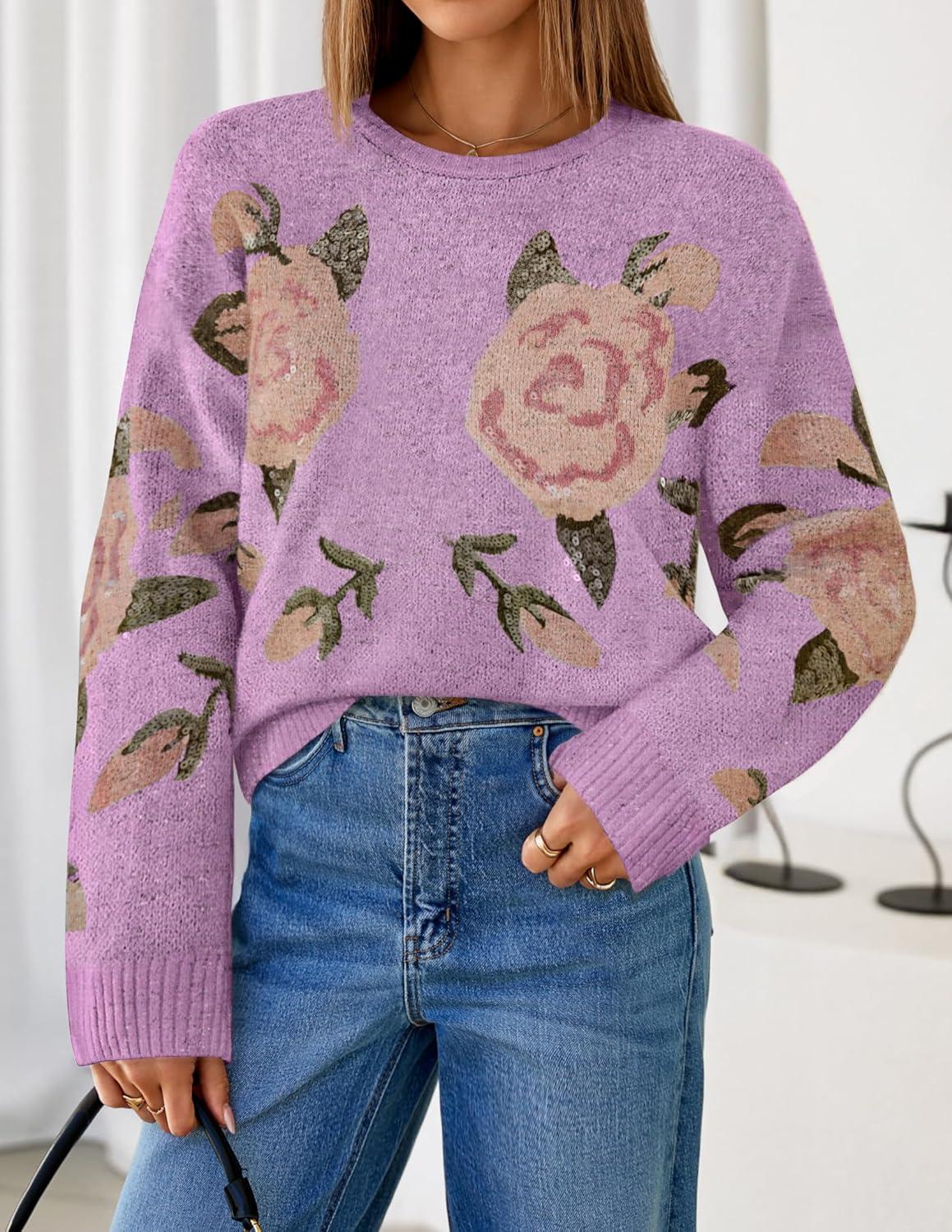 ZESICA Women’s Floral Oversized Sweaters 2025 Fall Crewneck Long Sleeve Casual Chunky Knit Pullover Sweater Tops(Purple)