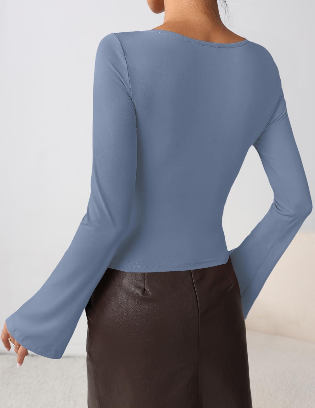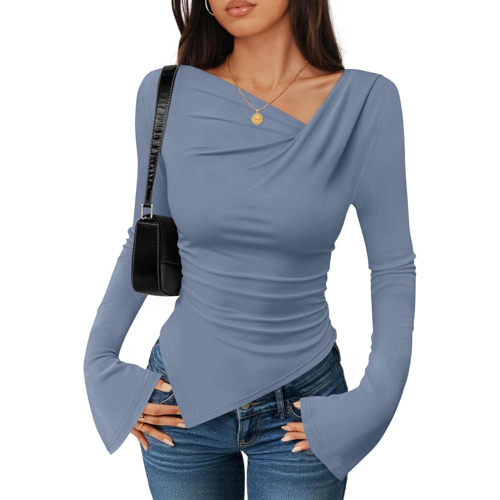 ZESICA Women’s Long Bell Sleeve Shirts 2025 Fall Going Out Asymmetrical Crop Tops Slim Fit Ribbed Ruched Y2K Clothes(Blue)