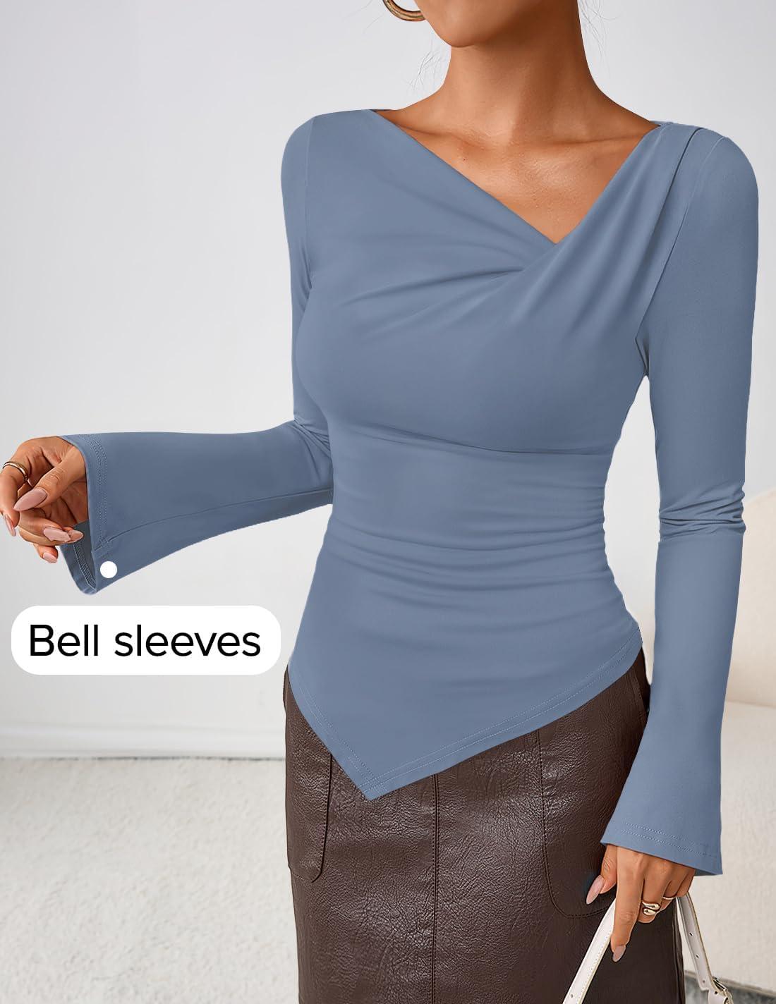 ZESICA Women's Long Bell Sleeve Shirts 2025 Fall Going Out Asymmetrical Crop Tops Slim Fit Ribbed Ruched Y2K Clothes(Blue)
