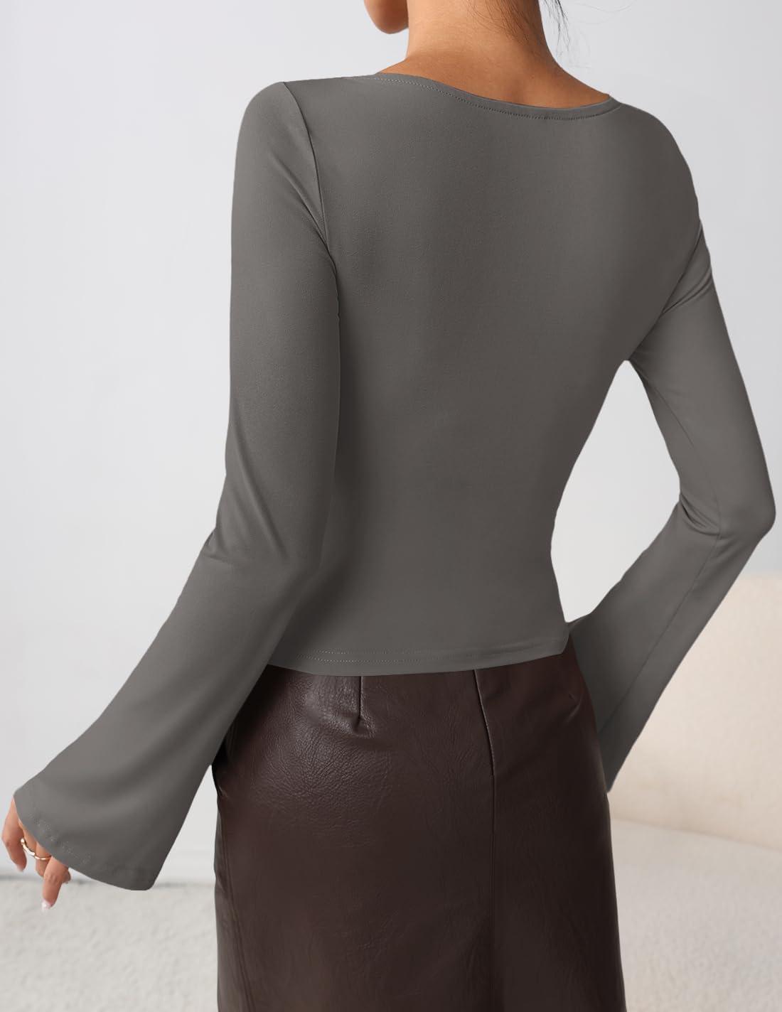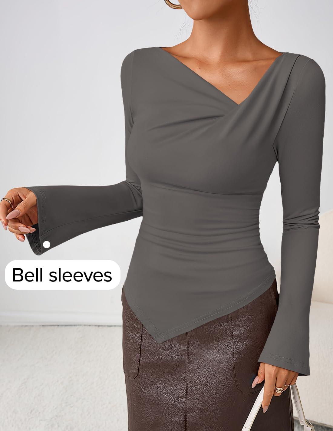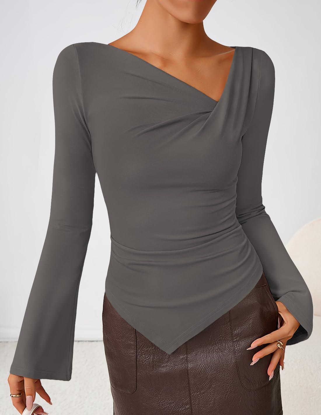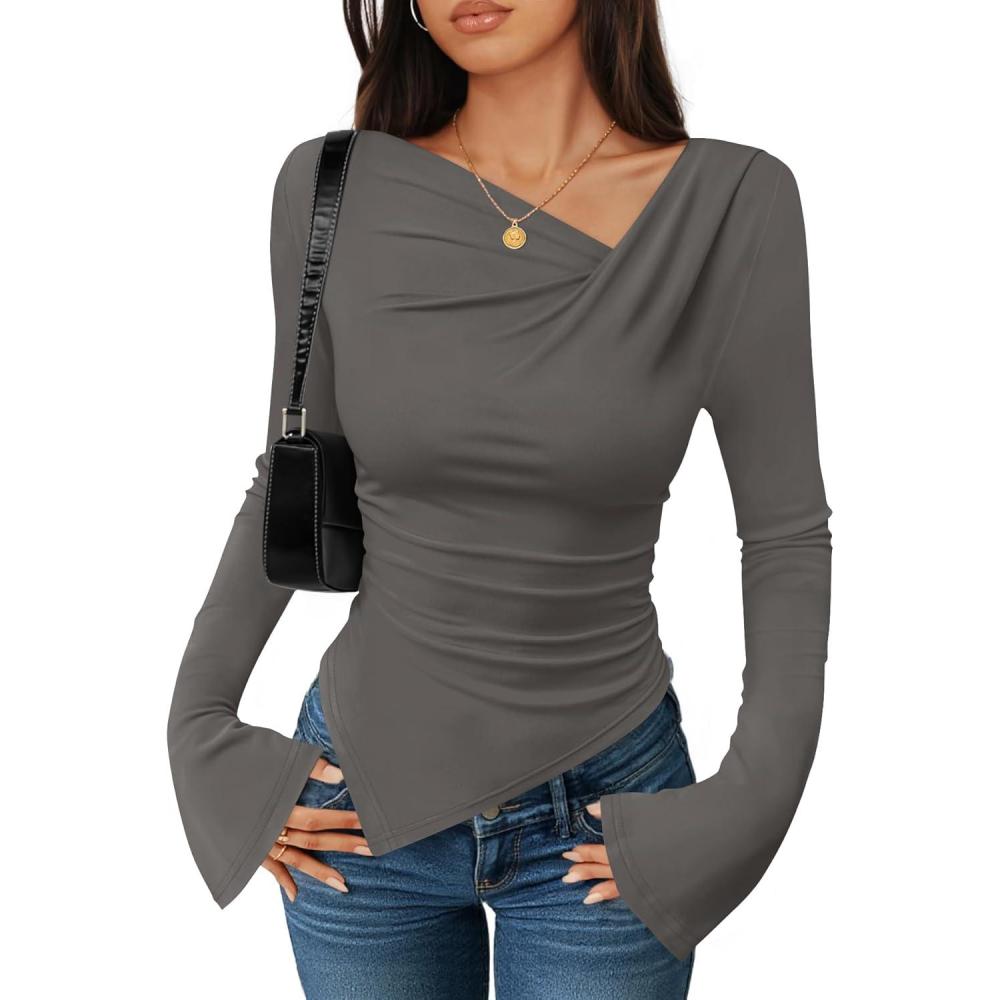 ZESICA Women's Long Bell Sleeve Shirts 2025 Fall Going Out Asymmetrical Crop Tops Slim Fit Ribbed Ruched Y2K Clothes(Grey)