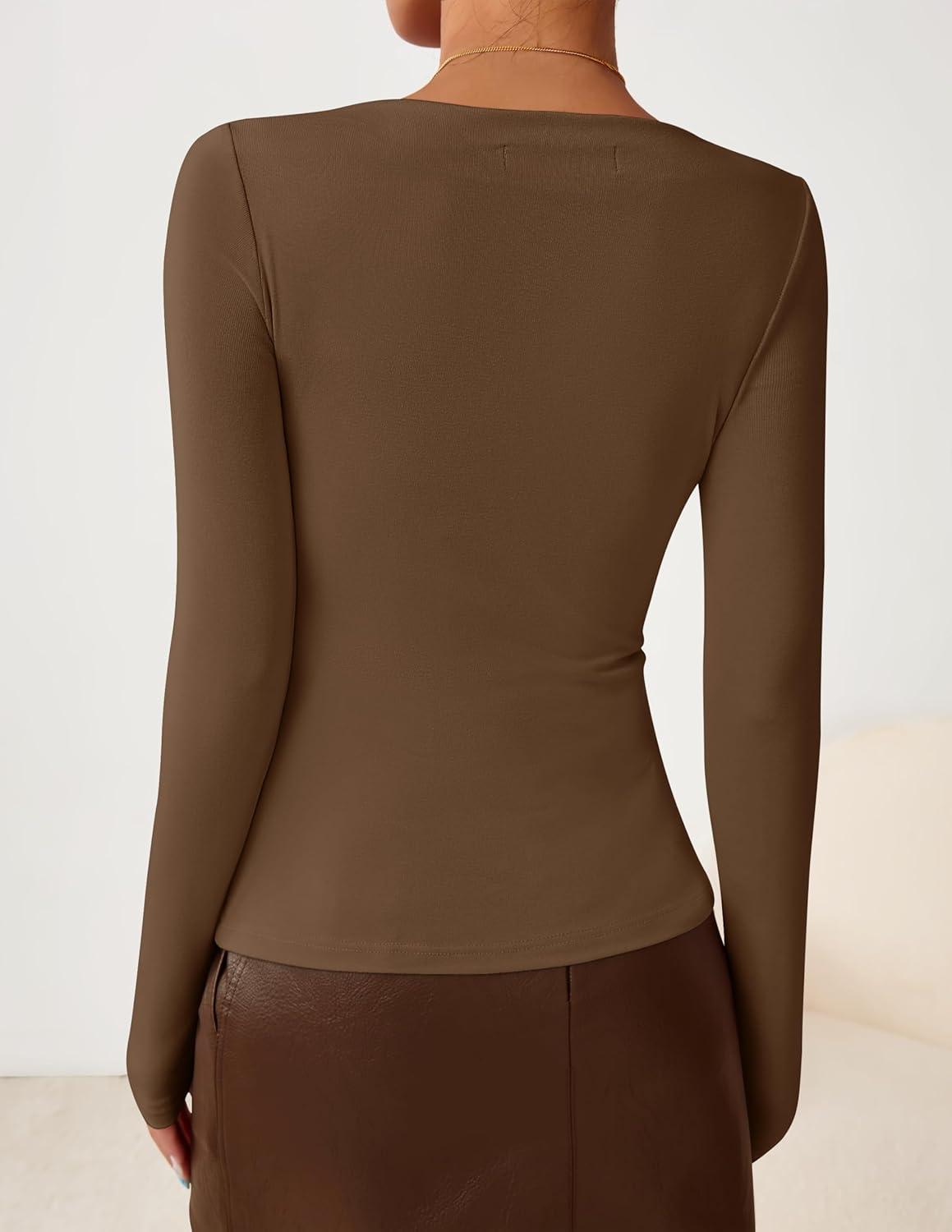 ZESICA Women's Long Sleeve Asymmetrical Neck Ruched Slim Fit Shirts 2025 Fall Fashion Casual Tee Going Out Tops(Brown)