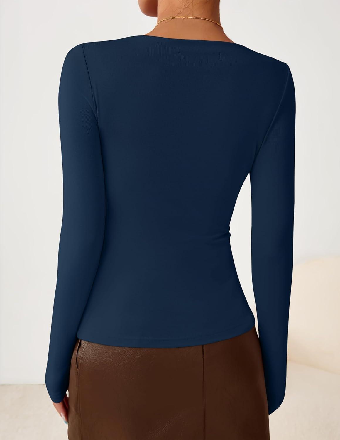 ZESICA Women's Long Sleeve Asymmetrical Neck Ruched Slim Fit Shirts 2025 Fall Fashion Casual Tee Going Out Tops(Navy)