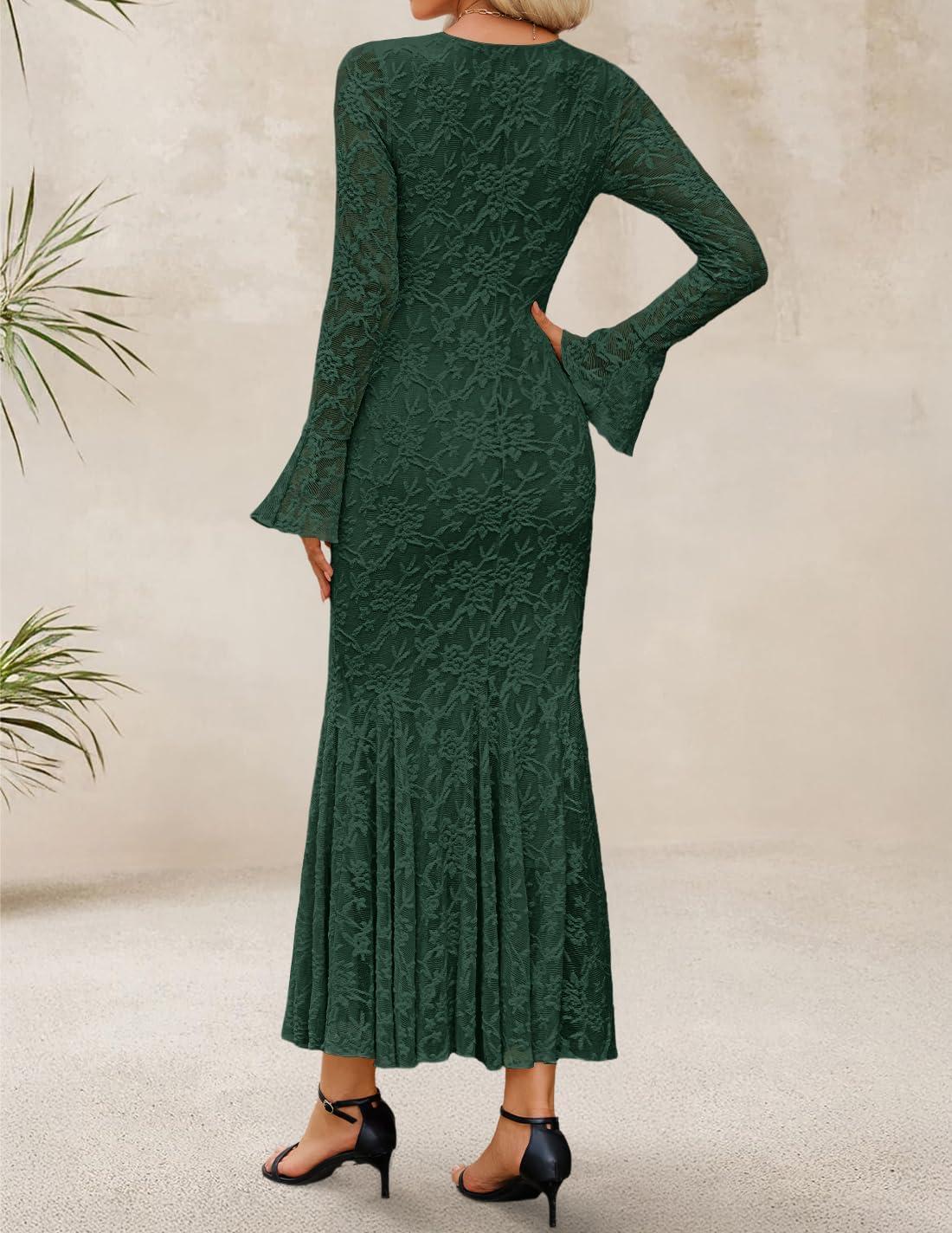 ZESICA Women's Long Sleeve Bodycon Maxi Dress 2025 Fall Fashion Floral Sexy Mermaid Wedding Guest Cocktail Party Dresses(Darkgreen)