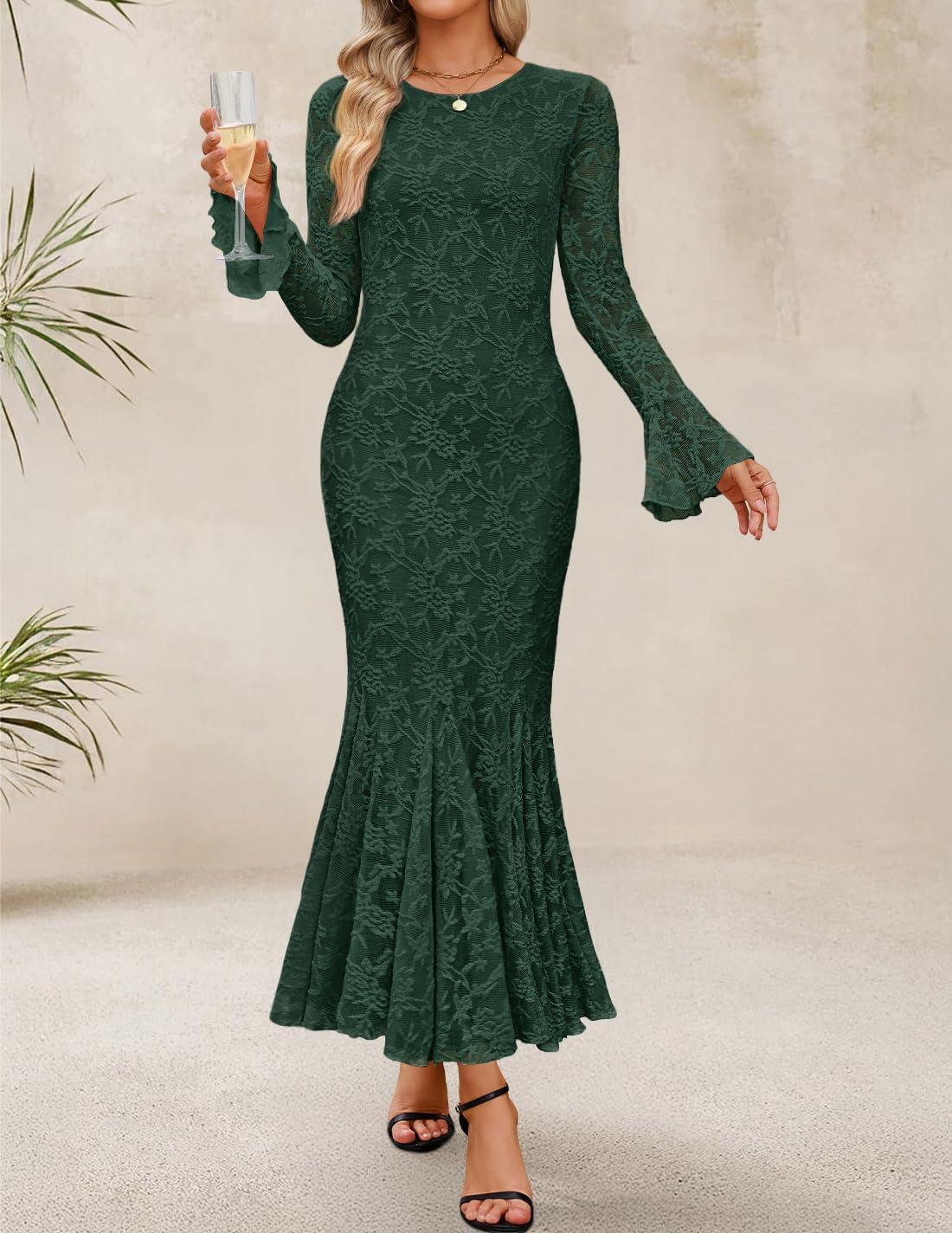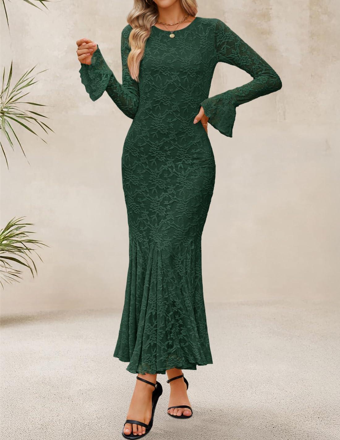ZESICA Women’s Long Sleeve Bodycon Maxi Dress 2025 Fall Fashion Floral Sexy Mermaid Wedding Guest Cocktail Party Dresses(Darkgreen)