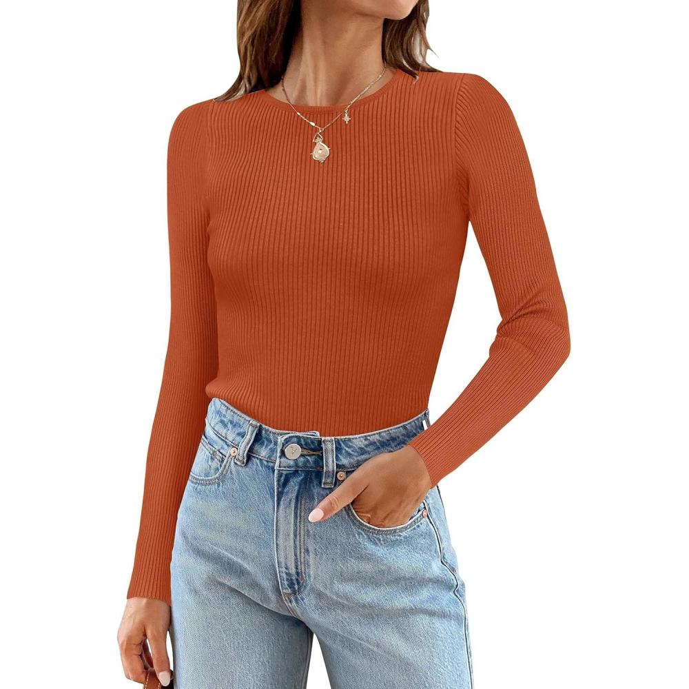 imageZESICA Womens Long Sleeve Crewneck Shirts 2025 Fall Ribbed Knit Sweater Slim Fitted Casual Basic Tee TopsCaramel