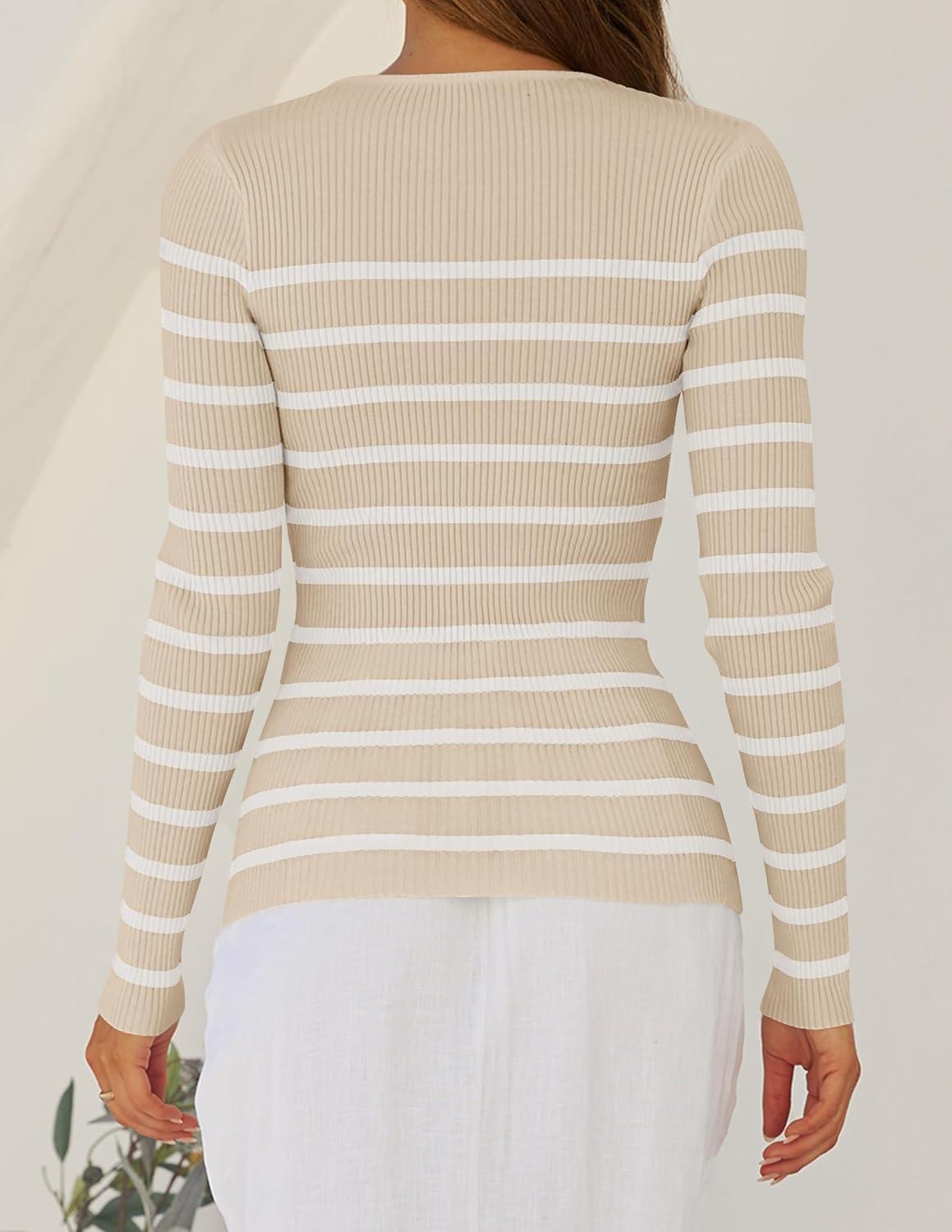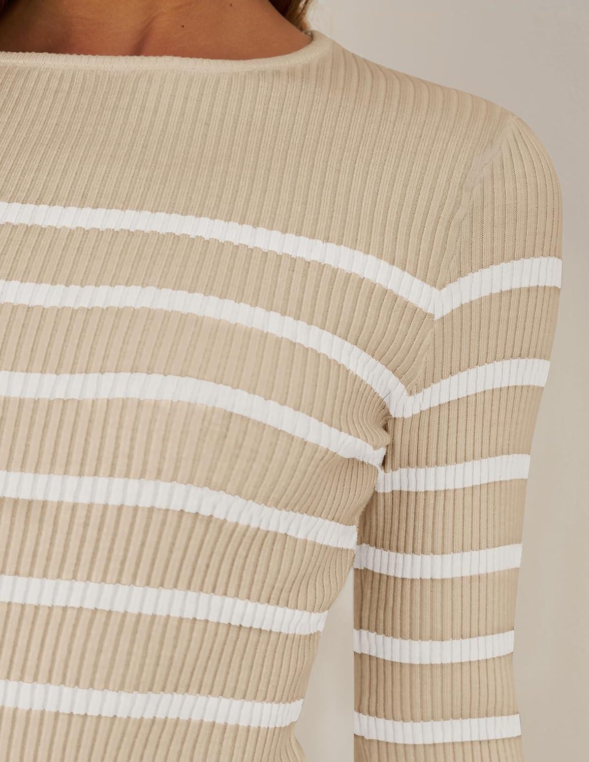 ZESICA Women’s Long Sleeve Crewneck Striped Shirts Spring Ribbed Knit Sweater Slim Fitted Casual Basic Tee Tops(Khaki)