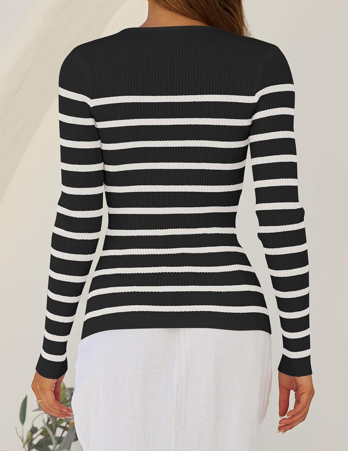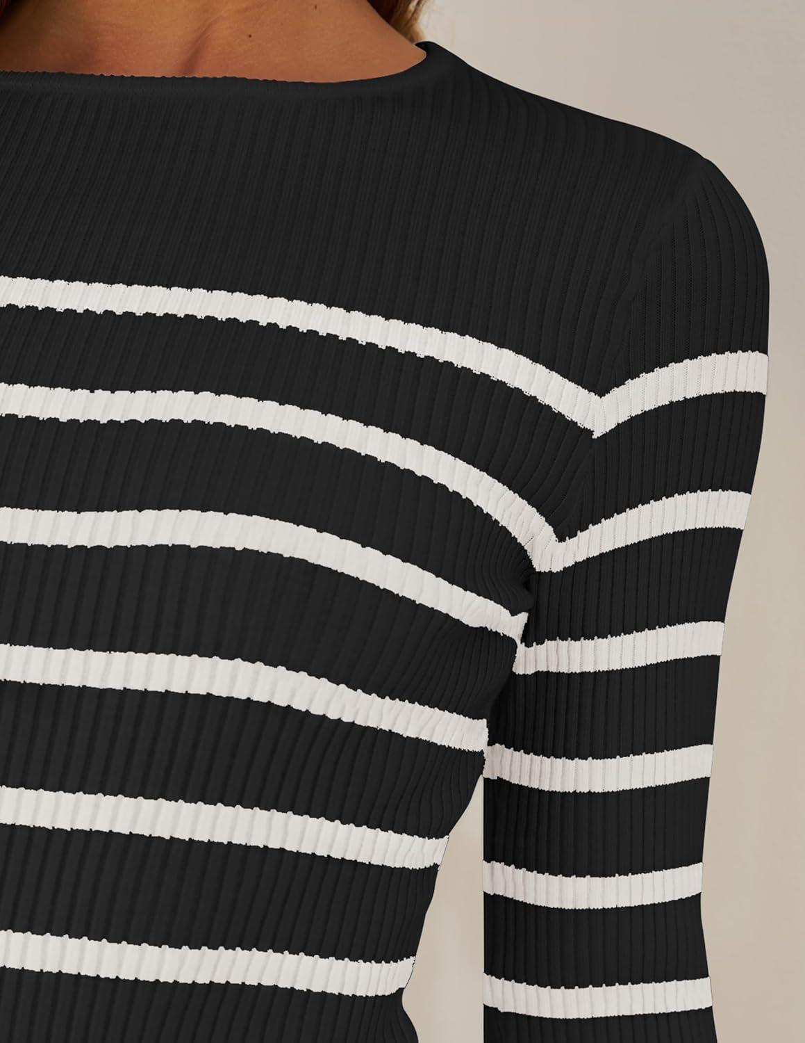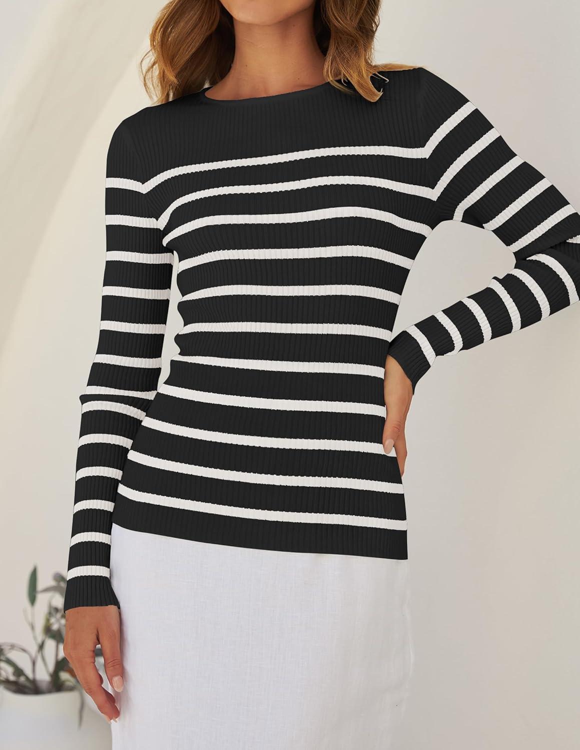 ZESICA Women’s Long Sleeve Crewneck Striped Shirts Spring Ribbed Knit Sweater Slim Fitted Casual Basic Tee Tops(Black)