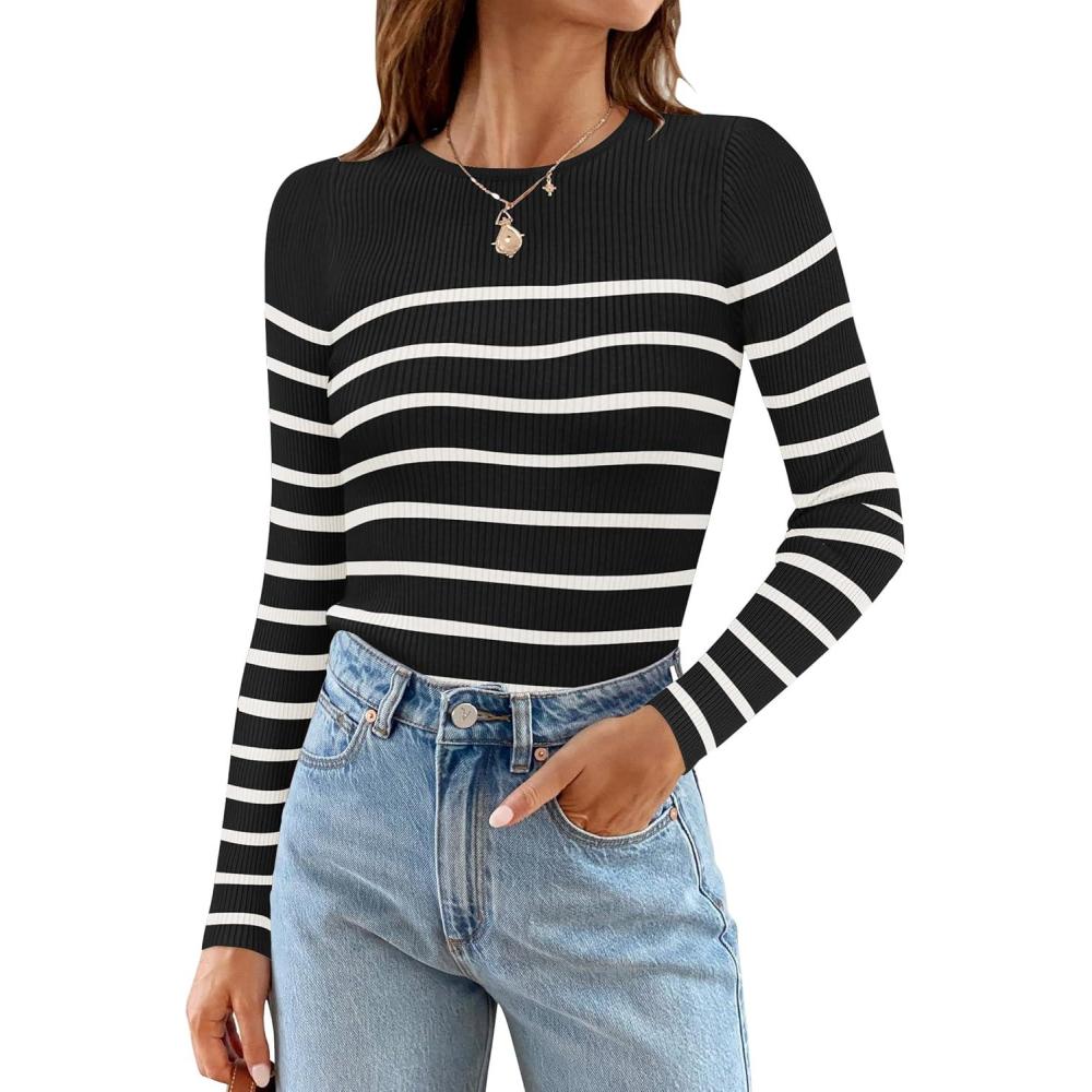 Don’t wait, get up to 50% off on ZESICA Women’s Long Sleeve Crewneck Striped Shirts Spring Ribbed Knit Sweater Slim Fitted Casual Basic Tee Tops(Black) during our end-of-season sale event.