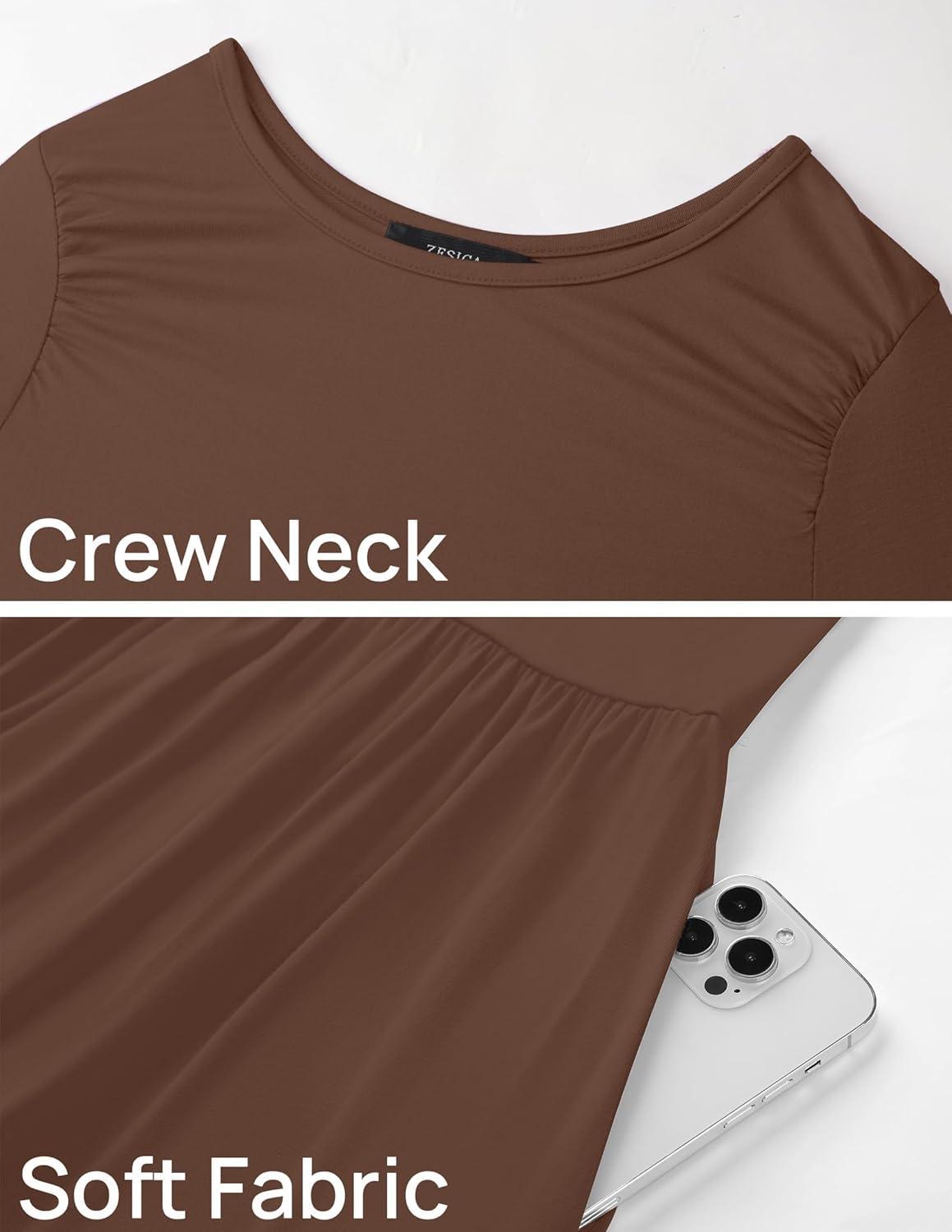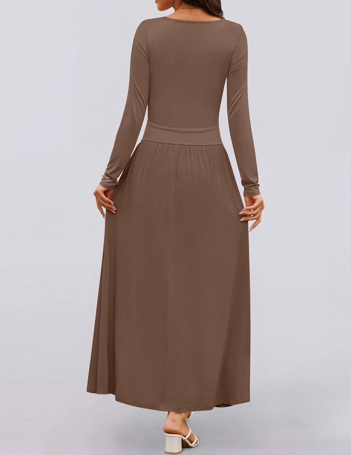 ZESICA Women’s Long Sleeve Fall Maxi Dress 2025 Crewneck Knit Casual Slim Swing Pleated Dresses with Pockets(Brown)