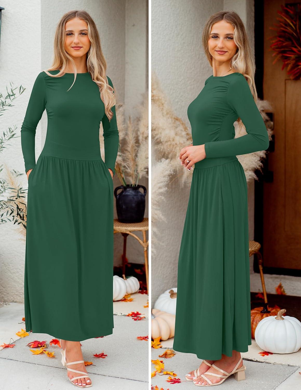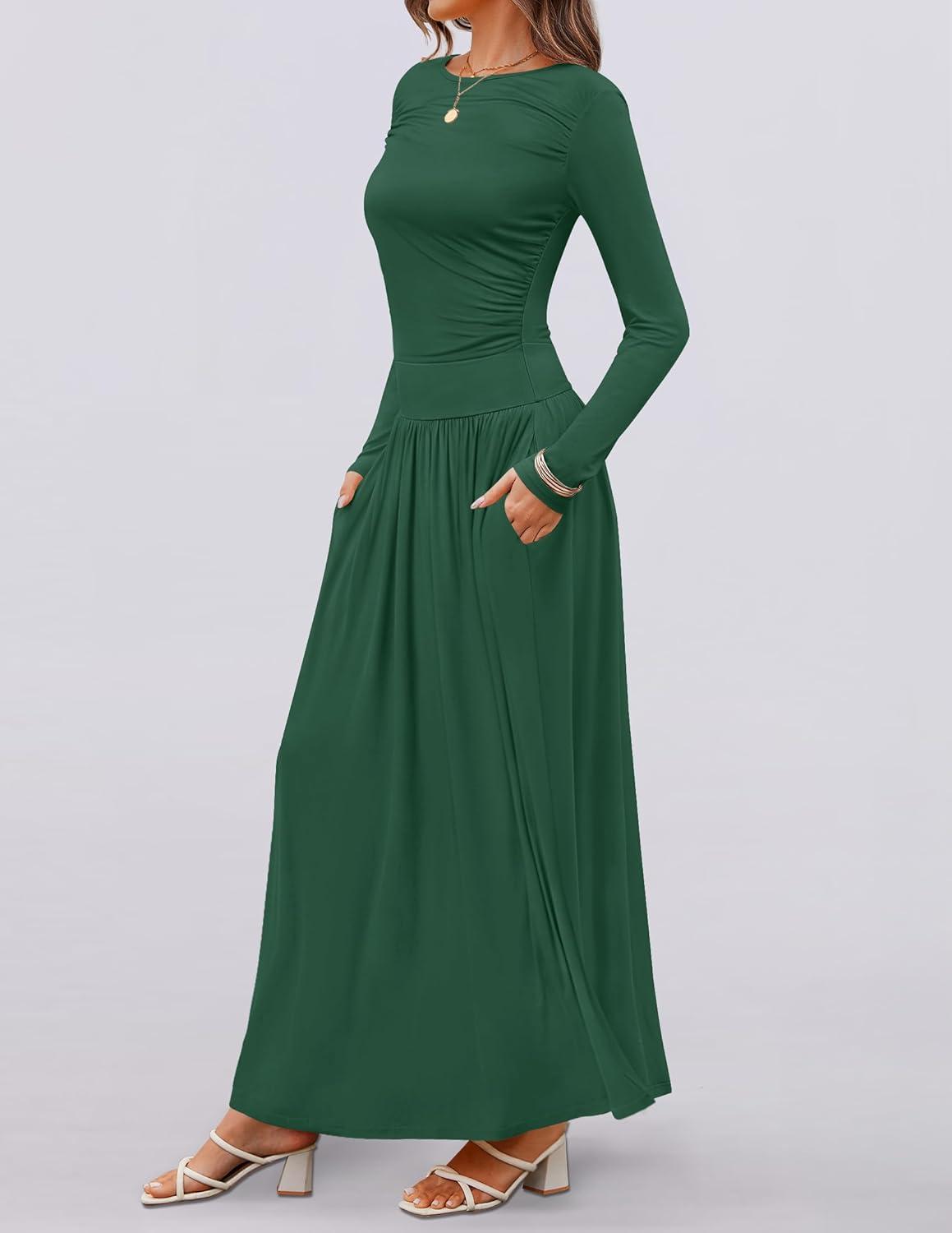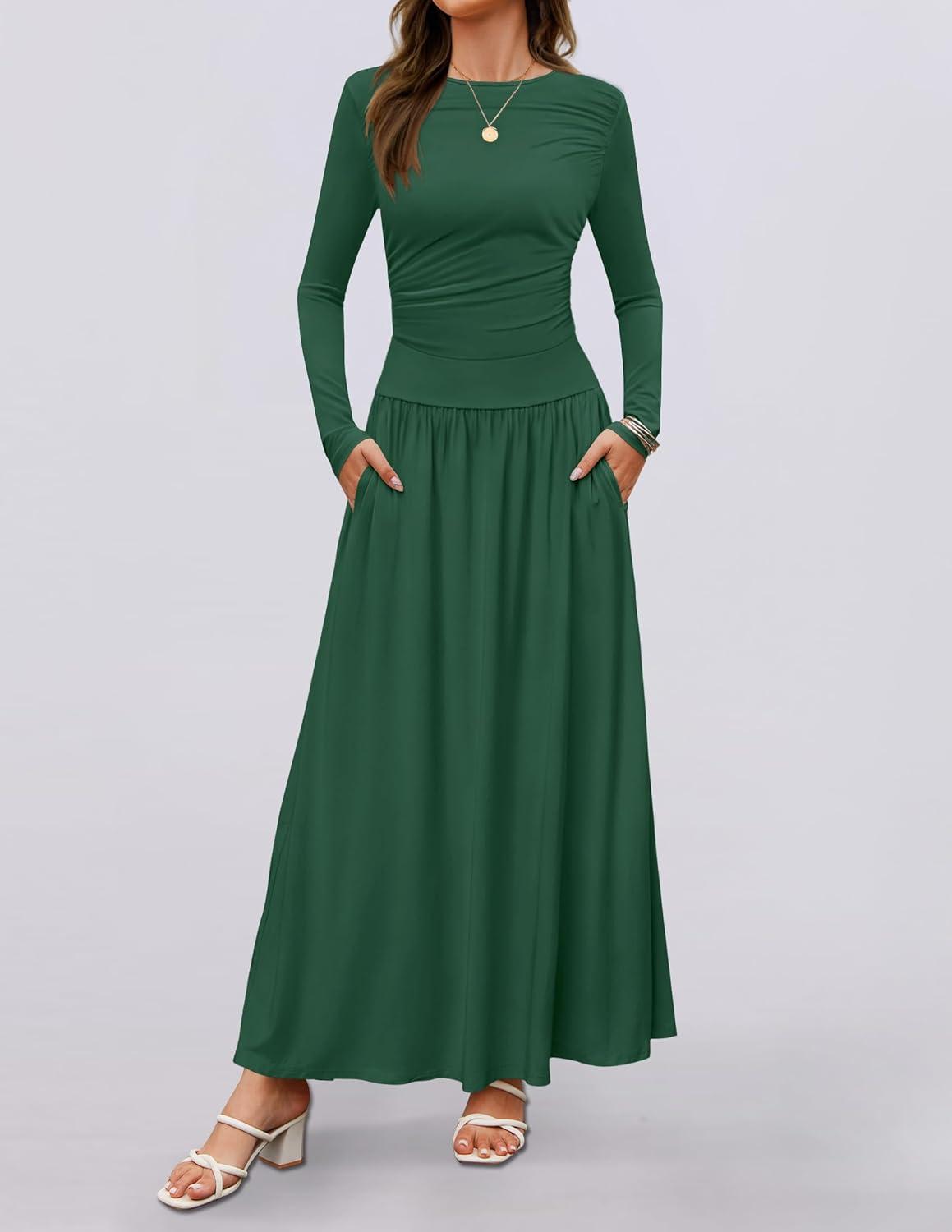 ZESICA Women’s Long Sleeve Fall Maxi Dress 2025 Crewneck Knit Casual Slim Swing Pleated Dresses with Pockets(Dark Green)