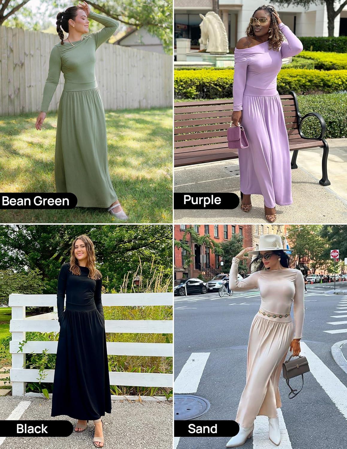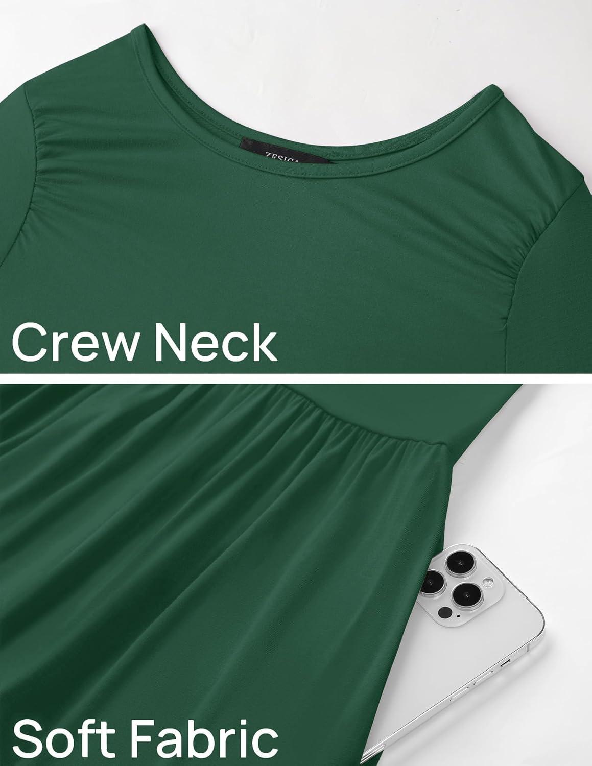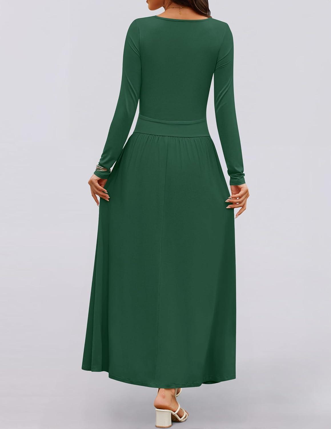 ZESICA Women’s Long Sleeve Fall Maxi Dress 2025 Crewneck Knit Casual Slim Swing Pleated Dresses with Pockets(Dark Green)