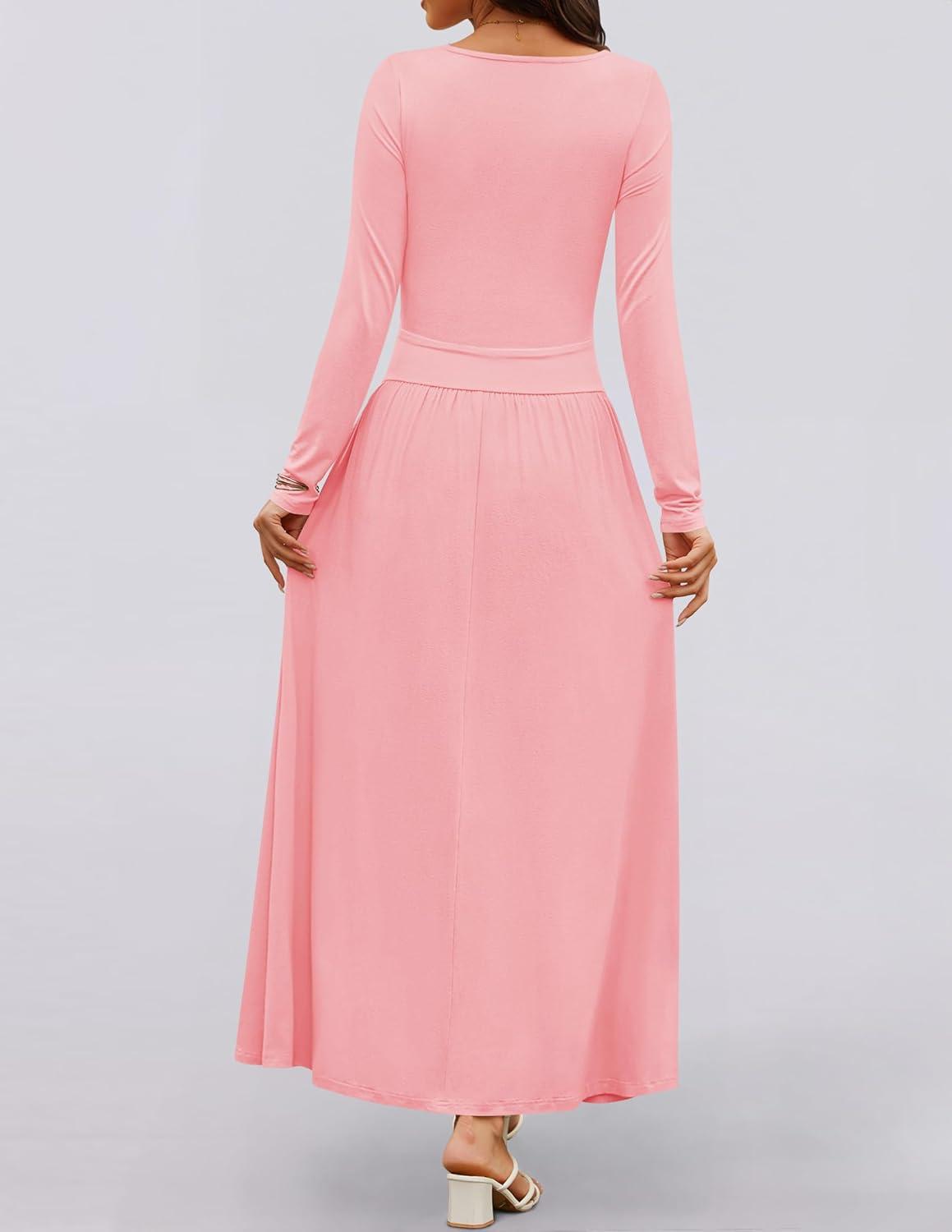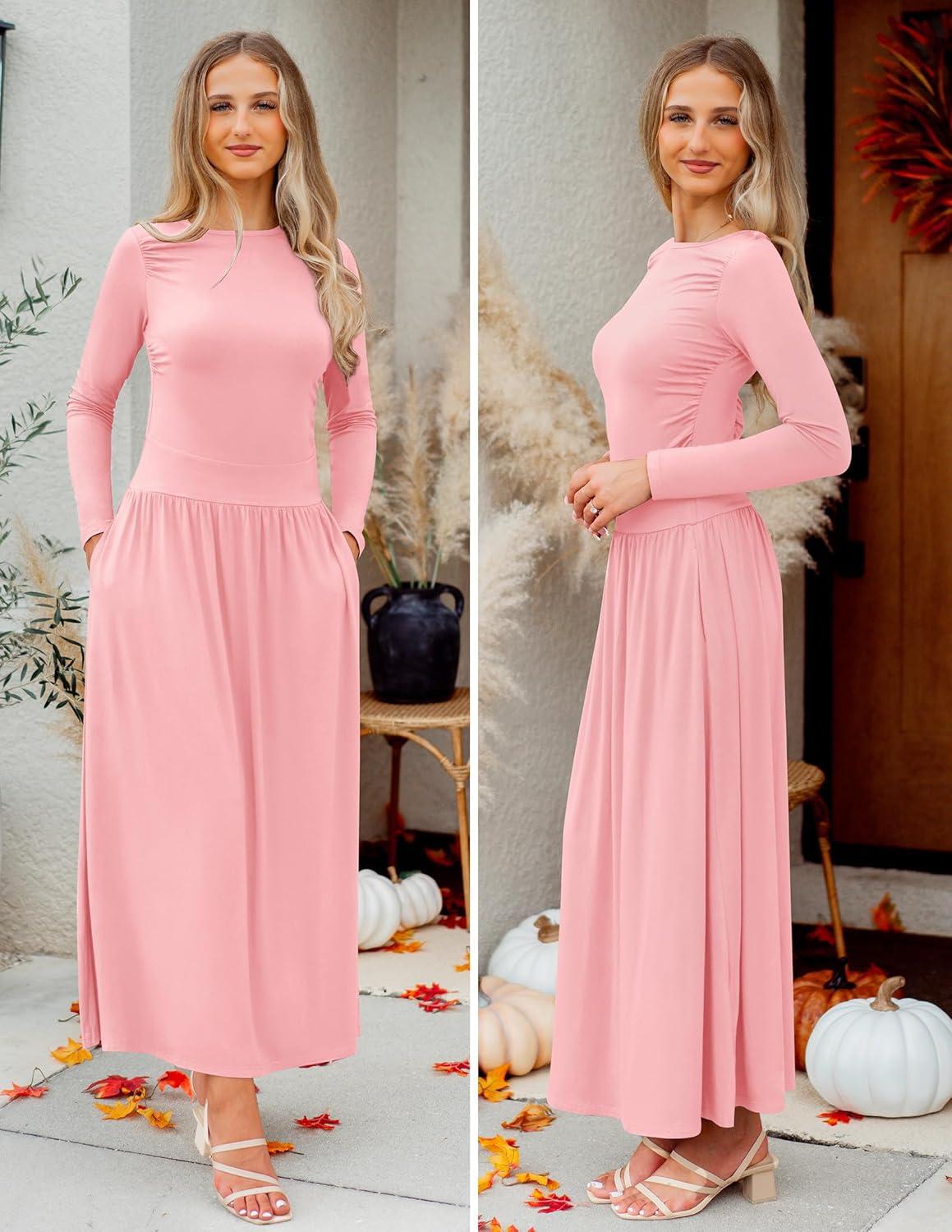 ZESICA Women’s Long Sleeve Fall Maxi Dress 2025 Crewneck Knit Casual Slim Swing Pleated Dresses with Pockets(Pink)