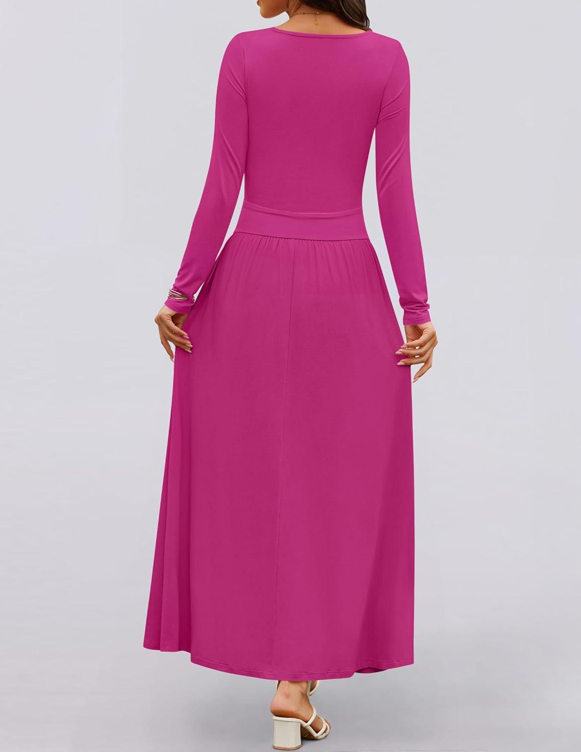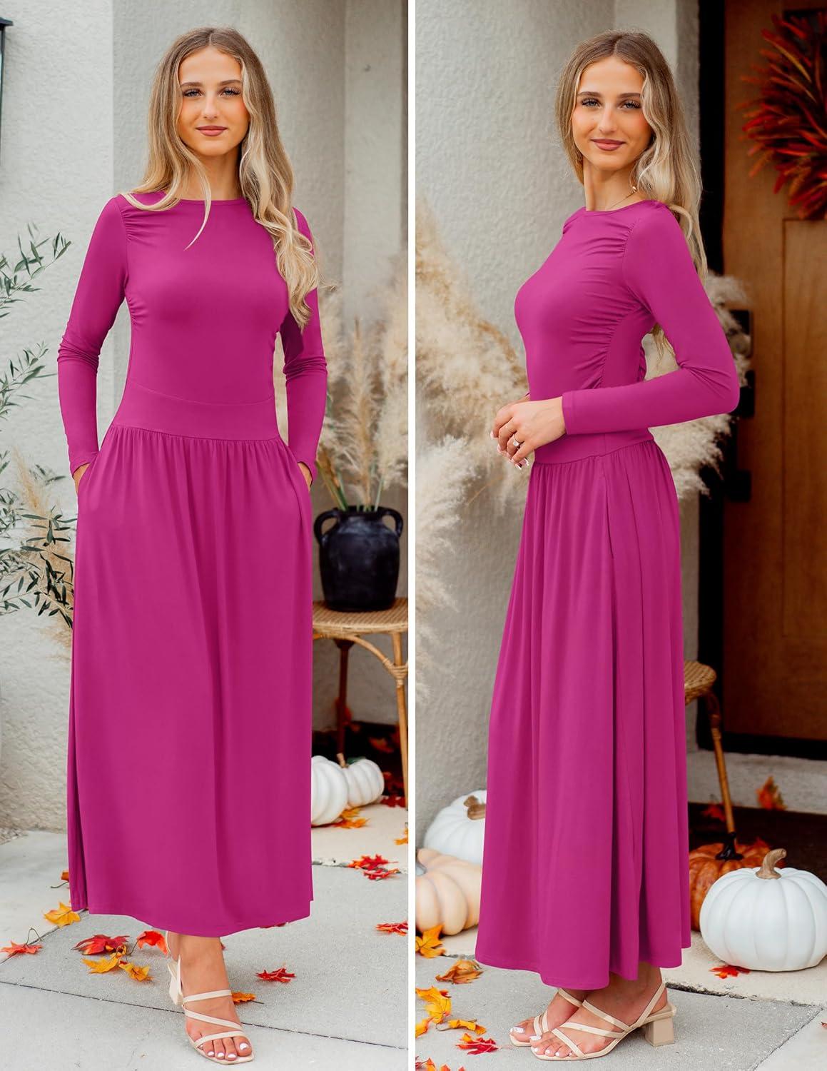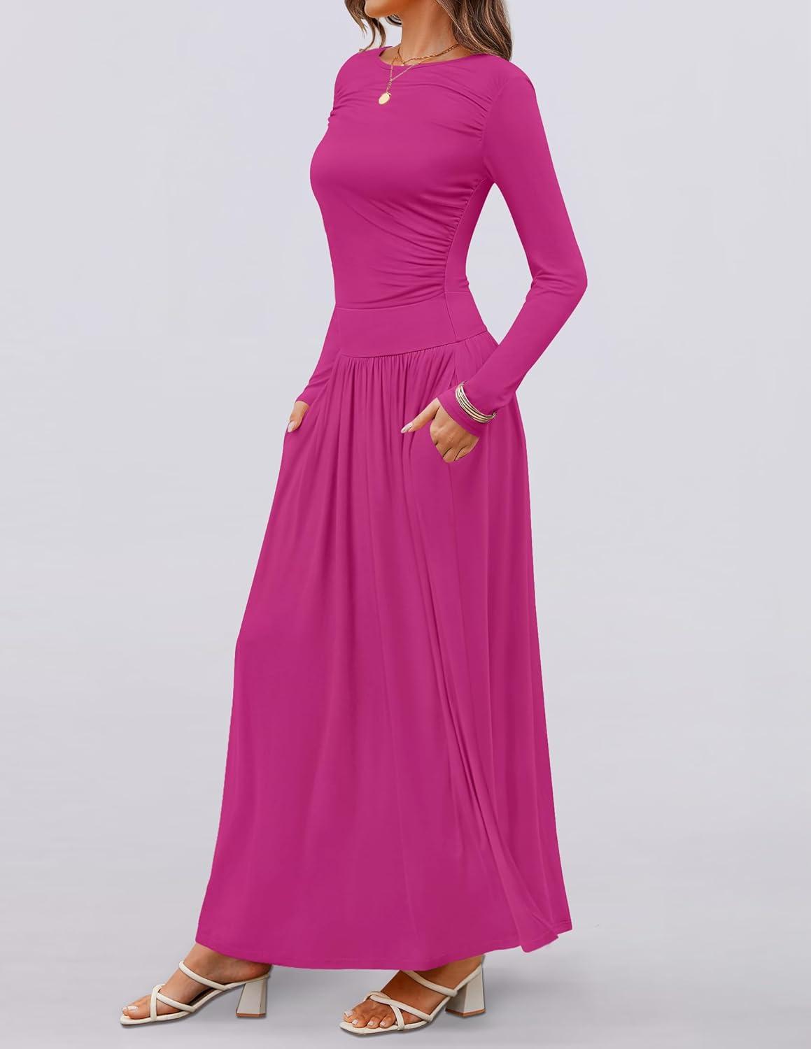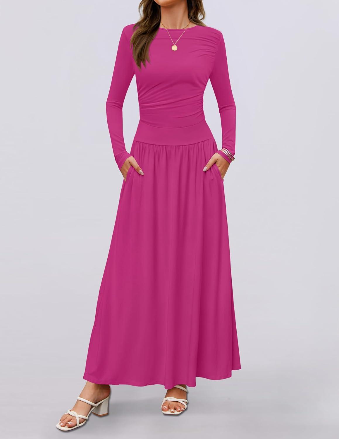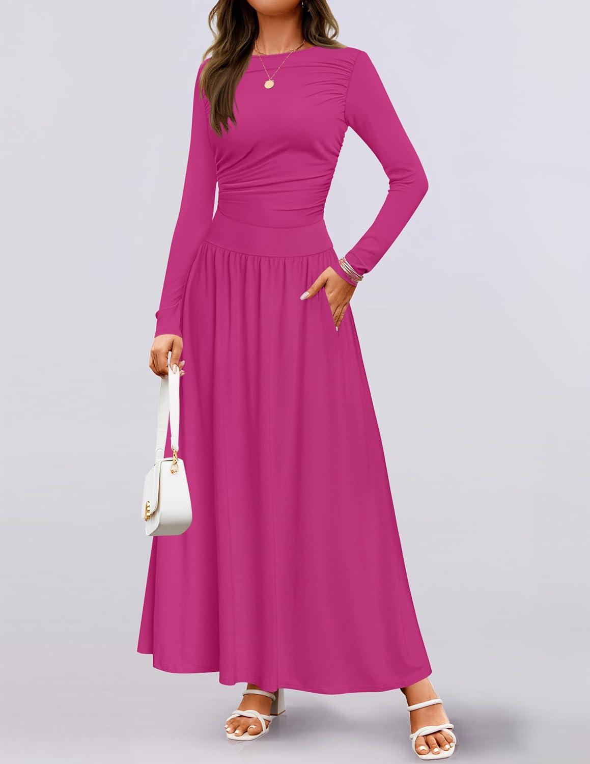 ZESICA Women’s Long Sleeve Fall Maxi Dress 2025 Crewneck Knit Casual Slim Swing Pleated Dresses with Pockets(Rose)