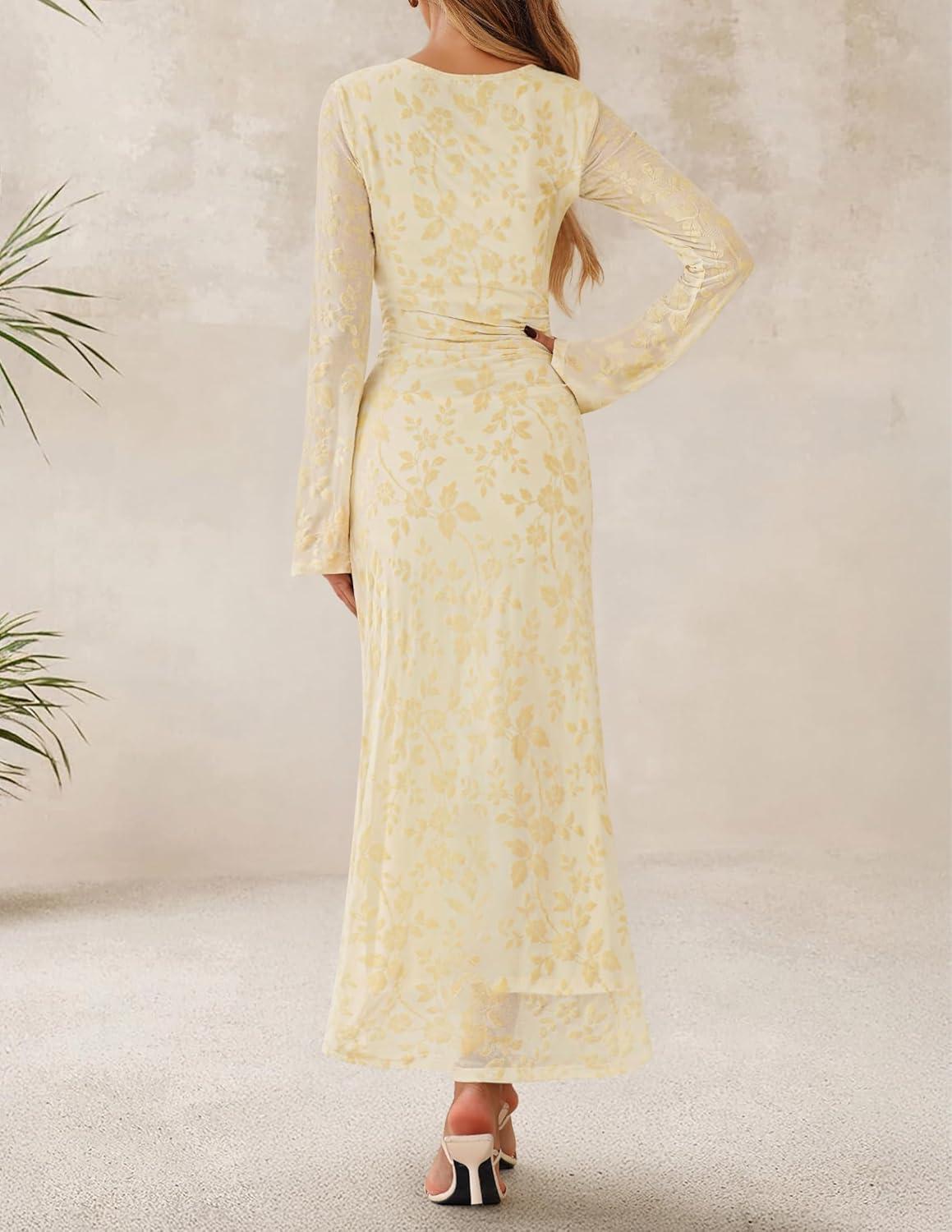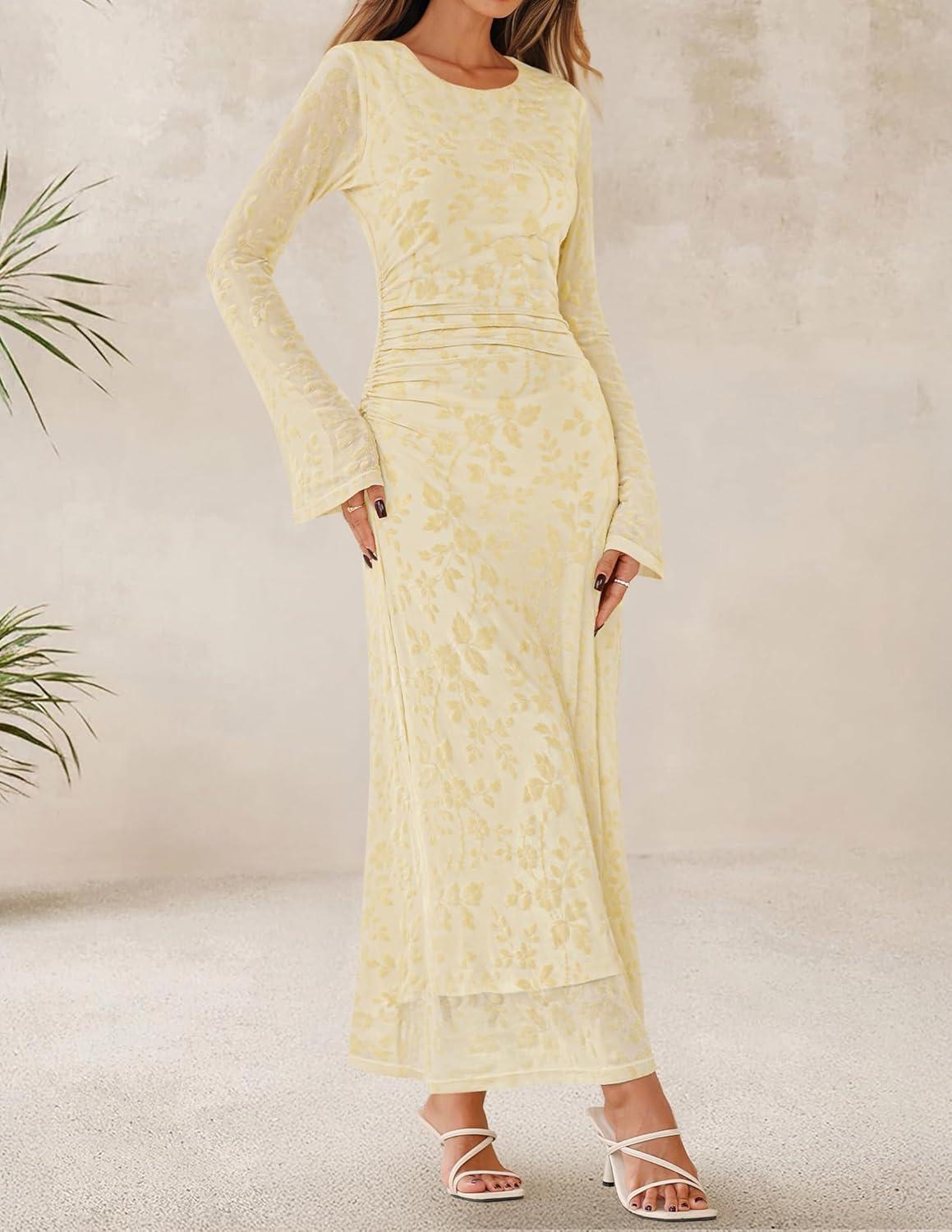 ZESICA Women’s Long Sleeve Floral Bodycon Dress 2025 Fall Fashion Ruched Mesh Wedding Guest Cocktail Party Maxi Dresses(Beige Yellow)