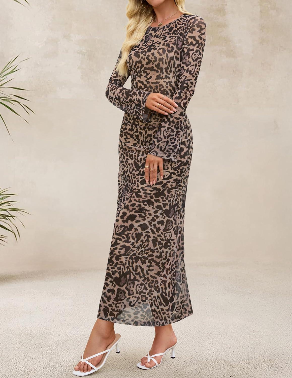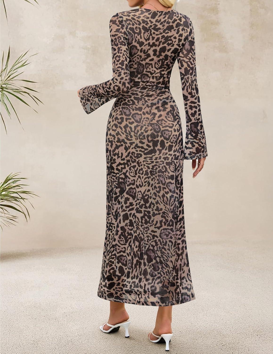 ZESICA Women’s Long Sleeve Floral Bodycon Dress 2025 Fall Fashion Ruched Mesh Wedding Guest Cocktail Party Maxi Dresses(Leopard)